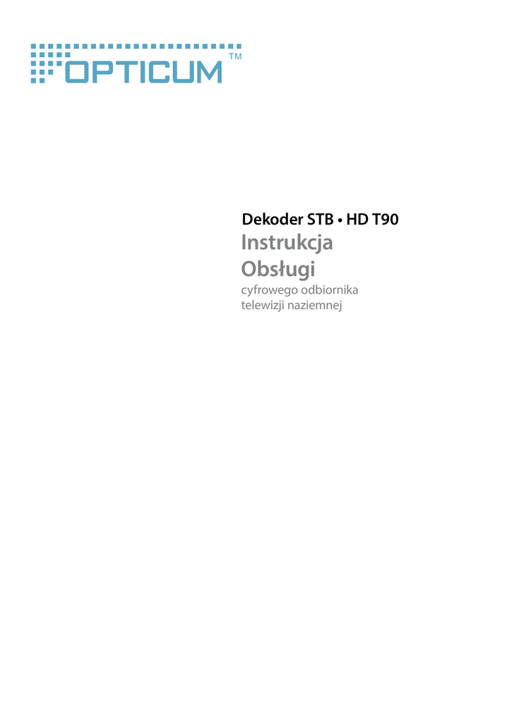 Dekoder STB • HD T90 Instrukcja Obsługi cyfrowego odbiornika telewizji naziemnej Spis treści Rozdział1 W skrócie . . . . . . . . . . . . . . . . . . . . . . . . . . 4 1.1 Przegląd. . . . . . . . . . . . . . . . . . . . . . . . . . . . . . . . . . . . . . . . . . . . . . . . . 1.2 Zawartość zestawu . . . . . . . . . . . . . . . . . . . . . . . . . . . . . . . . . . . . . . 1.3 Przedni panel. . . . . . . . . . . . . . . . . . . . . . . . . . . . . . . . . . . . . . . . . . . . 1.4 Panel tylni. . . . . . . . . . . . . . . . . . . . . . . . . . . . . . . . . . . . . . . . . . . . . . . 1.5 Pilot zdalnego sterowania. . . . . . . . . . . . . . . . . . . . . . . . . . . . . . . . 4 4 5 5 6 Rozdział2 Instalacja. . . . . . . . . . . . . . . . . . . . . . . . . . . 8 2.1 Podłączenie . . . . . . . . . . . . . . . . . . . . . . . . . . . . . . . . . . . . . . . . . . . . . 8 2.2 Pierwsze uruchomienie. . . . . . . . . . . . . . . . . . . . . . . . . . . . . . . . . . 9 2.3 Pierwsze skanowanie. . . . . . . . . . . . . . . . . . . . . . . . . . . . . . . . . . . 10 2.4 Automatyczne wyłączanie odbiornika. . . . . . . . . . . . . . . . . . . 11 2.5 Praca z zewnętrznym napędem USB. . . . . . . . . . . . . . . . . . . . . 11 2.6 Zewnętrzne zasilanie anteny . . . . . . . . . . . . . . . . . . . . . . . . . . . . 11 Rozdział3 Działanie. . . . . . . . . . . . . . . . . . . . . . . . . . 12 3.1 Szybki przewodnik. . . . . . . . . . . . . . . . . . . . . . . . . . . . . . . . . . . . . . 12 3.2 Zmiana kanałów. . . . . . . . . . . . . . . . . . . . . . . . . . . . . . . . . . . . . . . . 12 3.3 Timer uśpienia. . . . . . . . . . . . . . . . . . . . . . . . . . . . . . . . . . . . . . . . . . 13 3.4 Pasek informacji. . . . . . . . . . . . . . . . . . . . . . . . . . . . . . . . . . . . . . . . 13 3.5 EPG (Elektroniczny przewodnik po programach) . . . . . . . . . 13 3.6 TIMER. . . . . . . . . . . . . . . . . . . . . . . . . . . . . . . . . . . . . . . . . . . . . . . . . . 15 3.7 Kanały radiowe. . . . . . . . . . . . . . . . . . . . . . . . . . . . . . . . . . . . . . . . . 15 3.8 Znajdź . . . . . . . . . . . . . . . . . . . . . . . . . . . . . . . . . . . . . . . . . . . . . . . . . 16 3.9 Napisy. . . . . . . . . . . . . . . . . . . . . . . . . . . . . . . . . . . . . . . . . . . . . . . . . . 16 3.10 AUDIO. . . . . . . . . . . . . . . . . . . . . . . . . . . . . . . . . . . . . . . . . . . . . . . . .16 3.11 Teletext. . . . . . . . . . . . . . . . . . . . . . . . . . . . . . . . . . . . . . . . . . . . . . . .16 3.12 PVR — nagrywanie programów. . . . . . . . . . . . . . . . . . . . . . . . 17 3.13 Time Shift . . . . . . . . . . . . . . . . . . . . . . . . . . . . . . . . . . . . . . . . . . . . . 19 2 Rozdział4 Menu. . . . . . . . . . . . . . . . . . . . . . . . . . . . . 20 4.1 Główne menu . . . . . . . . . . . . . . . . . . . . . . . . . . . . . . . . . . . . . . . . . . 4.2 Edycja programów. . . . . . . . . . . . . . . . . . . . . . . . . . . . . . . . . . . . . . 4.3 Instalacja. . . . . . . . . . . . . . . . . . . . . . . . . . . . . . . . . . . . . . . . . . . . . . . 4.4 Ustawienia systemowe. . . . . . . . . . . . . . . . . . . . . . . . . . . . . . . . . . 4.5 Różne. . . . . . . . . . . . . . . . . . . . . . . . . . . . . . . . . . . . . . . . . . . . . . . . . . 4.6 Gry. . . . . . . . . . . . . . . . . . . . . . . . . . . . . . . . . . . . . . . . . . . . . . . . . . . . . 4.7 Ustawienia nagrywania. . . . . . . . . . . . . . . . . . . . . . . . . . . . . . . . . 20 20 22 23 26 30 30 Rozdział5 Rozwiązywanie problemów. . . . . . . . 32 Rozdział6 Środki bezpieczeństwa . . . . . . . . . . . . 34 Rozdział7 Ochrona środowiska. . . . . . . . . . . . . . . 36 Rozdział8 Specyfikacja techniczna . . . . . . . . . . . 37 Contents 3 1 W skrócie Przeczytaj ten rozdział aby poznać cechy Opticum HD T90 and Dekoder STB, działanie pilota oraz więcej. 1.1 Przegląd 1. Wsparcie SD/HD (MPEG2/MPEG4, H.264), DVB-T, 2. PVR Ready - możliwość nagrywania na zewnętrznym napędzie USB, 3. Time Shift (zatrzymywanie odtwarzania i przewijanie), 4. Wyjście video HDMI, 5. Niski pobór mocy w trybie Standby, 6. Automatyczny tryb Standby, 7. Elektroniczny przewodnik po programach - EPG, 8. Wielojęzyczne menu, w tym polski. 1.2 Zawartość zestawu 1. 2. 3. 4. Odbiornik, Pilot zdalnego sterowania, Baterie — 2 x AAA (opcjonalnie), Instrukcja Szybkiego Startu. ENGLISH ENGLISH ENGLISH ENGLISH ENGLISH ENGLISH ENGLISH ENGLISH ENGLISH ENGLISH ENGLISH ENGLISH ENGLISH ENGLISH ENGLISH ENGLISH ENGLISH ENGLISH ENGLISH ENGLISH ENGLISH ENGLISH ENGLISH ENGLISH ENGLISH ENGLISH ENGLISH ENGLISH ENGLISH ENGLISH ENGLISH ENGLISH ENGLISH ENGLISH ENGLISH ENGLISH ENGLISH ENGLISH Quick Start Digital Terrestial Receiver • Slot for Smart Card • Support of SD/HD (MPEG2 / MPEG4) DVB-C systems • High definition video output - HDMI • Standard resolution video output - SCART • High speed USB 2.0 port • PVR Ready • Time Shift (pause, rewind) • Automatic Stand-by • Low power consumption in Stand-by mode, below 1W • Multilingual menu, including English • Electronic Program Guide - EPG • 4 digit LED display on front panel • Multimedia Player Full HD 1080p ModelID: X2 KP 07/2012 ENGLISH ENGLISH ENGLISH ENGLISH ENGLISH ENGLISH ENGLISH ENGLISH ENGLISH ENGLISH ENGLISH ENGLISH ENGLISH ENGLISH ENGLISH ENGLISH ENGLISH ENGLISH ENGLISH ENGLISH ENGLISH ENGLISH ENGLISH ENGLISH ENGLISH ENGLISH ENGLISH ENGLISH ENGLISH ENGLISH ENGLISH ENGLISH ENGLISH ENGLISH ENGLISH ENGLISH ENGLISH ENGLISH 4 1.3 Przedni panel HD T90 dioda LED włączony/sygnał zmiana kanału/ ruch kursorem wyświetlacz LED włącznik Dekoder STB dioda LED włączony/odbiór zmiana kanału/ ruch kursorem włącznik 1.4 Panel tylni wejście cyfrowy anteny S/PDIF wyjście anteny W skrócie wejście USB wejście HDMI wyjście audio R+L wejście TV SCART przewód zasilający 5 1.5 Pilot zdalnego sterowania 6 PrzyciskFunkcja POWER - Włącz/wyłącz 