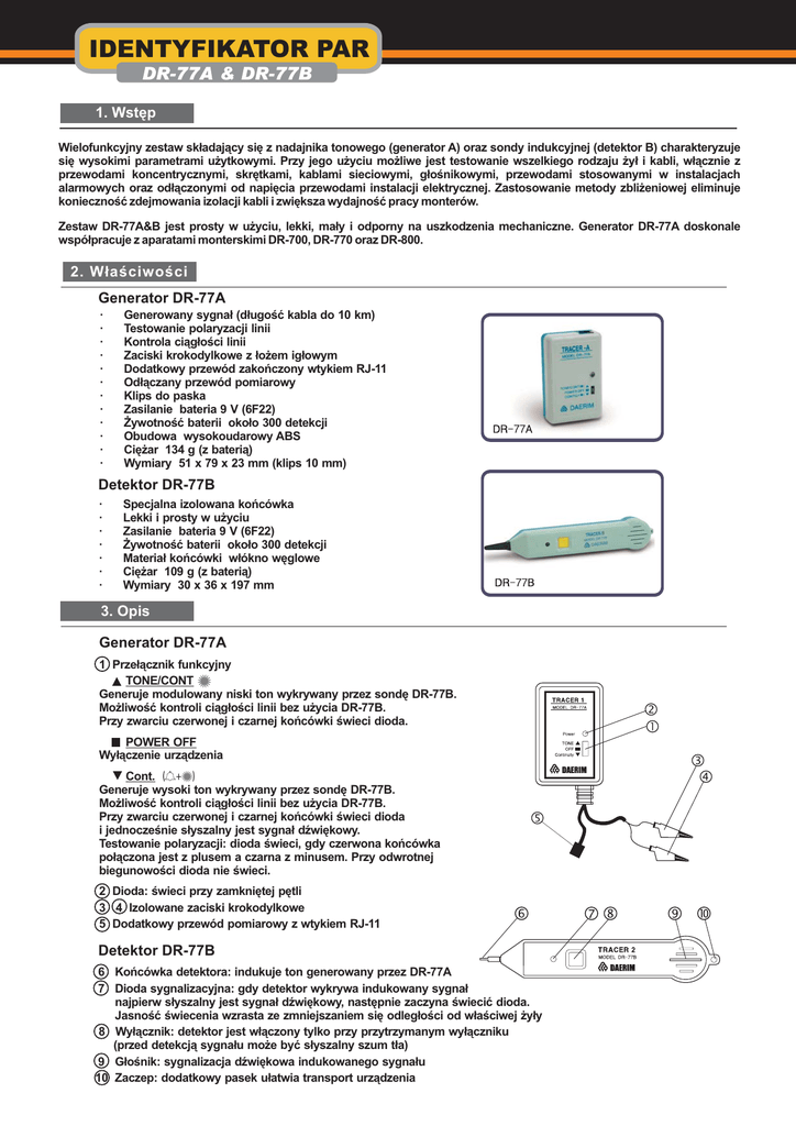 IDENTYFIKATOR PAR 1. Wstêp Wielofunkcyjny zestaw sk³adaj¹cy siê z nadajnika tonowego (generator A) oraz sondy indukcyjnej (detektor B) charakteryzuje siê wysokimi parametrami u¿ytkowymi. Przy jego u¿yciu mo¿liwe jest testowanie wszelkiego rodzaju ¿y³ i kabli, w³¹cznie z przewodami koncentrycznymi, skrêtkami, kablami sieciowymi, g³oœnikowymi, przewodami stosowanymi w instalacjach alarmowych oraz od³¹czonymi od napiêcia przewodami instalacji elektrycznej. Zastosowanie metody zbli¿eniowej eliminuje koniecznoœæ zdejmowania izolacji kabli i zwiêksza wydajnoœæ pracy monterów. Zestaw DR-77A&B jest prosty w u¿yciu, lekki, ma³y i odporny na uszkodzenia mechaniczne. Generator DR-77A doskonale wspó³pracuje z aparatami monterskimi DR-700, DR-770 oraz DR-800. 2. W³aœciwoœci Generator DR-77A · · · · · · · · · · · · Generowany sygna³ (d³ugoœæ kabla do 10 km) Testowanie polaryzacji linii Kontrola ci¹g³oœci linii Zaciski krokodylkowe z ³o¿em ig³owym Dodatkowy przewód zakoñczony wtykiem RJ-11 Od³¹czany przewód pomiarowy Klips do paska Zasilanie bateria 9 V (6F22) ¯ywotnoœæ baterii oko³o 300 detekcji Obudowa wysokoudarowy ABS Ciê¿ar 134 g (z bateri¹) Wymiary 51 x 79 x 23 mm (klips 10 mm) Detektor DR-77B · · · · · · · Specjalna izolowana koñcówka Lekki i prosty w u¿yciu Zasilanie bateria 9 V (6F22) ¯ywotnoœæ baterii oko³o 300 detekcji Materia³ koñcówki w³ókno wêglowe Ciê¿ar 109 g (z bateri¹) Wymiary 30 x 36 x 197 mm 3. Opis Generator DR-77A 1 Prze³¹cznik funkcyjny TONE/CONT Generuje modulowany niski ton wykrywany przez sondê DR-77B. Mo¿liwoœæ kontroli ci¹g³oœci linii bez u¿ycia DR-77B. Przy zwarciu czerwonej i czarnej koñcówki œwieci dioda. POWER OFF Wy³¹czenie urz¹dzenia Cont. Generuje wysoki ton wykrywany przez sondê DR-77B. Mo¿liwoœæ kontroli ci¹g³oœci linii bez u¿ycia DR-77B. Przy zwarciu czerwonej i czarnej koñcówki œwieci dioda i jednoczeœnie s³yszalny jest sygna³ dŸwiêkowy. Testowanie polaryzacji: dioda œwieci, gdy czerwona koñcówka po³¹czona jest z plusem a czarna z minusem. Przy odwrotnej biegunowoœci dioda nie œwieci. 2 Dioda: œwieci przy zamkniêtej pêtli 3 4 Izolowane zaciski krokodylkowe 5 Dodatkowy przewód pomiarowy z wtykiem RJ-11 Detektor DR-77B 6 Koñcówka detektora: indukuje ton generowany przez DR-77A 7 Dioda sygnalizacyjna: gdy detektor wykrywa indukowany sygna³ najpierw s³yszalny jest sygna³ dŸwiêkowy, nastêpnie zaczyna œwieciæ dioda. Jasnoœæ œwiecenia wzrasta ze zmniejszaniem siê odleg³oœci od w³aœciwej ¿y³y 8 Wy³¹cznik: detektor jest w³¹czony tylko przy przytrzymanym wy³¹czniku (przed detekcj¹ sygna³u mo¿e byæ s³yszalny szum t³a) 9 G³oœnik: sygnalizacja dŸwiêkowa indukowanego sygna³u 10 Zaczep: dodatkowy pasek u³atwia transport urz¹dzenia 4. U¿ytkowanie A. Te s t c i ¹ g ³ o œ c i l i n i i ( p r z y u ¿ y c i u D R - 7 7 A o r a z DR-77B) Zestaw DR-77A/B umo¿liwia precyzyjne œledzenie ¿y³ oraz identyfikacjê szukanej pary w wi¹zce przewodów A. Pod³¹czyæ koñcówki DR-77A do odpowiednich przewodów (mo¿na wykorzystaæ dodatkowy przewód z wtykiem modularnym) B. Ustawiæ prze³¹cznik DR-77A w pozycji TONE/CONT C. Przesuwaæ koñcówkê detektora DR-77B wokó³ kolejnych przewodów w wi¹zce D. Gdy koñcówka sondy indukcyjnej (detektora) zbli¿a siê do w³aœciwego przewodu s³yszalny jest sygna³ dŸwiêkowy E. Przy minimalnej odleg³oœci od w³aœciwego przewodu zaczyna œwieciæ dioda i wzrasta g³oœnoœæ sygna³u dŸwiêkowego ACJA UNIK KOM TELE B. Te s t c i ¹ g ³ o œ c i l i n i i ( t y l k o D R - 7 7 A ) Testowanie linii z wykorzystaniem samego generatora A. Ustawiæ prze³¹cznik DR-77A w pozycji CONT B. Po³¹czyæ jeden zacisk przewodu pomiarowego z ¿y³¹ pe³ni¹c¹ funkcjê ¿y³y referencyjnej C. Po³¹czyæ drugi zacisk z testowanym przewodem D. Na drugim koñcu wi¹zki przewodów zwieraæ ¿y³ê referencyjn¹ z testowanym przewodem. Przy zamkniêtej pêtli s³yszalny jest sygna³ dŸwiêkowy i œwieci dioda. Jednoczeœnie mo¿na nawi¹zaæ komunikacjê g³osow¹ za pomoc¹ telefonów monterskich DR-700, DR-770 lub DR-800 C. Kontrola polaryzacji ( t y l k o D R - 7 7 A ) Prosty test polaryzacji za pomoc¹ samego generatora A. Ustawiæ prze³¹cznik DR-77A w pozycji CONT B. Po³¹czyæ czerwony zacisk z dodatnim biegunem linii zaœ czarny z ujemnym. Jeœli biegunowoœæ nie jest znana pod³¹czyæ zaciski do obydwu przewodów pary C. Przy w³aœciwej polaryzacji s³yszalny jest sygna³ dŸwiêkowy i œwieci dioda. Przy odwrotnej polaryzacji brak jest sygnalizacji D. Inne funkcje ( t y l k o D R - 7 7 A ) Proste testy stanu linii (przerwa, zwarcie) z wykorzystaniem samego generatora DR-77A A. Ustawiæ prze³¹cznik g³ówny DR-77A w pozycji TONE/CONT B. Pod³¹czyæ zaciski przewodu pomiarowego do obydwu przewodów linii. Œwiecenie diody (bez wzglêdu na jej jasnoœæ) œwiadczy o istnieniu pewnej rezystancji pomiêdzy przewodami (w przypadku przerwy dioda nie œwieci) C. Gdy dioda œwieci s³abym œwiat³em rezystancja wynosi ok. 100 kOhm D. Jasne œwiecenie diody oznacza rezystancjê 0 Ohm (zwarcie) Uwagi Po zakoñczeniu pracy z zestawem DR-77A&B nale¿y upewniæ siê, czy zosta³ on wy³¹czony. W przeciwnym przypadku mo¿e dojœæ do przedwczesnego zu¿ycia baterii. Nie wolno testowaæ znajduj¹cych siê pod napiêciem przewodów pr¹du zmiennego, poniewa¿ grozi to powa¿nym szkodzeniem sprzêtu!