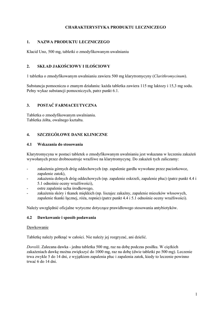 CHARAKTERYSTYKA PRODUKTU LECZNICZEGO 1. NAZWA PRODUKTU LECZNICZEGO Klacid Uno, 500 mg, tabletki o zmodyfikowanym uwalnianiu 2. SKŁAD JAKOŚCIOWY I ILOŚCIOWY 1 tabletka o zmodyfikowanym uwalnianiu zawiera 500 mg klarytromycyny (Clarithromycinum). Substancja pomocnicza o znanym działaniu: każda tabletka zawiera 115 mg laktozy i 15,3 mg sodu. Pełny wykaz substancji pomocniczych, patrz punkt 6.1. 3. POSTAĆ FARMACEUTYCZNA Tabletka o zmodyfikowanym uwalnianiu. Tabletka żółta, owalnego kształtu. 4. SZCZEGÓŁOWE DANE KLINICZNE 4.1 Wskazania do stosowania Klarytromycyna w postaci tabletek o zmodyfikowanym uwalnianiu jest wskazana w leczeniu zakażeń wywołanych przez drobnoustroje wrażliwe na klarytromycynę. Do zakażeń tych zaliczamy: - zakażenia górnych dróg oddechowych (np. zapalenie gardła wywołane przez paciorkowce, zapalenie zatok), zakażenia dolnych dróg oddechowych (np. zapalenie oskrzeli, zapalenie płuc) (patrz punkt 4.4 i 5.1 odnośnie oceny wrażliwości), ostre zapalenie ucha środkowego, zakażenia skóry i tkanek miękkich (np. liszajec zakaźny, zapalenie mieszków włosowych, zapalenie tkanki łącznej, róża, ropnie) (patrz punkt 4.4 i 5.1 odnośnie oceny wrażliwości). Należy uwzględnić oficjalne wytyczne dotyczące prawidłowego stosowania antybiotyków. 4.2 Dawkowanie i sposób podawania Dawkowanie Tabletkę należy połknąć w całości. Nie należy jej rozgryzać, ani dzielić. Dorośli. Zalecana dawka - jedna tabletka 500 mg, raz na dobę podczas posiłku. W ciężkich zakażeniach dawkę można zwiększyć do 1000 mg, raz na dobę (dwie tabletki po 500 mg). Leczenie trwa zwykle 5 do 14 dni, z wyjątkiem zapalenia płuc i zapalenia zatok, kiedy to leczenie powinno trwać 6 do 14 dni. 1 Dzieci w wieku powyżej 12 lat. Dawkowanie jak u dorosłych. Dzieci w wieku poniżej 12 lat. Nie badano stosowania produktu Klacid Uno u dzieci poniżej 12 lat. U dzieci poniżej 12 lat zaleca się stosowanie produktu leczniczego Klacid w postaci zawiesiny doustnej. Pacjenci z niewydolnością nerek Klarytromycyny w postaci tabletek o zmodyfikowanym uwalnianiu nie należy stosować u pacjentów ze znaczną niewydolnością nerek (klirens kreatyniny poniżej 30 ml/min), ponieważ nie ma możliwości zmniejszenia dawki leku (tabletki nie można dzielić). U tych pacjentów należy stosować lek w postaci o natychmiastowym uwalnianiu (patrz punkt 4.3). U pacjentów z umiarkowaną niewydolnością nerek (klirens kreatyniny 30 do 60 ml/min), dawkę klarytromycyny należy zmniejszyć o połowę, tzn. maksymalnie do jednej tabletki produktu Klacid Uno raz na dobę. 4.3 Przeciwwskazania Nadwrażliwość na antybiotyki z grupy makrolidów lub na którąkolwiek substancję pomocniczą wymienioną w punkcie 6.1. Przeciwwskazane jest jednoczesne leczenie klarytromycyną i którymkolwiek z następujących produktów leczniczych: astemizol, cyzapryd, pimozyd, terfenadyna, ponieważ może to spowodować wydłużenie odstępu QT i zaburzenia rytmu serca takie, jak tachykardia komorowa, migotanie komór i komorowe zaburzenia rytmu serca typu torsade de pointes (patrz punkt 4.5). Przeciwwskazane jest jednoczesne podawanie klarytromycyny i alkaloidów sporyszu (np. ergotaminy lub dihydroergotaminy), ponieważ może to wywołać objawy zatrucia sporyszem (patrz punkt 4.5). Przeciwwskazane jest jednoczesne podawanie klarytromycyny i doustnych postaci midazolamu (patrz punkt 4.5). Nie należy podawać klarytromycyny pacjentom, u których w przeszłości występowało wydłużenie odstępu QT (wrodzone lub udokumentowane nabyte wydłużenie odstępu QT) lub komorowe zaburzenia rytmu serca, w tym torsade de pointes (patrz punkt 4.4 i 4.5). Nie należy podawać klarytromycyny pacjentom z hipokaliemią (ryzyko wydłużenia odstępu QT). Nie należy stosować klarytromycyny u pacjentów z ciężką niewydolnością wątroby współistniejącą z niewydolnością nerek. Nie należy podawać klarytromycyny jednocześnie z inhibitorami reduktazy HMG-CoA (statyny), które są w znacznym stopniu metabolizowane przez CYP3A4 (lowastatyna lub symwastatyna) ze względu na zwiększone ryzyko miopatii, w tym rabdomiolizy (patrz punkt 4.4). Klarytromycyny (podobnie jak innych silnych inhibitorów CYP3A4) nie należy stosować u pacjentów przyjmujących kolchicynę (patrz punkt 4.4 i 4.5). Przeciwwskazane jest jednoczesne stosowanie z tikagrelorem lub ranolazyną. Stosowanie klarytromycyny w postaci tabletek o zmodyfikowanym uwalnianiu jest przeciwwskazane u pacjentów z klirensem kreatyniny mniejszym niż 30 ml/min ze względu na brak możliwości zmniejszenia dawki leku (tabletki nie można dzielić). U tych pacjentów należy stosować klarytromycynę w postaci o natychmiastowym uwalnianiu. 2 4.4 Specjalne ostrzeżenia i środki ostrożności dotyczące stosowania Kobietom w ciąży, zwłaszcza w pierwszym trymestrze, lekarz nie powinien zalecać klarytromycyny bez wnikliwej oceny, czy korzyść dla matki przeważa nad zagrożeniem dla płodu. Długotrwałe stosowanie może, jak w przypadku innych antybiotyków, spowodować rozwój niewrażliwych bakterii i grzybów. W razie wystąpienia nadkażenia należy rozpocząć odpowiednie leczenie. Należy zachować ostrożność podczas stosowania klarytromycyny u pacjentów z ciężką niewydolnością nerek. Podczas stosowania klarytromycyny notowano zaburzenia czynności wątroby, w tym zwiększenie aktywności enzymów wątrobowych oraz miąższowe i (lub) cholestatyczne zapalenie wątroby z żółtaczką lub bez. Takie zaburzenie czynności wątroby może być ciężkie i jest na ogół przemijające. W niektórych przypadkach notowano niewydolność wątroby prowadzącą do zgonu. Na ogół było to związane z poważnymi chorobami podstawowymi i (lub) stosowanymi równocześnie lekami. Należy poinformować pacjenta, że należy natychmiast przerwać przyjmowanie leku i zgłosić się do lekarza, jeśli wystąpią objawy przedmiotowe lub podmiotowe 