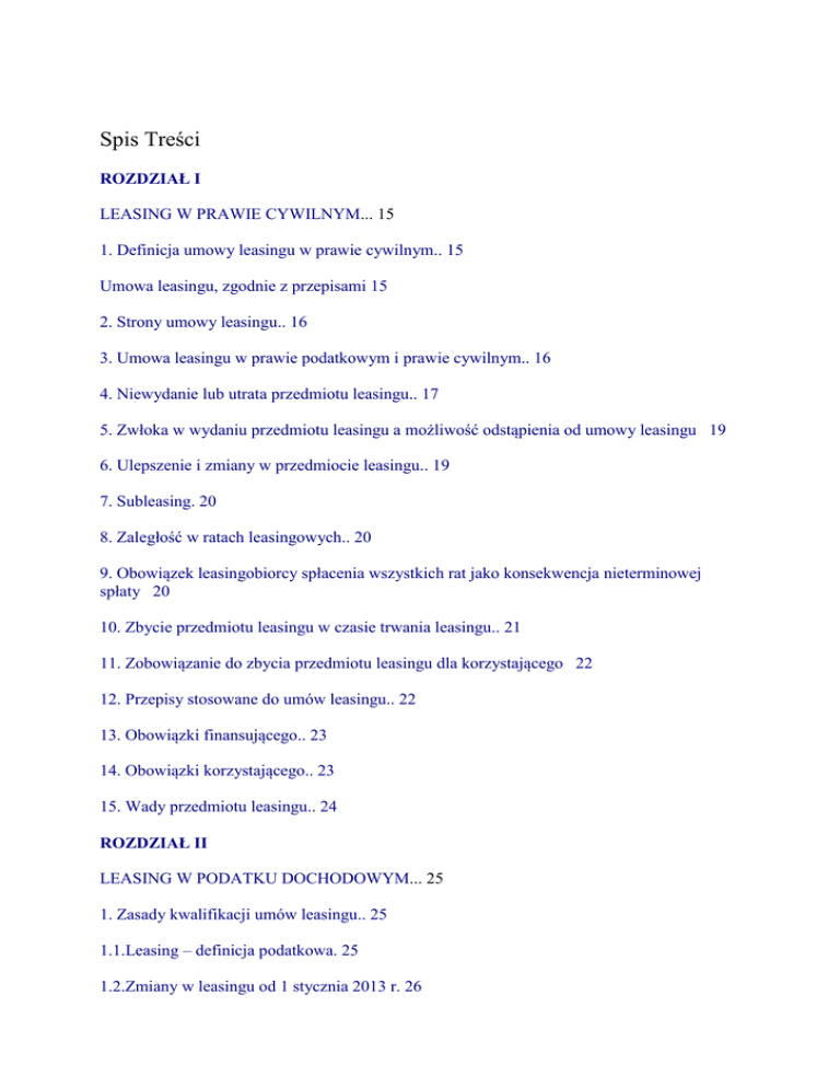 Spis Treści ROZDZIAŁ I LEASING W PRAWIE CYWILNYM... 15 1. Definicja umowy leasingu w prawie cywilnym.. 15 Umowa leasingu, zgodnie z przepisami 15 2. Strony umowy leasingu.. 16 3. Umowa leasingu w prawie podatkowym i prawie cywilnym.. 16 4. Niewydanie lub utrata przedmiotu leasingu.. 17 5. Zwłoka w wydaniu przedmiotu leasingu a możliwość odstąpienia od umowy leasingu 19 6. Ulepszenie i zmiany w przedmiocie leasingu.. 19 7. Subleasing. 20 8. Zaległość w ratach leasingowych.. 20 9. Obowiązek leasingobiorcy spłacenia wszystkich rat jako konsekwencja nieterminowej spłaty 20 10. Zbycie przedmiotu leasingu w czasie trwania leasingu.. 21 11. Zobowiązanie do zbycia przedmiotu leasingu dla korzystającego 22 12. Przepisy stosowane do umów leasingu.. 22 13. Obowiązki finansującego.. 23 14. Obowiązki korzystającego.. 23 15. Wady przedmiotu leasingu.. 24 ROZDZIAŁ II LEASING W PODATKU DOCHODOWYM... 25 1. Zasady kwalifikacji umów leasingu.. 25 1.1.Leasing – definicja podatkowa. 25 1.2.Zmiany w leasingu od 1 stycznia 2013 r. 26 1.3.Rzeczywista i hipotetyczna wartość netto przedmiotu leasingu. 27 1.4.Wariant I umów leasingowych. 30 1.5.Wariant II umów leasingowych. 32 1.6.Pozostałe umowy leasingu. 34 1.7.Strony umowy leasingu. 34 1.8.Przedmiot umowy leasingu. 35 1.8.1.Środki trwałe. 36 1.8.2.Wartości niematerialne i prawne. 38 1.8.3.Używane towary przedmiotem leasingu. 40 1.8.4.Składniki o wartości do 3.500 zł 40 1.8.5.Odpłatne korzystanie z mienia przedsiębiorstwa. 41 1.8.6.Prawo wieczystego użytkowania gruntu. 41 1.9.Spłata wartości początkowej przedmiotu umowy. 42 1.10.Spłata wartości początkowej umowy a ponowny leasing. 44 1.11.Zróżnicowana wysokość rat leasingowych. 46 1.12.Suma opłat leasingowych. 47 1.13.Depozyt a suma opłat 48 1.14.Kaucje gwarancyjne. 50 1.15.Kaucja związana z umową leasingową. 50 1.16.Leasing finansowy i operacyjny – tabela. 50 1.17.Odszkodowanie z tytułu wypowiedzenia umowy leasingu. 53 1.18.Skrócenie umowy leasingu a jej kwalifikacja. 54 2. Leasing finansowy.. 56 2.1.Warunki uznania umowy za leasing finansowy. 56 2.2.Rozliczenie umowy leasingu finansowego u finansującego. 56 2.3.Kolejna umowa leasingu finansowego a spłata wartości początkowej 61 2.4.Moment powstania przychodu wynikającego z różnicy pomiędzy częścią kapitałową leasingu a kosztami wytworzenia 64 2.5.Rozliczenie umowy leasingu finansowego u korzystającego. 65 2.6.Moment zaliczenia w koszty uzyskania przychodów rat leasingowych u podatników prowadzących podatkową księgę przychodów i rozchodów.. 70 2.7.Amortyzacja przedmiotu leasingu finansowego u korzystającego prowadzącego działalność gospodarczą 73 2.7.1.Zasady ogólne amortyzacji przez korzystającego. 73 2.7.2.Amortyzacja środków trwałych w leasingu finansowym a nieopłacone faktury 77 2.7.3.Leasing finansowy a szybka jednorazowa amortyzacja. 80 2.7.4.Specjalna jednorazowa amortyzacja środka trwałego używanego na podstawie umowy leasingu finansowego 82 2.7.5.Amortyzacja samochodu osobowego zaliczonego do środków trwałych wykorzystywanego również do celów prywatnych 84 2.8.Upływ podstawowego okresu umowy leasingu finansowego. 87 2.9.Sprzedaż przedmiotu leasingu korzystającemu po upływie okresu umowy 88 2.9.1.Skutki podatkowe u finansującego. 88 2.9.2.Skutki podatkowe u korzystającego. 91 2.10.Sprzedaż przedmiotu leasingu po zakończeniu umowy osobie trzeciej 92 2.11.Oddanie przedmiotu leasingu do dalszego używania. 96 2.12.Wygaśnięcie, rozwiązanie lub zmiana umowy. 97 3. Leasing operacyjny.. 98 3.1.Warunki uznania umowy za leasing operacyjny. 98 3.2.Zasady rozliczania umowy leasingu w podstawowym okresie. 99 3.3.Zakup opon przez finansującego a koszty uzyskania przychodów.. 101 3.4.Opłata wstępna a koszty uzyskania przychodów.. 105 3.4.1.Wstępna opłata leasingowa a forma prowadzenia ksiąg. 105 3.4.2.Wstępna opłata leasingowa kosztem w dacie poniesienia – wyrok NSA. 108 3.4.3.Moment zaliczenia do kosztów opłaty wstępnej ustalonej w umowie leasingu przez podatnika prowadzącego księgi rachunkowe 110 3.4.4.Wstępna opłata leasingowa w księgach rachunkowych w wyjaśnieniach Ministerstwa Finansów 113 3.4.5.Wstępna opłata leasingowa w wyrokach sądu administracyjnego. 114 3.4.6.Wstępna opłata leasingowa w podatkowej księdze przychodów i rozchodów 115 3.4.7.Wstępna opłata leasingowa w podatkowej księdze przychodów i rozchodów prowadzonej metodą memoriałową w wyjaśnieniach Ministerstwa Finansów.. 116 3.4.8.Wstępna opłata leasingowa u podatników prowadzących podatkową księgę przychodów i rozchodów metodą uproszczoną 117 3.4.9.Błędne rozliczanie opłaty wstępnej a korekta kosztów uzyskania przychodów 119 3.5.Raty miesięczne płatne z góry a moment zaliczenia w koszty uzyskania przychodów 120 3.6.Data ujęcia w koszty miesięcznych rat leasingowych. 123 3.7.Nieodliczony VAT a koszty uzyskania przychodów.. 124 3.8.Zasady opodatkowania leasingu, gdy finansujący korzysta ze zwolnienia w podatku dochodowym 125 3.9.Amortyzacja przedmiotu leasingu u finansującego. 129 3.9.1.Zasady amortyzacji u finansującego. 129 3.9.2.Amortyzacja środków trwałych przez finansującego a nieopłacone faktury od 1 stycznia 2013 r. 131 3.9.3.Amortyzacja u finansującego a wypowiedzenie umowy leasingu. 133 3.10.Upływ podstawowego okresu umowy leasingu operacyjnego. 135 3.11.Sprzedaż korzystającemu przedmiotu leasingu po zakończeniu podstawowego okresu umowy 136 3.12.Amortyzacja przedmiotu leasingu po wykupie przez korzystającego prowadzącego działalność gospodarczą 144 3.12.1.Zasady ogólne amortyzacji przez korzystającego w przypadku wykupu rzeczy po leasingu 144 3.12.2.Wartość początkowa środka trwałego nabytego odpłatnie. 145 3.12.3.Wartość początkowa środka poleasingowego. 147 3.12.4.Roczna korekta VAT a wartość początkowa środka trwałego. 148 3.12.5.Data rozpoczęcia amortyzowania środka trwałego wy