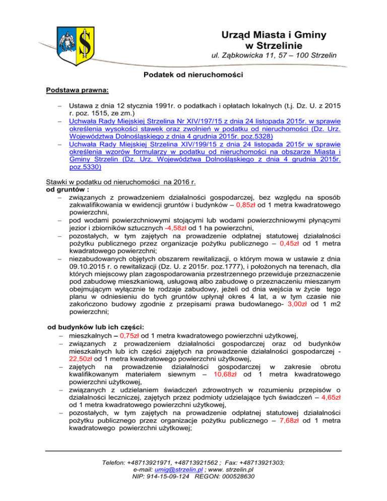 Urząd Miasta i Gminy w Strzelinie ul. Ząbkowicka 11, 57 – 100 Strzelin Podatek od nieruchomości Podstawa prawna: Ustawa z dnia 12 stycznia 1991r. o podatkach i opłatach lokalnych (t.j. Dz. U. z 2015 r. poz. 1515, ze zm.) Uchwała Rady Miejskiej Strzelina Nr XIV/197/15 z dnia 24 listopada 2015r. w sprawie określenia wysokości stawek oraz zwolnień w podatku od nieruchomości (Dz. Urz. Województwa Dolnośląskiego z dnia 4 grudnia 2015r. poz.5328) Uchwała Rady Miejskiej Strzelina XIV/199/15 z dnia 24 listopada 2015r w sprawie określenia wzorów formularzy w podatku od nieruchomości na obszarze Miasta i Gminy Strzelin (Dz. Urz. Województwa Dolnośląskiego z dnia 4 grudnia 2015r. poz.5330) Stawki w podatku od nieruchomości na 2016 r. od gruntów : związanych z prowadzeniem działalności gospodarczej, bez względu na sposób zakwalifikowania w ewidencji gruntów i budynków – 0,85zł od 1 metra kwadratowego powierzchni, pod wodami powierzchniowymi stojącymi lub wodami powierzchniowymi płynącymi jezior i zbiorników sztucznych -4,58zł od 1 ha powierzchni, pozostałych, w tym zajętych na prowadzenie odpłatnej statutowej działalności pożytku publicznego przez organizacje pożytku publicznego – 0,45zł od 1 metra kwadratowego powierzchni; niezabudowanych objętych obszarem rewitalizacji, o którym mowa w ustawie z dnia 09.10.2015 r. o rewitalizacji (Dz. U. z 2015r. poz.1777), i położonych na terenach, dla których miejscowy plan zagospodarowania przestrzennego przewiduje przeznaczenie pod zabudowę mieszkaniową, usługową albo zabudowę o przeznaczeniu mieszanym obejmującym wyłącznie te rodzaje zabudowy, jeżeli od dnia wejścia w życie tego planu w odniesieniu do tych gruntów upłynął okres 4 lat, a w tym czasie nie zakończono budowy zgodnie z przepisami prawa budowlanego- 3,00zł od 1 m2 powierzchni; od budynków lub ich części: mieszkalnych – 0,75zł od 1 metra kwadratowego powierzchni użytkowej, związanych z prowadzeniem działalności gospodarczej oraz od budynków mieszkalnych lub ich części zajętych na prowadzenie działalności gospodarczej 22,50zł od 1 metra kwadratowego powierzchni użytkowej, zajętych na prowadzenie działalności gospodarczej w zakresie obrotu kwalifikowanym materiałem siewnym – 10,68zł od 1 metra kwadratowego powierzchni użytkowej, związanych z udzielaniem świadczeń zdrowotnych w rozumieniu przepisów o działalności leczniczej, zajętych przez podmioty udzielające tych świadczeń – 4,65zł od 1 metra kwadratowego powierzchni użytkowej, pozostałych, w tym zajętych na prowadzenie odpłatnej statutowej działalności pożytku publicznego przez organizacje pożytku publicznego – 7,68zł od 1 metra kwadratowego powierzchni użytkowej; Telefon: +48713921971, +48713921562 ; Fax: +48713921303; e-mail: [email protected] ; www. strzelin.pl NIP: 914-15-09-124 REGON: 000528630 od budowli - 2% ich wartości określonej na podstawie art. 4 ust. l pkt 3 oraz ust. 3-7 ustawy o podatkach i opłatach lokalnych. Podatek od nieruchomości od osób fizycznych Złożenie informacji (IN-1) (druk do pobrania: w formacie Word | w formacie Adobe) Osoby fizyczne są obowiązane złożyć właściwemu organowi podatkowemu informację o nieruchomościach i obiektach budowlanych, sporządzoną na formularzu wg ustalonego wzoru, w terminie 14 dni od dnia wystąpienia okoliczności uzasadniających powstanie albo wygaśnięcie obowiązku podatkowego w zakresie podatku od nieruchomości lub od dnia zaistnienia zdarzenia, mającego wpływ na wysokość opodatkowania w tym roku, a w szczególności zmiana sposobu wykorzystywania przedmiotu opodatkowania lub jego części. Obowiązek składania informacji o nieruchomościach i obiektach budowlanych na podatek od nieruchomości, dotyczy również podatników korzystających ze zwolnień na mocy przepisów ustawy o podatkach i opłatach lokalnych. Terminy płatności podatku. Podatek od nieruchomości na rok podatkowy od osób fizycznych, ustala w drodze decyzji organ podatkowy właściwy ze względu na miejsce położenia przedmiotów opodatkowania. Podatek jest płatny w ratach proporcjonalnych do czasu trwania obowiązku podatkowego, w terminach: do dnia 15 marca, 15 maja, 15 września i 15 listopada roku podatkowego. W przypadku gdy zobowiązanie podatkowe w tym podatku nie przekracza 100,00 zł wpłaty dokonujemy jednorazowo do dnia 15 marca roku podatkowego . Podatek od nieruchomości od osób prawnych Złożenie deklaracji DN-1 (druk do pobrania: w formacie Word | w formacie Adobe) Osoby prawne, jednostki organizacyjne nie mające osobowości prawnej, jednostki organizacyjne Agencji Nieruchomości Rolnych a także jednostki organizacyjne Państwowego Gospodarstwa Leśnego Lasów Państwowych są obowiązane: 1) składać, w terminie do dnia 31 stycznia, organowi podatkowemu właściwemu ze względu na miejsce położenia przedmiotów opodatkowania, deklaracje na podatek od nieruchomości na dany rok podatkowy, sporządzone na formularzu według ustalonego wzoru, a jeżeli obowiązek podatkowy powstał po tym dniu – w terminie 14 dni od dnia zaistnienia okoliczności uzasadniających powstanie tego obowiązku; 2) odpowiednio skorygować deklaracje w razie zaistnienia zdarzenia, mającego wpływ na wysokość opodatkowania w tym roku, a w szczególności zmiana sposobu wykorzystywania przedmiotu opodatkowania lub jego części. w terminie 14 dni od dnia zaistnienia tego zdarzenia; Obowiązek składania deklaracji na podatek od nieruchomości, dotyczy również podatników korzystających ze zwolnień na mocy przepisów ustawy o podatkach i opłatach lokalnych Terminy płatności podatku. Obliczony w deklaracji podatek od nieruchomości należy wpłacać – bez wezwania - na rachunek właściwej gminy, w ratach proporcjonalnych do czasu trwania obowiązku podatkowego, w terminie do dnia 15 każdego miesiąca, a za styczeń do dnia 31 stycznia. W przypadku gdy zobowiązanie pod