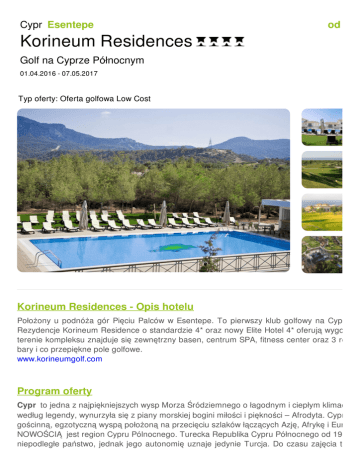 Cypr Esentepe od 575 Korineum Residences Golf na Cyprze Północnym 01.04.2016 - 07.05.2017 Typ oferty: Oferta golfowa Low Cost Korineum Residences - Opis hotelu Położony u podnóża gór Pięciu Palców w Esentepe. To pierwszy klub golfowy na Cyprze P Rezydencje Korineum Residence o standardzie 4* oraz nowy Elite Hotel 4* oferują wygodne terenie kompleksu znajduje się zewnętrzny basen, centrum SPA, fitness center oraz 3 restau bary i co przepiękne pole golfowe. www.korineumgolf.com Program oferty Cypr to jedna z najpiękniejszych wysp Morza Śródziemnego o łagodnym i ciepłym klimacie. T według legendy, wynurzyła się z piany morskiej bogini miłości i piękności – Afrodyta. Cypr jest gościnną, egzotyczną wyspą położoną na przecięciu szlaków łączących Azję, Afrykę i Europę. NOWOŚCIĄ jest region Cypru Pólnocnego. Turecka Republika Cypru Północnego od 1983 ro niepodległe państwo, jednak jego autonomię uznaje jedynie Turcja. Do czasu zajęcia tej cz przez Turków to właśnie tu znajdowało się najwięcej ośrodków turystycznych i kurortów. Zn tutaj wiele zabytków z okresu greckiego, bizantyńskiego oraz osmańskiego. Warto zobaczy Półwysep Karpas czy góry Pentadaktilos. Naszych golfistów zapraszamy do cudownego Golf& Country Club. Opinia T&A Hit w naszej ofercie! Zaskakująco wysoki standard w stosunku do ceny, a do tego rewelacy obsługi. Polecamy gorąco! Pola w pakiecie KORINEUM Golf & Country Club Położony u podnóża gór Pięciu Palców w Esentepe. To pierwszy klub golfowy na Cyprze Półn dołków, Par 72, długości 6232 m. Bogate zaplecze do ćwiczeń to min 34 stanowiskowy Drivi tereny do krótkiej gry oraz 3 dołkowa akademia! Propozycje przelotów BEZPOŚREDNI LOT Z WARSZAWY DO LARNAKI Linia LOT Odlot Przylot WYLOT (WAW – 22:30 02:55 LCA) POWRÓT (LCA – 03:45 06:20 WAW) Ceny lotów już od ok 500 zł Alternatywnie loty Wizzair z WAW i KTW do LCA . Cena od 250 zł + bagaże Udogodnienia hotelu Bar Bar z przekąskami Całodobowa recepcja Całoroczny basen Centrum Fitness Korineum Residences 4* Internet Wi-Fi Klimatyzacja Obsługa pokoju Usługi pralni Usługi Spa & Wellness Pokój DBL Pokój SGL Non G pakiet bez lotu / 7 noclegów / HB / ceny w € od osoby Korineum Residences 4* Pokój DBL Pokój SGL Non G 01.04-08.05.16 810.00 EUR 975.00 EUR 460.00 09.05-16.09.16 575.00 EUR 740.00 EUR 415.00 17.09-26.11.16 810.00 EUR 975.00 EUR 460.00 27.11.16-10.02.17 599.00 EUR 765.00 EUR 415.00 11.02-07.05.17 810.00 EUR 975.00 EUR 460.00 Cena aktualna przy min. 4 osobach Oferta zawiera 7 noclegów w pokojach DBL/SGL standard w Residences, Wyżywienie HB (śniadania i obiadokolacje), Pakiet 5 green fee, Transfer lotniskowy dla min 4 os., Ubezpieczenie KL NWW z OC golf, Podatek i obsługę Oferta nie zawiera Przelotu WAW - Larnaka - WAW, Opłaty za melexy, wózki, Dopłaty do transferu lotniskowego przy mniejszej ilości osób (przy 1 os:+105€, przy 2 os 70€), Napoi do kolacji, Opłaty za bagaż golfa - od 50 € w jedną stronę Dopłat za widok na morze - 25 €/osoba Dopłaty za upgrade do pokoju Deluxe - 90 €/pokój Dopłaty za zmianę hotelu na Korineum Elite Hotel - 45 €/osoba Dopłaty za upgrade do pokoju typu Delight w Elite Hotel - 180 €/pokój Dopłaty za upgrade do pokoju typu Junior Suite w Elite Hotel - 320 €/pokój Dopłaty za imprezę sylwestrową 195 € Dodatkowego GF - 50 - 70 € (w zależności od okresu) Katarzyna Bobińska tel: +48 600 88 55 44 e-mail: kbobinska@travel