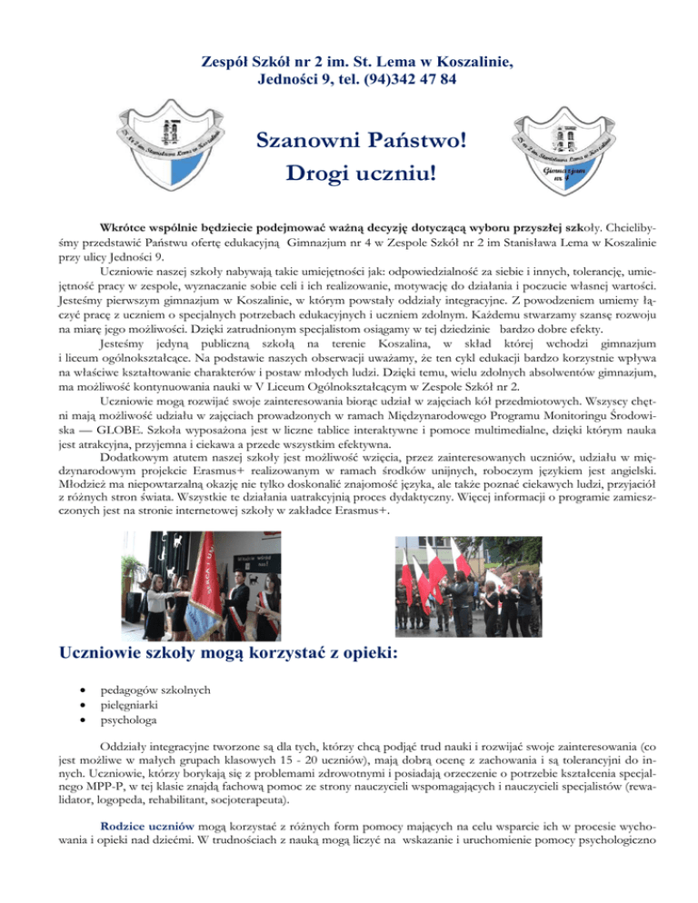 Zespół Szkół nr 2 im. St. Lema w Koszalinie, Jedności 9, tel. (94)342 47 84 Szanowni Państwo! Drogi uczniu! Wkrótce wspólnie będziecie podejmować ważną decyzję dotyczącą wyboru przyszłej szkoły. Chcielibyśmy przedstawić Państwu ofertę edukacyjną Gimnazjum nr 4 w Zespole Szkół nr 2 im Stanisława Lema w Koszalinie przy ulicy Jedności 9. Uczniowie naszej szkoły nabywają takie umiejętności jak: odpowiedzialność za siebie i innych, tolerancję, umiejętność pracy w zespole, wyznaczanie sobie celi i ich realizowanie, motywację do działania i poczucie własnej wartości. Jesteśmy pierwszym gimnazjum w Koszalinie, w którym powstały oddziały integracyjne. Z powodzeniem umiemy łączyć pracę z uczniem o specjalnych potrzebach edukacyjnych i uczniem zdolnym. Każdemu stwarzamy szansę rozwoju na miarę jego możliwości. Dzięki zatrudnionym specjalistom osiągamy w tej dziedzinie bardzo dobre efekty. Jesteśmy jedyną publiczną szkołą na terenie Koszalina, w skład której wchodzi gimnazjum i liceum ogólnokształcące. Na podstawie naszych obserwacji uważamy, że ten cykl edukacji bardzo korzystnie wpływa na właściwe kształtowanie charakterów i postaw młodych ludzi. Dzięki temu, wielu zdolnych absolwentów gimnazjum, ma możliwość kontynuowania nauki w V Liceum Ogólnokształcącym w Zespole Szkół nr 2. Uczniowie mogą rozwijać swoje zainteresowania biorąc udział w zajęciach kół przedmiotowych. Wszyscy chętni mają możliwość udziału w zajęciach prowadzonych w ramach Międzynarodowego Programu Monitoringu Środowiska — GLOBE. Szkoła wyposażona jest w liczne tablice interaktywne i pomoce multimedialne, dzięki którym nauka jest atrakcyjna, przyjemna i ciekawa a przede wszystkim efektywna. Dodatkowym atutem naszej szkoły jest możliwość wzięcia, przez zainteresowanych uczniów, udziału w międzynarodowym projekcie Erasmus+ realizowanym w ramach środków unijnych, roboczym językiem jest angielski. Młodzież ma niepowtarzalną okazję nie tylko doskonalić znajomość języka, ale także poznać ciekawych ludzi, przyjaciół z różnych stron świata. Wszystkie te działania uatrakcyjnią proces dydaktyczny. Więcej informacji o programie zamieszczonych jest na stronie internetowej szkoły w zakładce Erasmus+. Uczniowie szkoły mogą korzystać z opieki: koły mogą korzystać z pedagogów szkolnych pielęgniarki psychologa Oddziały integracyjne tworzone są dla tych, którzy chcą podjąć trud nauki i rozwijać swoje zainteresowania (co jest możliwe w małych grupach klasowych 15 - 20 uczniów), mają dobrą ocenę z zachowania i są tolerancyjni do innych. Uczniowie, którzy borykają się z problemami zdrowotnymi i posiadają orzeczenie o potrzebie kształcenia specjalnego MPP-P, w tej klasie znajdą fachową pomoc ze strony nauczycieli wspomagających i nauczycieli specjalistów (rewalidator, logopeda, rehabilitant, socjoterapeuta). Rodzice uczniów mogą korzystać z różnych form pomocy mających na celu wsparcie ich w procesie wychowania i opieki nad dziećmi. W trudnościach z nauką mogą liczyć na wskazanie i uruchomienie pomocy psychologiczno 4: - pedagogicznej, natomiast dla ucznia zdolnego zaproponujemy koła zainteresowań lub zorganizujemy pracę z uczniem szczególnie uzdolnionym. Doradca zawodowy pomoże rodzicom i ich dzieciom dokonać wyboru zawodu. Kadrę pedagogiczną w gimnazjum stanowią nauczyciele z wyższym wykształceniem magisterskim, z odpowiednim przygotowaniem pedagogicznym, większość z najwyższym stopniem awansu zawodowego. Nauczyciele gimnazjum są jednocześnie nauczycielami w liceum ogólnokształcącym. Rada Rodziców Przedstawiciele rodziców uczniów z każdej klasy wchodzą w skład Rady Rodziców. Rodzice aktywnie uczestniczą w życiu szkoły i wspierają jej działania poprzez: udział w rozwiązywaniu ważnych problemów szkolnych opiniowanie dokumentów szkolnych współorganizowanie imprez dla uczniów i rodziców pozyskiwanie środków materialnych, sprzętu i pomocy dydaktycznych Gimnazjum nr 4 cieszy się dobrą opinią wśród uczniów i rodziców. Świadczy o tym fakt, iż co roku około 50% klas pierwszych stanowią uczniowie spoza rejonu szkoły. Nasi uczniowie uzyskują na miarę swoich możliwości dobre wyniki w testach gimnazjalnych. Odnoszą też sukcesy w konkursach przedmiotowych. Wielu zdobywa główne nagrody w konkursach: recytatorskich, plastycznych, sportowych o różnym zasięgu. Wysoką jakość kształcenia, wychowania i opieki potwierdzają posiadane przez nasze gimnazjum certyfikaty: Zachodniopomorska Szkoła Jakości Koszalińskie Laury Europy Szkoła z klasą Uczeń z klasą Nauczyciel z klasą Szkoła Przyjazna Uczniowi Zachodniopomorska Szkoła Promująca Zdrowie Szkoła bez przemocy Szkoła w ruchu Tylko w Gimnazjum nr 4: W roku szkolnym 2016/2017 zgodnie z naszą wieloletnią tradycją dziewczęta będą miały możliwość trenować i rozwijać umiejętności w zakresie piłki ręcznej pod opieką wyspecjalizowanej kadry instruktorskiej i trenerskiej z piłki ręcznej. W ramach zajęć sportowych dziewczęta będą uczestniczyć w zajęciach na basenie, lekkiej atletyce jak również w obozach sportowych. Nasza szkoła zajmuje wysokie miejsca w rozgrywkach sportowych (w powiecie, rejonie, województwie, ogólnopolskiej olimpiadzie młodych). Nawiązaliśmy współpracę z klubem sportowym w Paryżu i w ramach tej współpracy młodzież będzie miała możliwość wymieniać doświadczenia sportowe z koleżankami i kolegami z Francji. Każda uczennica i każdy uczeń, mogą przystąpić do międzyoddziałowej kompanii szkolnej — pododdziału, którego członkowie odbywają zajęcia między innymi na terenie klubu 8. Koszalińskiego Pułku Przeciwlotniczego. Dzięki tym zajęciom rozwijają swoje zainteresowania wojskiem i służbami mundurowymi. Biorąc udział w zajęciach uczniowie nocują w klubie 8. Pułku Przeciwlotniczego. Uczni