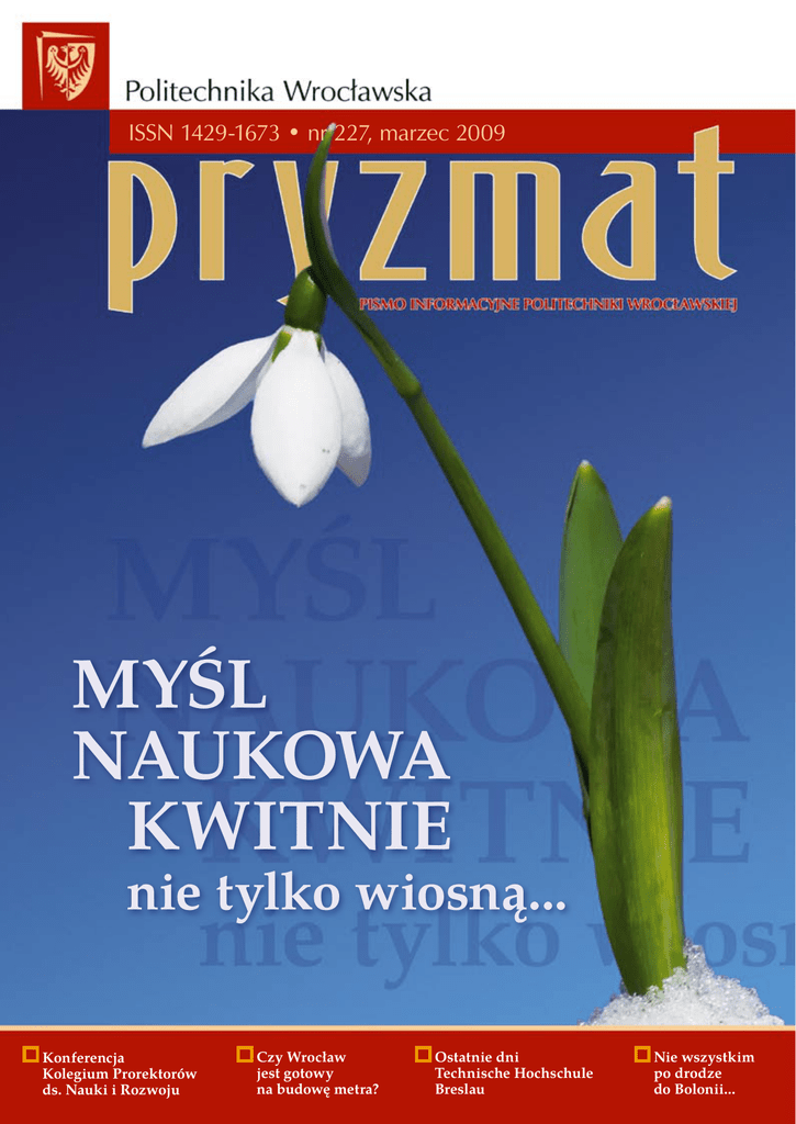 ISSN 1429-1673 • nr 227, marzec 2009 Myśl naukowa kwitnie nie tylko wiosną... Konferencja Kolegium Prorektorów ds. Nauki i Rozwoju Czy Wrocław jest gotowy na budowę metra? Ostatnie dni Technische Hochschule Breslau Nie wszystkim po drodze do Bolonii... INSTYTUT FIZYKI POLITECHNIKI WROC£AWSKIEJ Zapraszamy uczniów, nauczycieli oraz innych zainteresowanych na XVI CYKL WYK£ADÓW POPULARYZUJ¥CYCH FIZYKÊ Wyk³ady odbywaj¹ siê w sali 322 gmachu A-1 PWr Wybrze¿e Wyspiañskiego 27, pocz¹tek o godz. 17.05 25 II 2009 dr hab. J. W³asak, prof. ndzw. PWr Instytut Fizyki, Politechnika Wroc³awska 1687 - zasadzenie nauki 4 III 2009 prof. dr hab. Henryk Kasprzak Zespó³ Optyki Widzenia, Instytut Fizyki, Politechnika Wroc³awska Oko znane i nieznane 11 III 2009 dr Maciej Mulak, dr Mieczys³aw Pluta Instytut Fizyki, Politechnika Wroc³awska O rozmiarach Wszechœwiata: historia ludzkiego poznania 18 III 2009 dr Agnieszka Masajada Instytut Fizyki, Politechnika Wroc³awska Z³udzenia widzenia - rzecz o mira¿ach 25 III 2009 prof. dr hab. Ryszard Poprawski, dr Agnieszka Ci¿man, dr Adam Sieradzki Zespó³ Fizyki Dielektryków, Instytut Fizyki, Politechnika Wroc³awska Fizyka wody - woda w fizyce 1 IV 2009 dr Andrzej Kolarz Zespó³ Fizyki Dielektryków, Instytut Fizyki, Politechnika Wroc³awska Jak p³yn¹æ pod wiatr? 15 IV 2009 dr hab. Piotr Kurzynowski, mgr Monika Leniec, mgr Tadeusz Przerwa-Tetmajer Instytut Fizyki, Politechnika Wroc³awska Prawa fizyki w Hollywood Organizator cyklu: dr hab. Antoni C. Mituœ, Instytut Fizyki Pwr., e-mail: [email protected], tel.: (071) 320 4270 Dodatkowe informacje pod numerami telefonu (071) 320 20 20, 320 20 02 i na stronie www.if.pwr.wroc.pl w num e r z e: wydarzenia 5 VII Konferencja Kolegium Prorektorów ds. Nauki i Rozwoju 8 Bezobsługowe Centrum Wydruków – pierwszy kiosk już uruchomiony badania 9 Najaktywniejsi 5 KPNiR obraduje Przedstawiciele władz publicznych wyższych szkół technicznych wzięli udział w siódmej, po raz pierwszy zorganizowanej na Politechnice Wrocławskiej w nowej kadencji władz – konferencji Kolegium Prorektorów ds. Nauki i Rozwoju. Podczas dwudniowych obrad dyskutowano m.in. o transferze i wdrażaniu do praktyki gospodarczej innowacyjnych technologii powstałych w uczelnianych laboratoriach. i najbardziej kreatywni wynalazcy nagrodzeni 12 Misje konserwatorskie w basenie Morza Śródziemnego – epilog 15 „Przyszłościowe rozwiązanie” na budynku Wydziału Budownictwa KONFERENCJE 17 Program ESPON dla południowej i zachodniej Polski 18 Dyskusja w PAN-ie o metrze dla stolicy Dolnego Śląska TARGI 21 PROFESJA zaprasza, czyli polscy i zagraniczni pracodawcy szukają kadr LIDERZY 22 Laureaci nagród NOT-u Brama Bielawska Zdjęcie na okładce: www.sxc.hu Zdjęcia: Krzysztof Mazur, Iwona Olanin marzec 2009 Studenckie Koło Naukowe Urbanistyki CARDO i Zakład Urbanistyki Wydziału Architektury Politechniki Wrocławskiej oraz Urząd Miejski w Bielawie zorganizowali studenckie warsztaty urbanistyczne, podczas których opracowano nowe wizje wjazdu do miasta. 39 za wybitne osiągnięcia w dziedzinie techniki 25 L‘Oréal Polska dla Kobiet i Nauki – stypendium dla doktorantki z W-3 26 Najlepsze prace magisterskie z informatyki nagrodzone przez PTI 28 Młoda uczona na medal! Nowatorskie osiągnięcia dr hab. inż. K. Chojnackiej od redakcji B ieżący edytorial przeznaczamy, uznając sprawę za priorytetową, na oświadczenie JM Rektora Politechniki Wroc ławskiej prof. Tadeusza Więckowskiego, wygłoszone podczas briefingu, który odbył się 24.02 br., stanowiące komentarz do artykułów na łamach lokalnej prasy. W dziale Gremia publikujemy także stanowisko Prezydium Senatu oraz uchwałę z nadzwyczajnego posiedzenia Senatu PWr w związku z poniższym. Szanowni Państwo Witam wszystkich serdecznie na dzisiejszym spotkaniu, na które Państwa zaprosiłem, aby przedstawić stanowisko moje i Prezydium Senatu Politechniki Wrocławskiej dotyczące nieprawdziwych informacji, jakie ukazały się na łamach „Gazety Wyborczej” [23.02 br. – red]. Uważam, że podczas toczących się negocjacji, informowanie mediów o ich zakresie i tematyce za niewłaściwe. Teraz, po publikacji, zostałem „wywołany do odpowiedzi”, ponieważ nie mogę pozwolić na jakikolwiek uszczerbek w wizerunku uczelni. Szanowni Państwo Trwają nadal negocjacje dotyczące zasad współpracy Politechniki Wrocławskiej z Wrocławskim Centrum Badań EIT + spółką prawa handlowego. Politechnika Wrocławska, podobnie jak i inne uczelnie wrocławskie, ma niewiele ponad 1-procentowy udział w spółce, a tym samym nie ma wpływu na działanie i decyzje podejmowane przez spółkę. Największym udziałowcem jest miasto Wrocław – 51 proc udziałów. W czwartek, 19 lutego, spotkałem się z Prezydentem Wrocławia panem Rafałem Dutkiewiczem i przedstawiłem mu propozycje rozwiązania problemów. Pan Prezydent poinformował mnie, że za kilka dni przekaże swoje stanowisko w tej sprawie, więc cierpliwie czekamy. Politechnika Wrocławska jest zainteresowana współpracą z Wrocławskim Centrum Badań EIT+ spółką prawa handlowego w realizacji projektów. Jednak powinno to odbywać się na zasadach wskazanych w trzech umowach dotyczących przygotowania wniosków, podpisanych z Ministerstwem Nauki i Szkolnictwa Wyższego w gabinecie Prezydenta Miasta w 2007 roku. Oznacza to przywrócenie Politechnice Wrocławskiej i pozostałym uczelniom statusu beneficjenta w realizacji projektów NanoMat i BioMed oraz w projekcie na infrastrukturę badawczą DolBioMat. Podkreślam raz jeszcze stanowczo – Politechnika Wrocławska jest zainteresowana realizacją wspomnianych projektów finansowanych ze środków Unii Europejskiej. Natomiast nie możemy zgodzić się, aby powstała już po podpisaniu tych umów spółka EIT+ przejęła rolę jedynego beneficjenta i realizatora badań, nie mając przy tym własnego zaplecza zarówno infrastrukturalnego, jak i kadro