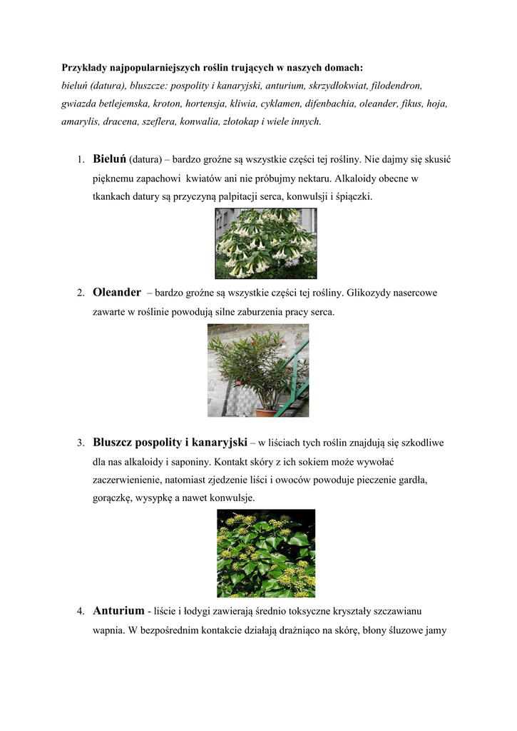 Przykłady najpopularniejszych roślin trujących w naszych domach: bieluń (datura), bluszcze: pospolity i kanaryjski, anturium, skrzydłokwiat, filodendron, gwiazda betlejemska, kroton, hortensja, kliwia, cyklamen, difenbachia, oleander, fikus, hoja, amarylis, dracena, szeflera, konwalia, złotokap i wiele innych. 1. Bieluń (datura) – bardzo groźne są wszystkie części tej rośliny. Nie dajmy się skusić pięknemu zapachowi kwiatów ani nie próbujmy nektaru. Alkaloidy obecne w tkankach datury są przyczyną palpitacji serca, konwulsji i śpiączki. 2. Oleander – bardzo groźne są wszystkie części tej rośliny. Glikozydy nasercowe zawarte w roślinie powodują silne zaburzenia pracy serca. 3. Bluszcz pospolity i kanaryjski – w liściach tych roślin znajdują się szkodliwe dla nas alkaloidy i saponiny. Kontakt skóry z ich sokiem może wywołać zaczerwienienie, natomiast zjedzenie liści i owoców powoduje pieczenie gardła, gorączkę, wysypkę a nawet konwulsje. 4. Anturium - liście i łodygi zawierają średnio toksyczne kryształy szczawianu wapnia. W bezpośrednim kontakcie działają drażniąco na skórę, błony śluzowe jamy ustnej i przewodu pokarmowego, spojówki. Powodują ból, pieczenie i łzawienie oczu. Inne objawy to obrzęk warg, języka, krtani który szybko przemija. 5. Skrzydłokwiat - ma zdolność do oczyszczania powietrza z substancji toksycznych, roślina ma bardzo pozytywny wpływ na zdrowie człowieka. Jednak tkanki tych roślin zawierają kryształy szczawianu wapnia. Ugryzienie, żucie lub spożycie tych roślin może wywołać pieczenie języka, wzmożone pragnienie, skurcze oraz zaburzenia rytmu serca. 6. Filodendron – w swoich tkankach, podobnie jak skrzydłokwiat, ma kryształki szczawianu wapnia. Zjedzenie kawałka tej rośliny skutkuje pieczeniem warg, języka i gardła, a w skrajnych przypadkach poważnymi trudnościami z oddychaniem. 7. Gwiazda betlejemska - Uważa się, że najbardziej toksycznymi jej częściami są czerwone, różowe lub białe przykwiatki. Sok mleczny działa drażniąco na śluzówkę jamy ustnej, przewodu pokarmowego oraz na oczy - powoduje pieczenie, łzawienie i ból. 8. Kroton – trujący sok mleczny obecny w liściach. W jego skład wchodzą m.in. estry diterpenów, które po zetknięciu ze skóra powodują oparzenia i ostre podrażnienia. 9. Hortensja – części trujące rośliny to kora, liście i pąki kwiatowe, roślina jest toksyczna tylko przy spożyciu dużej ilości. Symptomami zatrucia są nudności, wymioty, bóle brzucha i pocenie się. 10. Kliwia - cała roślina jest trująca, ale szczególnie nasady liści i łodygi, objawami zatrucia są: ślinotok, wymioty i biegunka, większe dawki mogą spowodować zapaść i śmierć. 11. Cyklamen - zawiera trujący glikozyd, które dobrze wchłaniają się z przewodu pokarmowego, cechują się szeroką dystrybucją w tkance mięśniowej. Do objaw zatrucia zaliczamy: nudności, wymioty , bóle brzucha, biegunka , zaburzenia percepcji barw (widzenie najpierw "na fioletowo" potem "na żółto") , inne zaburzenia widzenia (zamazane, podwójne, a nawet ślepota) , zaburzeniami świadomości, splątania, zaburzeniami rytmu serca. 12. Dieffenbachia – jest niebezpieczna w dwojaki sposób: ma w tkankach kryształki szczawianu wapnia, ,które po wbiciu się w ciało powodują obrzęk i pieczenie. Zjedzenie kawałka tej rośliny skutkuje pieczeniem warg, języka i gardła, a w skrajnych przypadkach poważnymi trudnościami z oddychaniem. 13. Fikus – ma w tkankach sok mleczny zawierający lateks, wywołuje on różne nieprzyjemne reakcje: zaczerwienienie skóry, pokrzywkę, katar oraz astmę oskrzelową. Objawy te mogą pojawić się nawet wtedy gdy nie dotykaliśmy rośliny, wystarczy że ze zranionego liścia wypłynie trochę soku a jego zaschnięte drobiny będą unosiły się w powietrzu. 14. Hoja - zawiera sok mleczny, który wydziela się w momencie uszkodzenia liści bądź pędów i powoduje on podrażnienia skóry. 15. Amarylis - trujące są cebulki, powodują podrażnienie żołądka, wymioty oraz biegunkę. 16. Dracena - zawierają sok mleczny, który wydziela się w momencie uszkodzenia rośliny i powoduje podrażnienia skóry. 17. Szeflera – zawiera nierozpuszczalne szczawiany wapnia, które powodują pieczenie warg, języka i gardła, a w skrajnych przypadkach trudności z oddychaniem. 18. Konwalia – w tkankach konwalii znajdują się glikozydy nasercowe, zdarzały się wypadki śmierci po wypiciu wody z wazonika, w którym stały. 19. Złotokap – wszystkie części rośliny są trujące ( liście, nasiona, owoce, łodygi). Należą do najbardziej trujących roślin w Polsce! Wszystkie ich części są mocno trujące dla ludzi, a spożycie nasion może nawet powodować śmierć! Toksyczność złotokapów wynika z zawartości w ich tkankach trującego alkaloidu o nazwie cytyzyna. Stwierdzono, że nawet pyłek kwiatowy złotokapów jest szkodliwy dla pszczół. Fotografie umieszczone w tym artykule pochodzą ze stron internetowych.