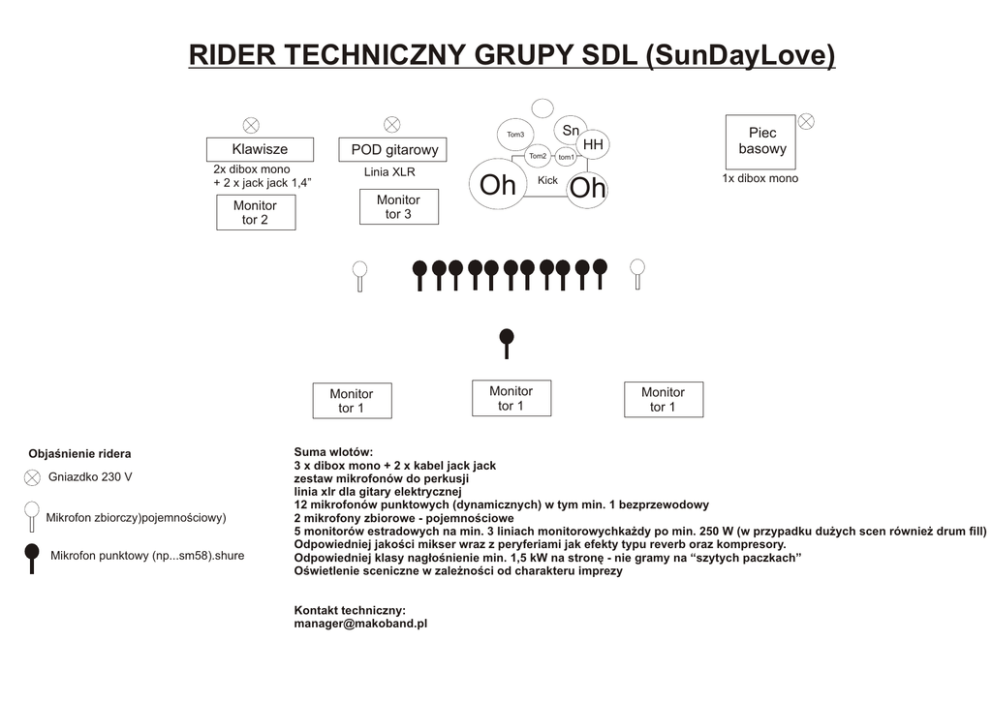 RIDER TECHNICZNY GRUPY SDL (SunDayLove) Sn Tom3 Klawisze 2x dibox mono + 2 x jack jack 1,4” Linia XLR Monitor tor 3 Monitor tor 2 Monitor tor 1 Objaśnienie ridera Gniazdko 230 V Mikrofon zbiorczy)pojemnościowy) Mikrofon punktowy (np...sm58).shure Piec basowy HH POD gitarowy Tom2 Oh Monitor tor 1 Kick tom1 1x dibox mono Oh Monitor tor 1 Suma wlotów: 3 x dibox mono + 2 x kabel jack jack zestaw mikrofonów do perkusji linia xlr dla gitary elektrycznej 12 mikrofonów punktowych (dynamicznych) w tym min. 1 bezprzewodowy 2 mikrofony zbiorowe - pojemnościowe 5 monitorów estradowych na min. 3 liniach monitorowychkażdy po min. 250 W (w przypadku dużych scen również drum fill) Odpowiedniej jakości mikser wraz z peryferiami jak efekty typu reverb oraz kompresory. Odpowiedniej klasy nagłośnienie min. 1,5 kW na stronę - nie gramy na “szytych paczkach” Oświetlenie sceniczne w zależności od charakteru imprezy Kontakt techniczny: [email protected]