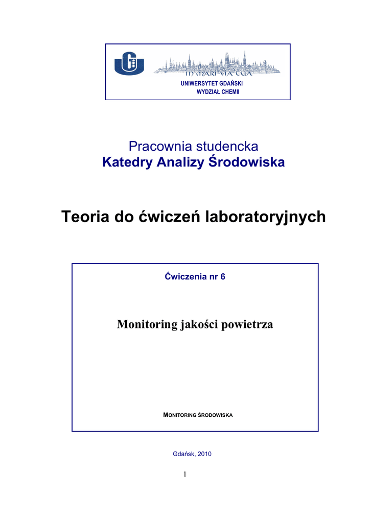 UNIWERSYTET GDAŃSKI WYDZIAŁ CHEMII Pracownia studencka Katedry Analizy Środowiska Teoria do ćwiczeń laboratoryjnych Ćwiczenia nr 6 Monitoring jakości powietrza MONITORING ŚRODOWISKA Gdańsk, 2010 1 1. Wprowadzenie Atmosfera ziemska – gazowa powłoka otaczająca Ziemię – chroni nasze życie przed szkodliwym promieniowaniem z kosmosu, kształtuje pogodę i klimat oraz jest zbiornikiem substancji chemicznych niezbędnych dla życia – tlenu, azotu, ditlenku węgla, pary wodnej. Atmosferę ziemską podzielono na warstwy wg zmieniającej się temperatury: a) troposferę, 0÷(10-16) km, +15 ÷ -56º C, b) stratosferę, (10-16)÷50 km, -56 ÷ -2º C, c) mezosferę, 50 ÷ 85 km, -2 ÷ -92º C, d) termosferę, 85 ÷ 500 km, - 92 ÷ +1200º C. Granica między troposferą a stratosferą zmienia sie w przedziale 10 ÷ 16 km. Według kryterium składu atmosferę podzielono na: a) egzosferę, powyżej 500 km, charakteryzującą się ucieczką najszybszych molekuł gazów atmosferycznych wodoru i helu, b) jonosferę, powyżej 80 km, charakteryzującą się znacznym stopniem jonizacji (O2+, O+, NO+), c) ozonosferę, 15 ÷ 30 km, charakteryzującą się znacznie podwyższoną zawartością ozonu, d) troposferę, 0 ÷ (10-16) km, zawierającą głównie N2, O2, CO2, H2O – ważne substancje dla procesów zachodzących w biosferze. Skład chemiczny suchego, niezanieczyszczonego powietrza w przyziemnej warstwie troposfery przedstawiono w Tabeli 1. Powietrze atmosferyczne do wysokości 80 km nad poziom morza ma stały poziom głównych składników, za wyjątkiem pary wodnej. Powyżej 80 km powietrze jest bardziej rozrzedzone. Poza tym, z powodu dysocjacji cząsteczek, jonizacji cząsteczek i atomów oraz reakcji fotochemicznych, zachodzących w wyniku promieniowania słonecznego i kosmicznego, zmienia się jego skład. Atmosfera, a zwłaszcza jej przyziemna warstwa troposfera stanowi ośrodek, w którym przebiegają najważniejsze życiowe procesy organizmów. Powietrze atmosferyczne jest wykorzystywane jako surowiec w wielu procesach produkcyjnych, poza tym, jako medium przenoszące ciepło lub masę, stosowane jest w procesach ogrzewania, chłodzenia, suszenia czy nawilżania. Sprężone powietrze jest używane 2 do poruszania maszyn pneumatycznych. Niestety, powietrze atmosferyczne wykorzystywane Składniki Średnia zawartość, % objętościowy N2 78,08 O2 20,95 Ar 0,934 CO2 0,034 Ne 1,818 x 10-3 He 5,24 x 10-4 Kr 1,14 x 10-4 Xe 8,7 x 10-6 CH4 1,6 x 10-4 CO ~ 1,2 x 10-5 N2O 3 x 10-5 NOx (NO + NO2) 10-10 - 10-6 HNO3 10-9 - 10-7 NH3 10-8 - 10-7 H2 5 x 10-5 H2O2 10-8 - 10-6 HO· 10-13 - 10-10 HO2· 10-11 - 10-9 H2CO 10-8 - 10-7 CS2 10-9 - 10-8 COS 10-8 SO2 ~ 2 x 10-8 I2 0 - ślady CCl2F2 2,8 x 10-5 C2H3Cl3 ~ 1 x 10-8 Tabela 1. Skład suchego powietrza atmosferycznego przy powierzchni gruntu. do poruszania maszyn pneumatycznych. Niestety, powietrze atmosferyczne wykorzystywane jest też, bardziej lub mniej świadomie, jako odbiornik gazowych czy aerozolowych produktów odpadowych życia i działalności gospodarczej człowieka. Ochrona powietrza atmosferycznego przed zanieczyszczeniami stwarza szczególne 3 problemy: po pierwsze, z powodu ogromnej dynamiki atmosfery, stanowiącej główną drogę rozprzestrzeniania zanieczyszczeń i wymiany pomiędzy pozostałymi elementami środowiska; po drugie, z powodu powszechności narażenia populacji ludzkiej, fauny i flory wobec braku możliwości odcięcia się od skażeń, co jest możliwe w przypadku skażonej gleby czy wód. Naruszanie składu chemicznego poprzez zmianę średnich zawartości składników jak i emisja substancji reagujących ze składnikami atmosfery powoduje liczne i poważne konsekwencje dla biosfery. 2. Zanieczyszczenia powietrza atmosferycznego Pierwszym krokiem mającym na celu ochronę środowiska jest rozpoznanie i określenie rodzaju i stopnia zanieczyszczenia. Za zanieczyszczenia powietrza przyjmuje się wszystkie substancje nie będące jego naturalnymi składnikami. Zanieczyszczenia to najczęściej gazy oraz ciecze (w postaci aerozolu) i ciała stałe (w postaci pyłu). Za zanieczyszczenia przyjmuje się też składniki stale występujące w powietrzu, jeśli są w ilościach zdecydowanie przekraczających naturalny jego skład. Spośród tysięcy substancji zanieczyszczających powietrze atmosferyczne pewna ich liczba jest emitowana przez większość źródeł antropogenicznych i zanieczyszczenia te traktowane są jako zanieczyszczenia charakterystyczne. Należą do nich: 1) zanieczyszczenia gazowe czyli gazy i pary związków chemicznych (LZO, lotne związki organiczne), np. tlenki węgla (CO i CO2), siarki (SO2 i SO3) i azotu (NOx), amoniak, fluor, węglowodory łańcuchowe i aromatyczne i ich chlorowcopochodne, fenole oraz tzw. utleniacze, które są zanieczyszczeniami wtórnymi, powstałymi w wyniku reakcji fotochemicznych, rodnikowych, i katalitycznych substancji zanieczyszczających powietrze (ozon, NO2, formaldehyd, akroleina i nadtlenki organiczne), 2) ciała stałe czyli cząstki nieorganiczne i organiczne (pyły) o różnorodnej wielkości ziaren i różnym składzie chemicznym, np. popiół lotny, sadza, pyły z produkcji cementu, pyły metalurgiczne, związki ołowiu, miedzi, chromu, kadmu i innych metali ciężkich; 3) ciecze w postaci kropelek, np. kwasów, zasad i rozpuszczalników; 4) zanieczyszczenia biologiczne czyli mikroorganizmy - wirusy, bakterie i grzyby, których rodzaj i ilość odbiega od składu naturalnej mikroflory powietrza. 4 2.1. Źródła zanieczyszczeń Zanieczyszczenia w powietrzu mogą pochodzić ze źródeł naturalnych i antropogenicznych. Naturalnymi źródłami tlenków węgla są procesy oddychania organizmów żywych, wulkany, gejzery, bagna, pożary lasów, stepów i sawann. Wulkany i bagna wydzielają również tlenki siarki, azotu, siarkowodór, amoniak, metan i inne. Źródłem pyłów o różnym składzie chemicznym są popioły wulkaniczne, pożary, burze piaskowe, gle