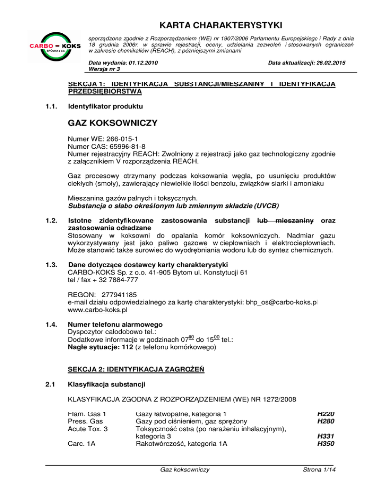 KARTA CHARAKTERYSTYKI sporządzona zgodnie z Rozporządzeniem (WE) nr 1907/2006 Parlamentu Europejskiego i Rady z dnia 18 grudnia 2006r. w sprawie rejestracji, oceny, udzielania zezwoleń i stosowanych ograniczeń w zakresie chemikaliów (REACH), z późniejszymi zmianami Data wydania: 01.12.2010 Wersja nr 3 Data aktualizacji: 26.02.2015 SEKCJA 1: IDENTYFIKACJA SUBSTANCJI/MIESZANINY I IDENTYFIKACJA PRZEDSIĘBIORSTWA 1.1. Identyfikator produktu GAZ KOKSOWNICZY Numer WE: 266-015-1 Numer CAS: 65996-81-8 Numer rejestracyjny REACH: Zwolniony z rejestracji jako gaz technologiczny zgodnie z załącznikiem V rozporządzenia REACH. Gaz procesowy otrzymany podczas koksowania węgla, po usunięciu produktów ciekłych (smoły), zawierający niewielkie ilości benzolu, związków siarki i amoniaku Mieszanina gazów palnych i toksycznych. Substancja o słabo określonym lub zmiennym składzie (UVCB) 1.2. Istotne zidentyfikowane zastosowania substancji lub mieszaniny oraz zastosowania odradzane Stosowany w koksowni do opalania komór koksowniczych. Nadmiar gazu wykorzystywany jest jako paliwo gazowe w ciepłowniach i elektrociepłowniach. Może stanowić także surowiec do wyodrębniania wodoru lub do syntez chemicznych. 1.3. Dane dotyczące dostawcy karty charakterystyki CARBO-KOKS Sp. z o.o. 41-905 Bytom ul. Konstytucji 61 tel / fax + 32 7884-777 REGON: 277941185 e-mail działu odpowiedzialnego za kartę charakterystyki: [email protected] www.carbo-koks.pl 1.4. Numer telefonu alarmowego Dyspozytor całodobowo tel.: Dodatkowe informacje w godzinach 0700 do 1500 tel.: Nagłe sytuacje: 112 (z telefonu komórkowego) SEKCJA 2: IDENTYFIKACJA ZAGROŻEŃ 2.1 Klasyfikacja substancji KLASYFIKACJA ZGODNA Z ROZPORZĄDZENIEM (WE) NR 1272/2008 Flam. Gas 1 Press. Gas Acute Tox. 3 Carc. 1A Gazy łatwopalne, kategoria 1 Gazy pod ciśnieniem, gaz sprężony Toksyczność ostra (po narażeniu inhalacyjnym), kategoria 3 Rakotwórczość, kategoria 1A Gaz koksowniczy H220 H280 H331 H350 Strona 1/14 KARTA CHARAKTERYSTYKI sporządzona zgodnie z Rozporządzeniem (WE) nr 1907/2006 Parlamentu Europejskiego i Rady z dnia 18 grudnia 2006r. w sprawie rejestracji, oceny, udzielania zezwoleń i stosowanych ograniczeń w zakresie chemikaliów (REACH), z późniejszymi zmianami Data wydania: 01.12.2010 Wersja nr 3 Repr. 1A STOT RE 1 Aquatic Acute 1 Data aktualizacji: 26.02.2015 Działanie szkodliwe na rozrodczość, kategoria 1A Działanie toksyczne na narządy docelowe – narażenie powtarzane, kategoria 1 Stwarzające zagrożenie dla środowiska wodnego – zagrożenie ostre, kategoria 1 H360 H372 H400 KLASYFIKACJA ZGODNA Z DYREKTYWĄ NR 67/548/EWG Substancja skrajnie łatwopalna Substancja toksyczna Substancja działająca szkodliwie na rozrodczość kat. 1 Substancja rakotwórcza kat. 1 Substancja niebezpieczna dla środowiska (F+, R12) (T, R23, 48/23) (T, R61) (T, R45) (N, R50) Rodzaje zagrożenia: R 12 Produkt skrajnie łatwopalny R 23 Działa toksycznie przez drogi oddechowe R45 Może powodować raka R48/23 Działa toksycznie przez drogi oddechowe; stwarza poważne zagrożenie dla zdrowia w następstwie długotrwałego narażenia R50 Działa bardzo toksycznie na organizmy wodne R61 Może działać szkodliwie na dziecko w łonie matki 2.2 Elementy oznakowania Piktogramy określające rodzaj zagrożenia: GHS 02 GHS 04 GHS 06 GHS 08 GHS 09 Hasło ostrzegawcze: Niebezpieczeństwo Zwroty określające rodzaj zagrożenia: H220 Skrajnie łatwopalny gaz H280 Zawiera gaz pod ciśnieniem; ogrzanie grozi wybuchem H331 Działa toksycznie w następstwie wdychania H350 Może powodować raka H360 Może działać szkodliwie na płodność lub na dziecko w łonie matki H372 Powoduje uszkodzenie narządów poprzez długotrwałe lub powtarzane narażenie H400 Działa bardzo toksycznie na organizmy wodne Gaz koksowniczy Strona 2/14 KARTA CHARAKTERYSTYKI sporządzona zgodnie z Rozporządzeniem (WE) nr 1907/2006 Parlamentu Europejskiego i Rady z dnia 18 grudnia 2006r. w sprawie rejestracji, oceny, udzielania zezwoleń i stosowanych ograniczeń w zakresie chemikaliów (REACH), z późniejszymi zmianami Data wydania: 01.12.2010 Wersja nr 3 Data aktualizacji: 26.02.2015 Zwroty wskazujące środki ostrożności: Zapobieganie P201 P202 P210 P260 P273 P281 Reagowanie P321 P304 + P340 P308 + P313 P377 P381 Przechowywanie P405 Usuwanie P501 2.3 Przed użyciem zapoznać się ze specjalnymi środkami ostrożności. Nie używać przed zapoznaniem się i zrozumieniem wszystkich środków bezpieczeństwa. Przechowywać z dala od źródeł ciepła/iskrzenia/otwartego ognia/gorących powierzchni. Palenie wzbronione. Nie wdychać pyłu/dymu/gazu/mgły/par/rozpylonej cieczy. Unikać uwolnienia do środowiska. Stosować wymagane środki ochrony indywidualnej. Zastosować określone leczenie (patrz … na etykiecie). W PRZYPADKU DOSTANIA SIĘ DO DRÓG ODDECHOWYCH: wyprowadzić lub wynieść poszkodowanego na świeże powietrze i zapewnić warunki do odpoczynku w pozycji umożliwiającej swobodne oddychanie. W przypadku narażenia lub styczności: Zasięgnąć porady/zgłosić się pod opiekę lekarza. W przypadku płonięcia wyciekającego gazu: Nie gasić, jeżeli nie można bezpiecznie zahamować wycieku. Wyeliminować wszystkie źródła zapłonu, jeżeli jest to bezpieczne. Przechowywać pod zamknięciem. Zawartość/pojemnik usuwać zgodnie z obowiązującymi lokalnymi/regionalnymi/międzynarodowymi przepisami. Inne zagrożenia Gaz toksyczny, palny, z powietrzem tworzy mieszaninę wybuchową. Gaz koksowniczy zwolniony jest z rejestracji REACH, w związku z powyższym ocena czy substancja należy do kategorii PBT i vPvB nie jest wymagana. SEKCJA 3: SKŁAD/INFORMACJA O SKŁADNIKACH 3.1. Substancje Niebezpieczne składniki Wodór Metan Nr WE Nr CAS Ilość * [% v/v] 215-605-7 1333-74-0 200-812-7 74-82-8 Klasyfikacja** Dyrektywa nr 67/548/EWG 50-65 F+; R12 20-30 F+; R12 Gaz koksowniczy Rozporządzenie (WE) nr 1272/2008 Flam. Gas 1; H220 Press. Gas Flam. Gas 1; H2