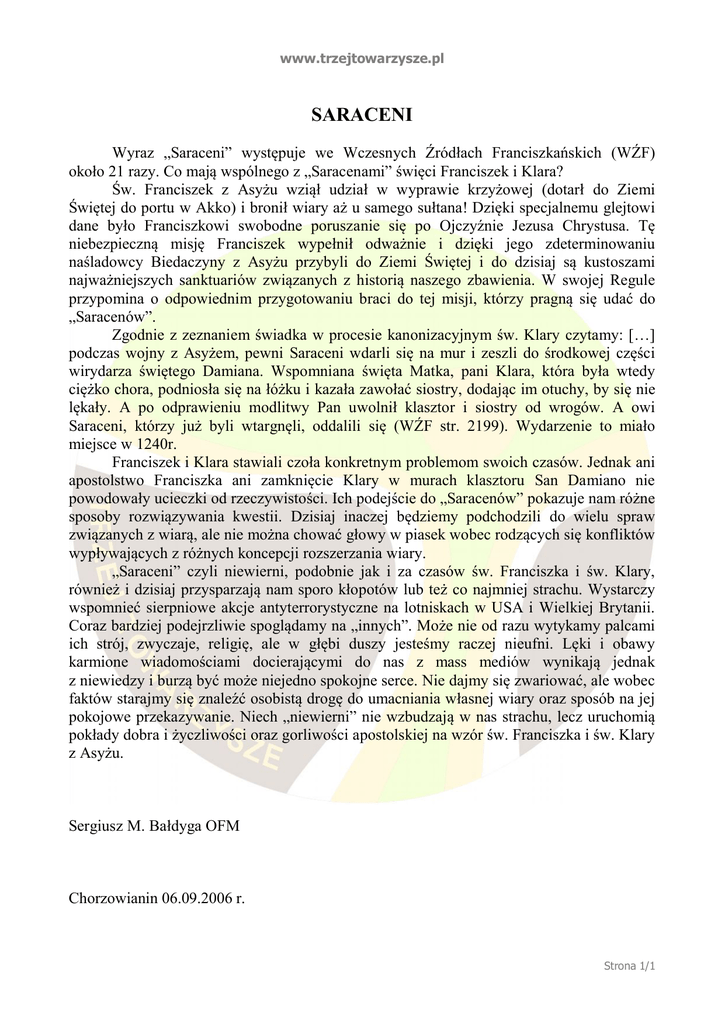 www.trzejtowarzysze.pl SARACENI Wyraz „Saraceni” występuje we Wczesnych Źródłach Franciszkańskich (WŹF) około 21 razy. Co mają wspólnego z „Saracenami” święci Franciszek i Klara? Św. Franciszek z Asyżu wziął udział w wyprawie krzyżowej (dotarł do Ziemi Świętej do portu w Akko) i bronił wiary aż u samego sułtana! Dzięki specjalnemu glejtowi dane było Franciszkowi swobodne poruszanie się po Ojczyźnie Jezusa Chrystusa. Tę niebezpieczną misję Franciszek wypełnił odważnie i dzięki jego zdeterminowaniu naśladowcy Biedaczyny z Asyżu przybyli do Ziemi Świętej i do dzisiaj są kustoszami najważniejszych sanktuariów związanych z historią naszego zbawienia. W swojej Regule przypomina o odpowiednim przygotowaniu braci do tej misji, którzy pragną się udać do „Saracenów”. Zgodnie z zeznaniem świadka w procesie kanonizacyjnym św. Klary czytamy: […] podczas wojny z Asyżem, pewni Saraceni wdarli się na mur i zeszli do środkowej części wirydarza świętego Damiana. Wspomniana święta Matka, pani Klara, która była wtedy ciężko chora, podniosła się na łóżku i kazała zawołać siostry, dodając im otuchy, by się nie lękały. A po odprawieniu modlitwy Pan uwolnił klasztor i siostry od wrogów. A owi Saraceni, którzy już byli wtargnęli, oddalili się (WŹF str. 2199). Wydarzenie to miało miejsce w 1240r. Franciszek i Klara stawiali czoła konkretnym problemom swoich czasów. Jednak ani apostolstwo Franciszka ani zamknięcie Klary w murach klasztoru San Damiano nie powodowały ucieczki od rzeczywistości. Ich podejście do „Saracenów” pokazuje nam różne sposoby rozwiązywania kwestii. Dzisiaj inaczej będziemy podchodzili do wielu spraw związanych z wiarą, ale nie można chować głowy w piasek wobec rodzących się konfliktów wypływających z różnych koncepcji rozszerzania wiary. „Saraceni” czyli niewierni, podobnie jak i za czasów św. Franciszka i św. Klary, również i dzisiaj przysparzają nam sporo kłopotów lub też co najmniej strachu. Wystarczy wspomnieć sierpniowe akcje antyterrorystyczne na lotniskach w USA i Wielkiej Brytanii. Coraz bardziej podejrzliwie spoglądamy na „innych”. Może nie od razu wytykamy palcami ich strój, zwyczaje, religię, ale w głębi duszy jesteśmy raczej nieufni. Lęki i obawy karmione wiadomościami docierającymi do nas z mass mediów wynikają jednak z niewiedzy i burzą być może niejedno spokojne serce. Nie dajmy się zwariować, ale wobec faktów starajmy się znaleźć osobistą drogę do umacniania własnej wiary oraz sposób na jej pokojowe przekazywanie. Niech „niewierni” nie wzbudzają w nas strachu, lecz uruchomią pokłady dobra i życzliwości oraz gorliwości apostolskiej na wzór św. Franciszka i św. Klary z Asyżu. Sergiusz M. Bałdyga OFM Chorzowianin 06.09.2006 r. Strona 1/1