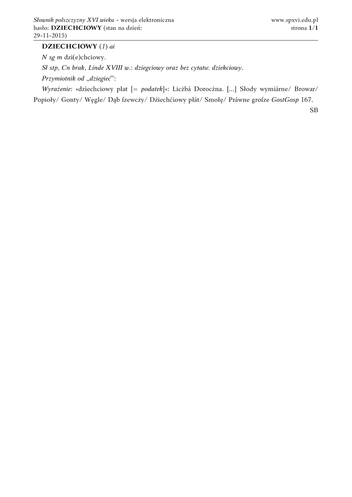 Słownik polszczyzny XVI wieku - wersja elektroniczna hasło: DZIECHCIOWY (stan na dzień: 29-11-2015) www.spxvi.edu.pl strona 1/1 DZIECHCIOWY (1) ai N sg m dzi(e)chciowy. Sł stp, Cn brak, Linde XVIII w.: dziegciowy oraz bez cytatu: dziekciowy. Przymiotnik od „dziegieć”: Wyrażenie: »dziechciowy płat [= podatek]«: Licżbá Dorocżna. [...] Słody wymiárne/ Browar/ Popioły/ Gonty/ Węgle/ Dąb ſzewcży/ Dźiechćiowy płát/ Smołę/ Práwne groſze GostGosp 167. SB