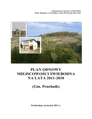 Załącznik do Uchwały Nr 38/VI/2011 Rady Miejskiej w Pruchniku z dnia 28 kwietnia 2011 roku PLAN ODNOWY MIEJSCOWOŚCI ŚWIEBODNA NA LATA 2011-2018 (Gm. Pruchnik) Świebodna, kwiecień 2011 r. Plan Odnowy Miejscowości Świebodna na lata 2011-2018 Spis treści Zakres opracowania _________________________________________________________ 4 Uczestnicy warsztatów: _______________________________________________________ 5 Diagnoza miejscowości Świebodna _____________________________________________ 6 Położenie, podział terytorialny, komunikacja, ludność i budżet_________________________ 6 Położenie geograficzne i administracyjne __________________________________________________ Komunikacja ________________________________________________________________________ Ludność ____________________________________________________________________________ Budżet wsi __________________________________________________________________________ 6 6 7 7 Środowisko____________________________________________________________________ 7 Historia ____________________________________________________________________________ 7 Znane postaci _____________________________________________________________________ 7 Dziedzictwo kulturowe i przyrodnicze ____________________________________________________ 8 Najważniejsze obiekty zabytkowe _____________________________________________________ 8 Dawne i obecne zwyczaje, tradycje ____________________________________________________ 8 Produkty lokalne żywnościowe ______________________________________________________ 11 Produkty lokalne nieżywnościowe (rzemiosło, artyści) ____________________________________ 12 Zagospodarowanie terenu _____________________________________________________________ 12 Zagospodarowanie ________________________________________________________________ 12 Klasy bonitacji gleb _______________________________________________________________ 12 Ochrona środowiska _________________________________________________________________ 12 Gospodarka __________________________________________________________________ 13 Podmioty gospodarcze________________________________________________________________ Ilość podmiotów gospodarczych _____________________________________________________ Zatrudnienie i bezrobocie _____________________________________________________________ Gospodarka komunalna i infrastruktura techniczna _________________________________________ Rolnictwo _________________________________________________________________________ Ilość gospodarstw rolnych, w tym powyżej 1 ha _________________________________________ Średnia wielkość gospodarstwa ______________________________________________________ Zasiewy _________________________________________________________________________ Hodowla ________________________________________________________________________ Struktura gospodarstw rolnych wg kierunków działalności rolniczej__________________________ Turystyka __________________________________________________________________________ 13 13 14 14 14 14 14 14 14 14 15 Sprawy społeczne _____________________________________________________________ 15 Pomoc społeczna ____________________________________________________________________ Zasoby mieszkaniowe ________________________________________________________________ Ilość mieszkań-zabudowa jednorodzinna _______________________________________________ Stan mieszkań ____________________________________________________________________ Powierzchnia użytkowa mieszkania ___________________________________________________ Sytuacja mieszkaniowa _______________________________________________________________ Przedszkola ________________________________________________________________________ Szkolnictwo ________________________________________________________________________ Ochrona zdrowia i opieka społeczna _____________________________________________________ Kultura i sport ______________________________________________________________________ Bezpieczeństwo publiczne _____________________________________________________________ Pomoc społeczna ____________________________________________________________________ Stowarzyszenia i inne organizacje pozarządowe ____________________________________________ 15 15 15 15 16 16 16 16 16 16 17 17 17 Analiza SWOT ____________________________________________________________ 19 Wizja (rok 2018) ___________________________________________________________ 20 Cele _____________________________________________________________________ 20 2 Plan Odnowy Miejscowości Świebodna na lata 2011-2018 1. Stworzenie bazy agroturystyczno-kulturalno- społecznej, ________________________ 20 2. Ochrona dziedzictwa przyrodniczo-kulturowego oraz rozwój oferty spędzania wolnego czasu, _______________________________________________________________________ 20 3. Stworzenie zaplecza do rozwoju przedsiębiorstw, ukształtowanie obszaru przestrzeni publicznej, rozwój energii odnawialnej. ___________________________________________ 20 Plan zadań do realizacji na lata 2011-2018 _____________________________________ 21 Wdrożenie, promocja i monitorowanie _________________________________________ 25 3 Plan Odnowy Miejscowości Świebodna na lata 2011-2018 Zakres opracowania Plan Odnowy Miejscowości Świebodna jest dokumentem strategicznym określającym rozwój wsi w sferze społeczno ‐ gospodarczej na lata 2011 ‐ 2018, poprzez realizację zadań ujętych w trzy cele: 1. Stworzenie bazy agroturystyczno-kulturalno- społecznej, 2. Ochrona dziedzictwa przyrodniczo-kulturowego oraz rozwój oferty spędzania wolnego czasu, 3. Stworzenie zaplecza do rozwoju przedsiębiorstw, ukształtowanie obszaru przestrzeni publicznej, rozwój energii odnawialnej. Plan Odnowy Miejscowości Świebodna w gminie Pruchnik powstał w wyniku konsultacji z mieszkańcami. Zgodnie z projektem Rozporządzenia Ministra Rolnictwa i Rozwoju Wsi „w sprawie szczegółowych