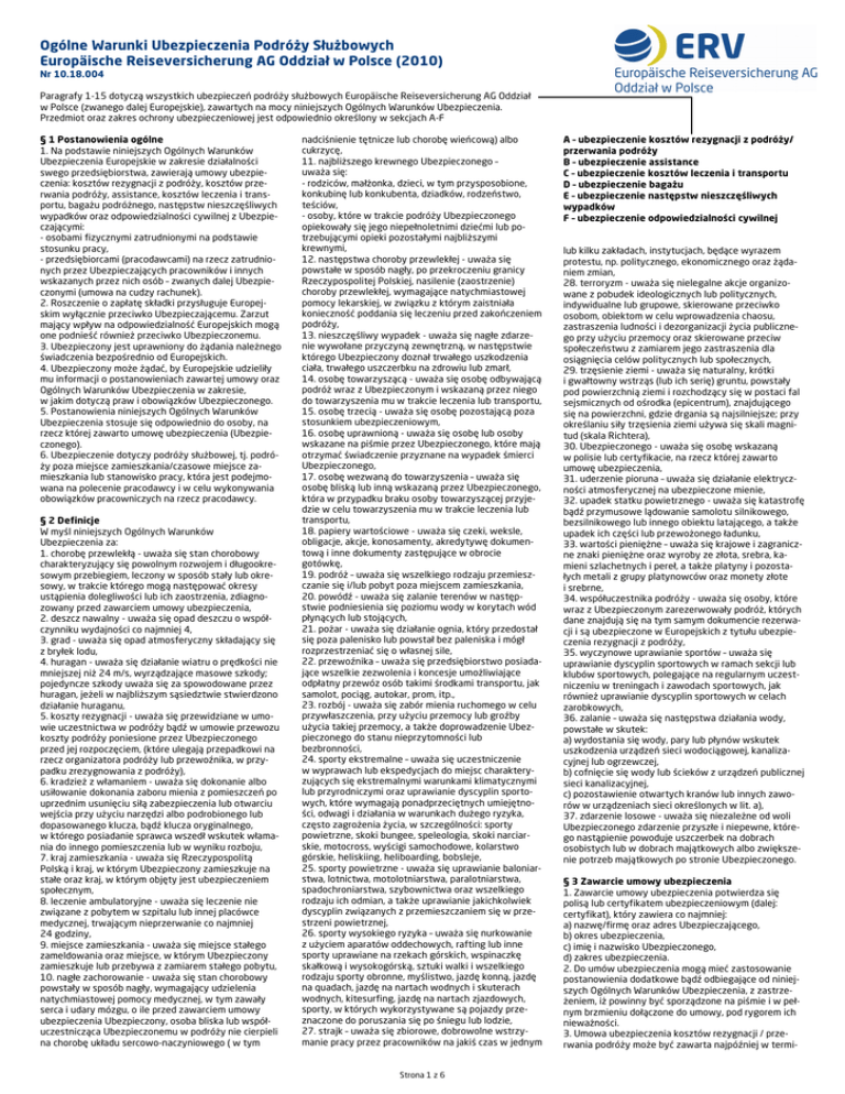 Ogólne Warunki Ubezpieczenia Podróży Służbowych Europäische Reiseversicherung AG Oddział w Polsce (2010) Nr 10.18.004 Paragrafy 1-15 dotyczą wszystkich ubezpieczeń podróży służbowych Europäische Reiseversicherung AG Oddział w Polsce (zwanego dalej Europejskie), zawartych na mocy niniejszych Ogólnych Warunków Ubezpieczenia. Przedmiot oraz zakres ochrony ubezpieczeniowej jest odpowiednio określony w sekcjach A-F § 1 Postanowienia ogólne 1. Na podstawie niniejszych Ogólnych Warunków Ubezpieczenia Europejskie w zakresie działalności swego przedsiębiorstwa, zawierają umowy ubezpieczenia: kosztów rezygnacji z podróży, kosztów przerwania podróży, assistance, kosztów leczenia i transportu, bagażu podróżnego, następstw nieszczęśliwych wypadków oraz odpowiedzialności cywilnej z Ubezpieczającymi: - osobami fizycznymi zatrudnionymi na podstawie stosunku pracy, - przedsiębiorcami (pracodawcami) na rzecz zatrudnionych przez Ubezpieczających pracowników i innych wskazanych przez nich osób – zwanych dalej Ubezpieczonymi (umowa na cudzy rachunek). 2. Roszczenie o zapłatę składki przysługuje Europejskim wyłącznie przeciwko Ubezpieczającemu. Zarzut mający wpływ na odpowiedzialność Europejskich mogą one podnieść również przeciwko Ubezpieczonemu. 3. Ubezpieczony jest uprawniony do żądania należnego świadczenia bezpośrednio od Europejskich. 4. Ubezpieczony może żądać, by Europejskie udzieliły mu informacji o postanowieniach zawartej umowy oraz Ogólnych Warunków Ubezpieczenia w zakresie, w jakim dotyczą praw i obowiązków Ubezpieczonego. 5. Postanowienia niniejszych Ogólnych Warunków Ubezpieczenia stosuje się odpowiednio do osoby, na rzecz której zawarto umowę ubezpieczenia (Ubezpieczonego). 6. Ubezpieczenie dotyczy podróży służbowej, tj. podróży poza miejsce zamieszkania/czasowe miejsce zamieszkania lub stanowisko pracy, która jest podejmowana na polecenie pracodawcy i w celu wykonywania obowiązków pracowniczych na rzecz pracodawcy. § 2 Definicje W myśl niniejszych Ogólnych Warunków Ubezpieczenia za: 1. chorobę przewlekłą - uważa się stan chorobowy charakteryzujący się powolnym rozwojem i długookresowym przebiegiem, leczony w sposób stały lub okresowy, w trakcie którego mogą następować okresy ustąpienia dolegliwości lub ich zaostrzenia, zdiagnozowany przed zawarciem umowy ubezpieczenia, 2. deszcz nawalny - uważa się opad deszczu o współczynniku wydajności co najmniej 4, 3. grad - uważa się opad atmosferyczny składający się z bryłek lodu, 4. huragan - uważa się działanie wiatru o prędkości nie mniejszej niż 24 m/s, wyrządzające masowe szkody; pojedyncze szkody uważa się za spowodowane przez huragan, jeżeli w najbliższym sąsiedztwie stwierdzono działanie huraganu, 5. koszty rezygnacji - uważa się przewidziane w umowie uczestnictwa w podróży bądź w umowie przewozu koszty podróży poniesione przez Ubezpieczonego przed jej rozpoczęciem, (które ulegają przepadkowi na rzecz organizatora podróży lub przewoźnika, w przypadku zrezygnowania z podróży), 6. kradzież z włamaniem - uważa się dokonanie albo usiłowanie dokonania zaboru mienia z pomieszczeń po uprzednim usunięciu siłą zabezpieczenia lub otwarciu wejścia przy użyciu narzędzi albo podrobionego lub dopasowanego klucza, bądź klucza oryginalnego, w którego posiadanie sprawca wszedł wskutek włamania do innego pomieszczenia lub w wyniku rozboju, 7. kraj zamieszkania - uważa się Rzeczypospolitą Polską i kraj, w którym Ubezpieczony zamieszkuje na stałe oraz kraj, w którym objęty jest ubezpieczeniem społecznym, 8. leczenie ambulatoryjne - uważa się leczenie nie związane z pobytem w szpitalu lub innej placówce medycznej, trwającym nieprzerwanie co najmniej 24 godziny, 9. miejsce zamieszkania - uważa się miejsce stałego zameldowania oraz miejsce, w którym Ubezpieczony zamieszkuje lub przebywa z zamiarem stałego pobytu, 10. nagłe zachorowanie - uważa się stan chorobowy powstały w sposób nagły, wymagający udzielenia natychmiastowej pomocy medycznej, w tym zawały serca i udary mózgu, o ile przed zawarciem umowy ubezpieczenia Ubezpieczony, osoba bliska lub współuczestnicząca Ubezpieczonemu w podróży nie cierpieli na chorobę układu sercowo-naczyniowego ( w tym nadciśnienie tętnicze lub chorobę wieńcową) albo cukrzycę, 11. najbliższego krewnego Ubezpieczonego – uważa się: - rodziców, małżonka, dzieci, w tym przysposobione, konkubinę lub konkubenta, dziadków, rodzeństwo, teściów, - osoby, które w trakcie podróży Ubezpieczonego opiekowały się jego niepełnoletnimi dziećmi lub potrzebującymi opieki pozostałymi najbliższymi krewnymi, 12. następstwa choroby przewlekłej - uważa się powstałe w sposób nagły, po przekroczeniu granicy Rzeczypospolitej Polskiej, nasilenie (zaostrzenie) choroby przewlekłej, wymagające natychmiastowej pomocy lekarskiej, w związku z którym zaistniała konieczność poddania się leczeniu przed zakończeniem podróży, 13. nieszczęśliwy wypadek - uważa się nagłe zdarzenie wywołane przyczyną zewnętrzną, w następstwie którego Ubezpieczony doznał trwałego uszkodzenia ciała, trwałego uszczerbku na zdrowiu lub zmarł, 14. osobę towarzyszącą - uważa się osobę odbywającą podróż wraz z Ubezpieczonym i wskazaną przez niego do towarzyszenia mu w trakcie leczenia lub transportu, 15. osobę trzecią - uważa się osobę pozostającą poza stosunkiem ubezpieczeniowym, 16. osobę uprawnioną - uważa się osobę lub osoby wskazane na piśmie przez Ubezpieczonego, które mają otrzymać świadczenie przyznane na wypadek śmierci Ubezpieczonego, 17. osobę wezwaną do towarzyszenia – uważa się osobę bliską lub inną wskazaną przez Ubezpieczonego, która w przypadku braku osoby towarzyszącej przyjedzie w celu towarzyszenia mu w trakcie leczenia lub transportu, 18. papiery wartościowe - uważa się czeki