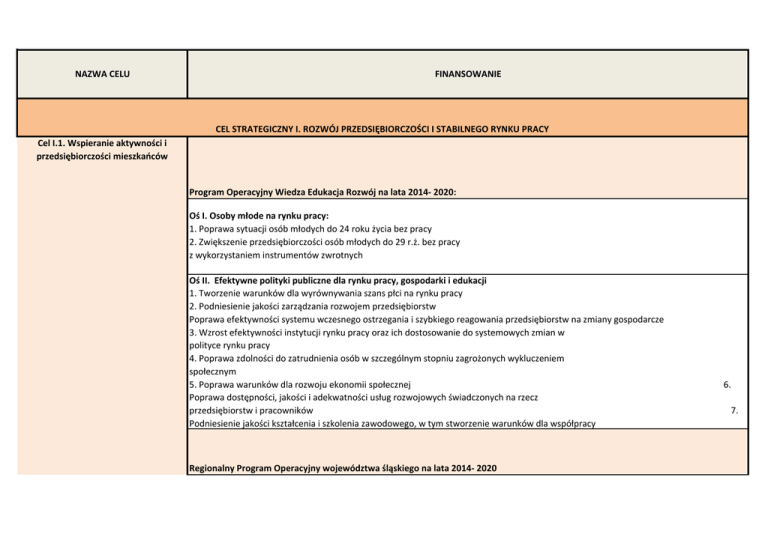 NAZWA CELU FINANSOWANIE CEL STRATEGICZNY I. ROZWÓJ PRZEDSIĘBIORCZOŚCI I STABILNEGO RYNKU PRACY Cel I.1. Wspieranie aktywności i przedsiębiorczości mieszkańców Program Operacyjny Wiedza Edukacja Rozwój na lata 2014- 2020: Oś I. Osoby młode na rynku pracy: 1. Poprawa sytuacji osób młodych do 24 roku życia bez pracy 2. Zwiększenie przedsiębiorczości osób młodych do 29 r.ż. bez pracy z wykorzystaniem instrumentów zwrotnych Oś II. Efektywne polityki publiczne dla rynku pracy, gospodarki i edukacji 1. Tworzenie warunków dla wyrównywania szans płci na rynku pracy 2. Podniesienie jakości zarządzania rozwojem przedsiębiorstw Poprawa efektywności systemu wczesnego ostrzegania i szybkiego reagowania przedsiębiorstw na zmiany gospodarcze 3. Wzrost efektywności instytucji rynku pracy oraz ich dostosowanie do systemowych zmian w polityce rynku pracy 4. Poprawa zdolności do zatrudnienia osób w szczególnym stopniu zagrożonych wykluczeniem społecznym 5. Poprawa warunków dla rozwoju ekonomii społecznej Poprawa dostępności, jakości i adekwatności usług rozwojowych świadczonych na rzecz przedsiębiorstw i pracowników Podniesienie jakości kształcenia i szkolenia zawodowego, w tym stworzenie warunków dla współpracy Regionalny Program Operacyjny województwa śląskiego na lata 2014- 2020 6. 7. Oś I. Nowoczesna gospodarka Badania, rozwój i innowacje w przedsiębiorstwach: lub rozwój istniejącego zaplecza badawczo-rozwojowego w przedsiębiorstwach służącego ich działalności innowacyjnej, wsparcie prac B+R w przedsiębiorstwach Profesjonalizacja IOB: rozwój usług świadczonych przez instytucja otoczenia biznesu, rozwój i udostępnianie niezbędnej infrastruktury (w tym laboratoria) istniejących instytucji otoczenia biznesu. Oś III. Konkurencyjność MŚP promowanie przedsiębiorczości, w szczególności poprzez ułatwianie gospodarczego wykorzystywania nowych pomysłów oraz sprzyjanie tworzeniu nowych firm, w tym również poprzez inkubatory przedsiębiorczości; wspieranie tworzenia i poszerzania zaawansowanych zdolności w zakresie rozwoju produktów i usług tworzenie Oś VII Regionalny rynek pracy dostęp do zatrudnienia dla osób poszukujących pracy i biernych zawodowo, w tym długotrwale bezrobotnych oraz oddalonych od rynku pracy, także poprzez lokalne inicjatywy na rzecz zatrudnienia oraz wspieranie mobilności pracowników; praca na własny rachunek, przedsiębiorczość i tworzenie przedsiębiorstw, w tym innowacyjnych mikro-, małych i średnich przedsiębiorstw; przystosowanie pracowników, przedsiębiorstw i przedsiębiorców do zmian Oś VIII. Regionalne kadry gospodarki opartej na wiedzy równość mężczyzn i kobiet we wszystkich dziedzinach, w tym dostęp do zatrudnienia, rozwój kariery, godzenie życia zawodowego i prywatnego oraz promowanie równości wynagrodzeń za taką samą pracę; przystosowanie pracowników, przedsiębiorstw i przedsiębiorców do zmian; aktywne i zdrowe starzenie się. PROGRAM ROZWOJU OBSZARÓW WIEJSKICH NA LATA 2014- 2020 Zwiększenie liczby konkurencyjnych gospodarstw rolnych; Reorientacja małych gospodarstw w kierunku rolniczym lub pozarolniczym; Poprawa jakości produktów rolnych i żywnościowych; Odtwarzanie i zachowanie różnorodności biologicznej, w tym na obszarach NATURA 2000 i obszarach o utrudnieniach naturalnych; Promowanie zrównoważonych metod gospodarowania: rolnictwo zrównoważone i rolnictwo ekologiczne; Wzrost innowacyjności, unowocześnienie sektora rolno-spożywczego oraz podniesienie poziomu wiedzy producentów rolnych Cel I.2. Wspieranie atrakcyjności inwestycyjnej gminy Cel I.3. Wspieranie rozwoju turystycznego gminy Ślemień BRAK FINANSOWANIA Z FUNDUSZY UNIJNYCH Regionalny Program Operacyjny województwa śląskiego na lata 2014- 2020 Oś III. Konkurencyjność MŚP tworzenia i poszerzania zaawansowanych zdolności w zakresie rozwoju produktów i usług Ochrona środowiska i efektywne korzystanie z zasobów ochrona, promowanie i rozwój dziedzictwa naturalnego i kulturowego wspieranie Oś V. zachowanie, PROGRAM ROZWOJU OBSZARÓW WIEJSKICH NA LATA 2014- 2020 Tworzenie możliwości zatrudnienia poza rolnictwem bez zmiany miejsca zamieszkania CEL STRATEGICZNY II. ROZWÓJ BEZPIECZEŃSTWA SOCJALNEGO, ZDROWOTNEGO I PUBLICZNEGO Program Operacyjny Wiedza Edukacja Rozwój na lata 2014- 2020: Oś II. Efektywne polityki publiczne dla rynku pracy, gospodarki i edukacji 1. Poprawa świadomości zdrowotnej społeczeństwa oraz wykrywalności chorób negatywnie wpływających na zasoby pracy Zwiększenie bezpieczeństwa i efektywności systemu ochrony zdrowia Cel II.1. Poprawa jakości i dostępności Zapewnienie wykwalifikowanych kadr medycznych odpowiadających na potrzeby epidemiologicznodemograficzne kraju usług zdrowotnych i opiekuńczych Regionalny Program Operacyjny województwa śląskiego na lata 2014- 2020 Cyfrowe Śląskie: wzmocnienie zastosowań TIK dla e-administracji, euczenia się, e-włączenia społecznego, e-kultury i e-zdrowia Oś IX. Włączanie społeczne: aktywne włączenie, w tym z myślą o promowaniu równych szans oraz aktywnego uczestnictwa i zwiększaniu szans na zatrudnienie; ułatwianie dostępu do przystępnych cenowo, trwałych oraz wysokiej jakości usług, w tym opieki zdrowotnej i usług socjalnych świadczonych w interesie ogólnym; wspieranie przedsiębiorczości społecznej i integracji zawodowej w przedsiębiorstwach społecznych oraz ekonomii społecznej i solidarnej w celu ułatwiania dostępu do zatrudnienia cel II.2. Przeciwdziałanie wykluczeniu społecznemu i ubóstwu 2. 3. Oś II. cel II.2. Przeciwdziałanie wykluczeniu społecznemu i ubóstwu Cel II.3. Poprawa bezpieczeństwa mieszkańców w miejscach publicznych Oś X. Rewitalizacja oraz infrastruktura społeczna i zdrowotna: inwestycje w infrastrukturę zdrowotną i społeczną, które przyczyniają się do rozwoju krajowego, regionalnego i lokalnego, zmniejszania nierówności w 