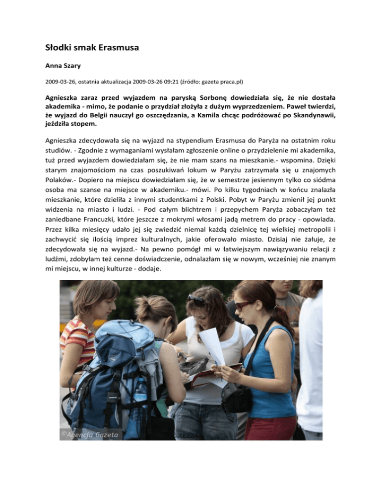 Słodki smak Erasmusa Anna Szary 2009-03-26, ostatnia aktualizacja 2009-03-26 09:21 (źródło: gazeta praca.pl) Agnieszka zaraz przed wyjazdem na paryską Sorbonę dowiedziała się, że nie dostała akademika - mimo, że podanie o przydział złożyła z dużym wyprzedzeniem. Paweł twierdzi, że wyjazd do Belgii nauczył go oszczędzania, a Kamila chcąc podróżować po Skandynawii, jeździła stopem. Agnieszka zdecydowała się na wyjazd na stypendium Erasmusa do Paryża na ostatnim roku studiów. - Zgodnie z wymaganiami wysłałam zgłoszenie online o przydzielenie mi akademika, tuż przed wyjazdem dowiedziałam się, że nie mam szans na mieszkanie.- wspomina. Dzięki starym znajomościom na czas poszukiwań lokum w Paryżu zatrzymała się u znajomych Polaków.- Dopiero na miejscu dowiedziałam się, że w semestrze jesiennym tylko co siódma osoba ma szanse na miejsce w akademiku.- mówi. Po kilku tygodniach w końcu znalazła mieszkanie, które dzieliła z innymi studentkami z Polski. Pobyt w Paryżu zmienił jej punkt widzenia na miasto i ludzi. - Pod całym blichtrem i przepychem Paryża zobaczyłam też zaniedbane Francuzki, które jeszcze z mokrymi włosami jadą metrem do pracy - opowiada. Przez kilka miesięcy udało jej się zwiedzić niemal każdą dzielnicę tej wielkiej metropolii i zachwycić się ilością imprez kulturalnych, jakie oferowało miasto. Dzisiaj nie żałuje, że zdecydowała się na wyjazd.- Na pewno pomógł mi w łatwiejszym nawiązywaniu relacji z ludźmi, zdobyłam też cenne doświadczenie, odnalazłam się w nowym, wcześniej nie znanym mi miejscu, w innej kulturze - dodaje. Biurokracja i starcie z nową rzeczywistością Agnieszka decyzję na wyjazd podjęła w ciągu kilku miesięcy. Tak jak w przypadku wielu innych studentów, motywacją do wyjazdu była chęć podniesienia kwalifikacji językowych, ale też poznania innej kultury i ludzi. Szczęśliwie przeszła proces rekrutacyjny na swojej uczelni i zdobyła stypendium na semestr studiów, na socjologii, na paryskiej Sorbonie. Jak się okazuje obecnie szanse na otrzymanie stypendium na krajowych uczelniach są co raz większe, wszystko za sprawą mniejszych wymagań, a co raz częściej też braku chętnych. -Tegoroczna kwalifikacja jeszcze trwa, ale porównując początki Erasmusa, mogę powiedzieć, że wyjechać na stypendium jest teraz znacznie łatwiej. - wyjaśnia Sylwia Salamon, kierownik i koordynator Biura Wyjazdów Zagranicznych na Uniwersytecie Warszawskim. Z informacji Fundacji Rozwoju Systemu Edukacji, która zajmuje się obsługą programów współpracy zagranicznej wynika, że największym zainteresowaniem polskich studentów cieszą się kraje, gdzie nauka odbywa się w języku angielskim. Jednak możliwości wyboru uczelni i kraju zależą od umów partnerskich, które dana uczelnia i wydział podpisuje z uczelnią przyjmującą za granicą. - Największa liczba polskich studentów wyjeżdżających w programie Erasmus przyjmowana jest od wielu lat przez uczelnie w Niemczech. - mówi Beata Skibińska koordynatorka Programu Erasmus z Narodowej Agencji LLP - Erasmus w Warszawie. Podobnego zdania jest koordynatorka wyjazdów na UW. - Tradycyjne uczelnie brytyjskie to na pewno marzenie wielu studentów, sporo osób też wyjeżdża na uczelnie niemieckie, z którymi mamy podpisanych dużo umów, tam na pewno wymiana jest największa.- mówi Sylwia Salamon. Na wyjazd ma szansę teoretycznie każdy, kto nie studiuje na pierwszym roku i nie posiada wpisu warunkowego. O stypendium mogą ubiegać się zarówno studenci dzienni, wieczorowi, jak i zaoczni. Mimo to na wyjazd stypendialny decyduje się co raz mniej osób. - Moim zdaniem zainteresowanie tym stypendium się zmniejsza (w zeszłym roku na 1800 miejsc stypendialnych, aż 600 zostało nieobsadzonych na UW- przyp. red.), spowodowane jest to na pewno relatywnie niską wysokością stypendium.- mówi Sylwia Salamon. Wysokość kwot przyznawanych na wyjazd uzależniona jest od miejsca wyjazdu, dofinansowania z uczelni oraz środków pochodzących z Narodowej Agencji Erasmus. Okazuje się zazwyczaj, że za niskie stypendium to nie przeszkoda, żeby wyjechać - studenci na Erasmusie radzą sobie, jak mogą, żeby przetrwać zwłaszcza wtedy, gdy stypendium w danym kraju wystarcza zwykle na opłacenie mieszkania i obiadu na stołówce. Zaradny jak Erazmus Na Erasmusie okazuje się, że nie tylko Polak potrafi. Studenci z całego świata kombinują, jak przetrwać mając za mało pieniędzy, albo jak maksymalnie wykorzystać towarzysko czas na imprezy i podróże, jakie daje ta - pewnego rodzaju - kolonia dla dorosłych. W Finlandii ci, którzy przyjadą w semestrze jesiennym, mają szansę pracować jako asystenci na uczelni (ale konkurencja jest duża), w innych krajach studenci dorabiają tłumaczeniami, albo zatrudniają się jako pomoc do sprzątania. - Muszę przyznać że Erasmus nauczył mnie oszczędności.mówi Paweł, który spędził semestr na Uniwersytecie w Belgii. - Do stypendium na szczęście nie musiałem dorabiać, co najwyżej dokładałem z "kieszonkowego" jakieś 100 euro miesięcznie.- dodaje. Nie wszyscy jednak mogą pozwolić sobie na taki komfort. - Do stypendium, które wynosiło 350 euro, z czego 250 przeznaczałam na opłatę za mieszkanie, dorabiałam sobie pracą dorywczą.- opowiada Agnieszka. - Raz w tygodniu jeździłam na obrzeża Paryża pracować na około 2 godzin jako pomoc domowa - wspomina. - Dzięki temu dorabiałam sobie do stypendium ok. 80 euro miesięcznie - dodaje. Na pomoc nie tylko finansową można w niektórych krajach liczyć ze strony innych studentów. W Finlandii żacy mieszkający w tzw. Student Village, często kończąc pobyt, dzielą się niezbędnymi do życia rzeczami z innymi Erasmusami. Ktoś zostawia poduszkę, inny środki chemiczne, czasem trafia się sofa lub telewizor. - W Skandynawii dobrą metodą na oszczędzanie jest kupno rzeczy używanych, na przykład roweru