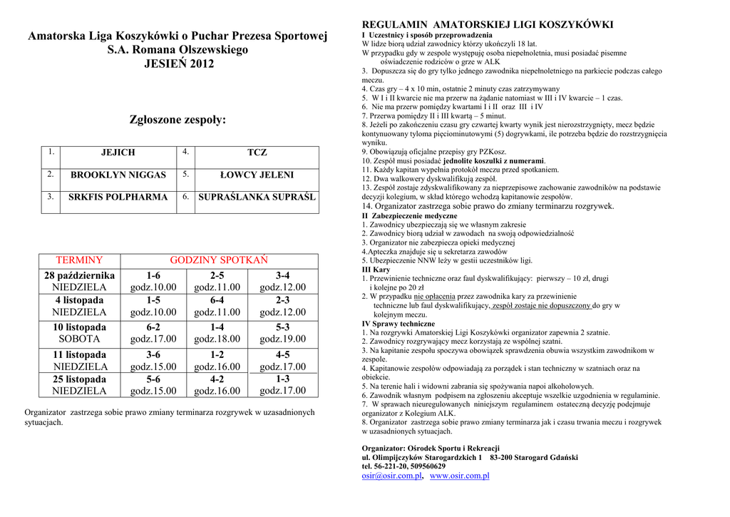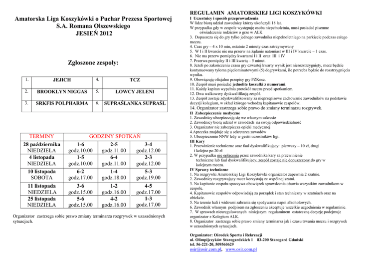 Amatorska Liga Koszykówki o Puchar Prezesa Sportowej S.A. Romana Olszewskiego JESIEŃ 2012 Zgłoszone zespoły: 1. JEJICH 4. TCZ 2. BROOKLYN NIGGAS 5. ŁOWCY JELENI 3. SRKFIS POLPHARMA 6. SUPRAŚLANKA SUPRAŚL REGULAMIN AMATORSKIEJ LIGI KOSZYKÓWKI I Uczestnicy i sposób przeprowadzenia W lidze biorą udział zawodnicy którzy ukończyli 18 lat. W przypadku gdy w zespole występuję osoba niepełnoletnia, musi posiadać pisemne oświadczenie rodziców o grze w ALK 3. Dopuszcza się do gry tylko jednego zawodnika niepełnoletniego na parkiecie podczas całego meczu. 4. Czas gry – 4 x 10 min, ostatnie 2 minuty czas zatrzymywany 5. W I i II kwarcie nie ma przerw na żądanie natomiast w III i IV kwarcie – 1 czas. 6. Nie ma przerw pomiędzy kwartami I i II oraz III i IV 7. Przerwa pomiędzy II i III kwartą – 5 minut. 8. Jeżeli po zakończeniu czasu gry czwartej kwarty wynik jest nierozstrzygnięty, mecz będzie kontynuowany tyloma pięciominutowymi (5) dogrywkami, ile potrzeba będzie do rozstrzygnięcia wyniku. 9. Obowiązują oficjalne przepisy gry PZKosz. 10. Zespół musi posiadać jednolite koszulki z numerami. 11. Każdy kapitan wypełnia protokół meczu przed spotkaniem. 12. Dwa walkowery dyskwalifikują zespół. 13. Zespół zostaje zdyskwalifikowany za nieprzepisowe zachowanie zawodników na podstawie decyzji kolegium, w skład którego wchodzą kapitanowie zespołów. 14. Organizator zastrzega sobie prawo do zmiany terminarzu rozgrywek. TERMINY 28 października NIEDZIELA 4 listopada NIEDZIELA 10 listopada SOBOTA 11 listopada NIEDZIELA 25 listopada NIEDZIELA GODZINY SPOTKAŃ 1-6 2-5 3-4 godz.10.00 godz.11.00 godz.12.00 1-5 6-4 2-3 godz.10.00 godz.11.00 godz.12.00 6-2 1-4 5-3 godz.17.00 godz.18.00 godz.19.00 3-6 godz.15.00 5-6 godz.15.00 1-2 godz.16.00 4-2 godz.16.00 4-5 godz.17.00 1-3 godz.17.00 Organizator zastrzega sobie prawo zmiany terminarza rozgrywek w uzasadnionych sytuacjach. II Zabezpieczenie medyczne 1. Zawodnicy ubezpieczają się we własnym zakresie 2. Zawodnicy biorą udział w zawodach na swoją odpowiedzialność 3. Organizator nie zabezpiecza opieki medycznej 4.Apteczka znajduje się u sekretarza zawodów 5. Ubezpieczenie NNW leży w gestii uczestników ligi. III Kary 1. Przewinienie techniczne oraz faul dyskwalifikujący: pierwszy – 10 zł, drugi i kolejne po 20 zł 2. W przypadku nie opłacenia przez zawodnika kary za przewinienie techniczne lub faul dyskwalifikujący, zespół zostaje nie dopuszczony do gry w kolejnym meczu. IV Sprawy techniczne 1. Na rozgrywki Amatorskiej Ligi Koszykówki organizator zapewnia 2 szatnie. 2. Zawodnicy rozgrywający mecz korzystają ze wspólnej szatni. 3. Na kapitanie zespołu spoczywa obowiązek sprawdzenia obuwia wszystkim zawodnikom w zespole. 4. Kapitanowie zespołów odpowiadają za porządek i stan techniczny w szatniach oraz na obiekcie. 5. Na terenie hali i widowni zabrania się spożywania napoi alkoholowych. 6. Zawodnik własnym podpisem na zgłoszeniu akceptuje wszelkie uzgodnienia w regulaminie. 7. W sprawach nieuregulowanych niniejszym regulaminem ostateczną decyzję podejmuje organizator z Kolegium ALK. 8. Organizator zastrzega sobie prawo zmiany terminarza jak i czasu trwania meczu i rozgrywek w uzasadnionych sytuacjach. Organizator: Ośrodek Sportu i Rekreacji ul. Olimpijczyków Starogardzkich 1 83-200 Starogard Gdański tel. 56-221-20, 509560629 [email protected], www.osir.com.pl
