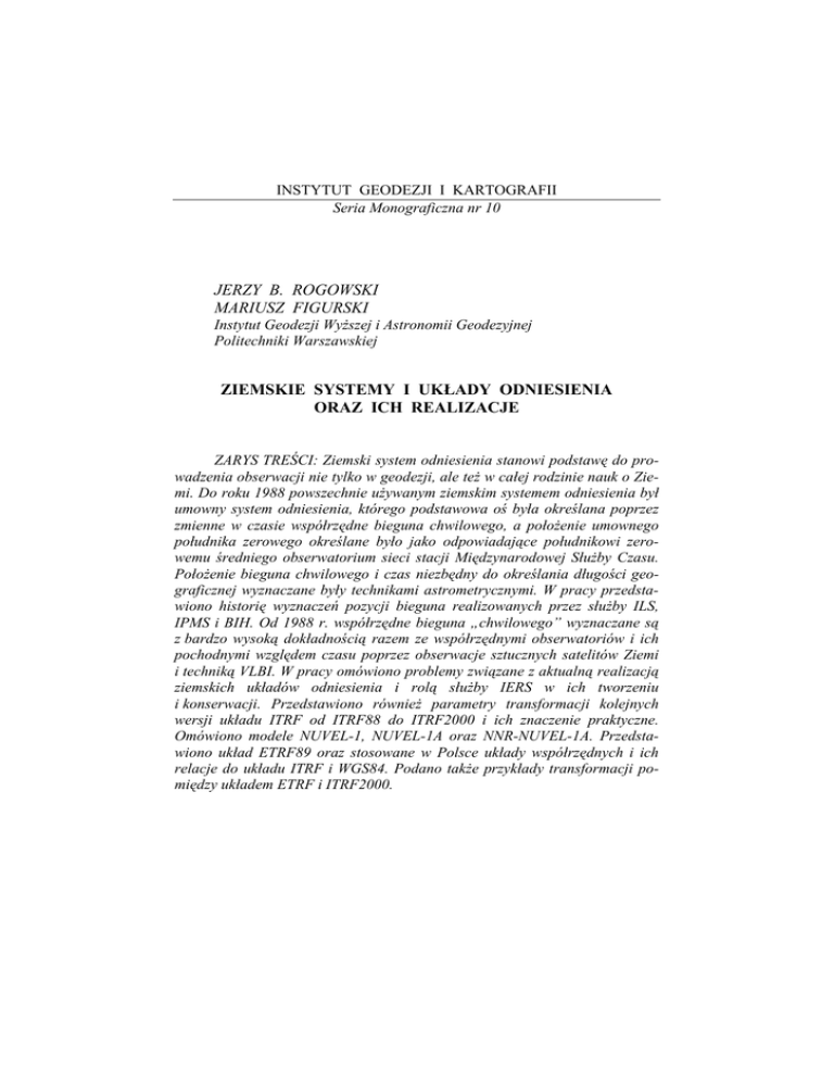 INSTYTUT GEODEZJI I KARTOGRAFII Seria Monograficzna nr 10 JERZY B. ROGOWSKI MARIUSZ FIGURSKI Instytut Geodezji Wyższej i Astronomii Geodezyjnej Politechniki Warszawskiej ZIEMSKIE SYSTEMY I UKŁADY ODNIESIENIA ORAZ ICH REALIZACJE ZARYS TREŚCI: Ziemski system odniesienia stanowi podstawę do prowadzenia obserwacji nie tylko w geodezji, ale też w całej rodzinie nauk o Ziemi. Do roku 1988 powszechnie używanym ziemskim systemem odniesienia był umowny system odniesienia, którego podstawowa oś była określana poprzez zmienne w czasie współrzędne bieguna chwilowego, a położenie umownego południka zerowego określane było jako odpowiadające południkowi zerowemu średniego obserwatorium sieci stacji Międzynarodowej Służby Czasu. Położenie bieguna chwilowego i czas niezbędny do określania długości geograficznej wyznaczane były technikami astrometrycznymi. W pracy przedstawiono historię wyznaczeń pozycji bieguna realizowanych przez służby ILS, IPMS i BIH. Od 1988 r. współrzędne bieguna „chwilowego” wyznaczane są z bardzo wysoką dokładnością razem ze współrzędnymi obserwatoriów i ich pochodnymi względem czasu poprzez obserwacje sztucznych satelitów Ziemi i techniką VLBI. W pracy omówiono problemy związane z aktualną realizacją ziemskich układów odniesienia i rolą służby IERS w ich tworzeniu i konserwacji. Przedstawiono również parametry transformacji kolejnych wersji układu ITRF od ITRF88 do ITRF2000 i ich znaczenie praktyczne. Omówiono modele NUVEL-1, NUVEL-1A oraz NNR-NUVEL-1A. Przedstawiono układ ETRF89 oraz stosowane w Polsce układy współrzędnych i ich relacje do układu ITRF i WGS84. Podano także przykłady transformacji pomiędzy układem ETRF i ITRF2000. 38 1. Jerzy B. Rogowski, Mariusz Figurski SŁUŻBY ILS, IPMS I BIH I ICH ROLA W TWORZENIU I KONSERWACJI ZIEMSKIEGO UKŁADU ODNIESIENIA Rozwój naziemnych technik pomiarowych, pozwalających rozwijać sieci geodezyjne na dużych obszarach, spowodował konieczność zapewnienia równoległości osi układu współrzędnych astronomicznych do osi obrotu elipsoidy odniesienia. Równoległość ta jest spełniona dzięki stosowaniu równania Laplace’a (1) do redukcji azymutów na elipsoidę odniesienia (Heiskanen i Moritz 1966): A – α = (Λ – λ) sinφ (1) gdzie: A i Λ – azymut i długość astronomiczna, α, φ i λ – odpowiednio azymut, szerokość i długość geodezyjna. Problem skomplikował się po opracowaniu przez Eulera w 1758 r. modelu matematycznego przemieszczania się osi obrotu względem bryły ziemskiej (tzw. nutacji swobodnej). W związku z tym powstała konieczność określania położenia chwilowej osi obrotu Ziemi względem umownego ziemskiego układu odniesienia oraz konieczność redukcji wyznaczanych współrzędnych astronomicznych i azymutów do tego układu. Ze względu na wiele czynników, które zaburzały ruch bieguna opisany przez model matematyczny Eulera, wynikła potrzeba wyznaczania współrzędnych chwilowego bieguna Ziemi w sposób obserwacyjny. Biorąc powyższe pod uwagę, Międzynarodowa Asocjacja Geodezji (IAG) w 1899 r. powołała Międzynarodową Służbę Szerokości (International Latitude Service, ILS). Biegun, który został określony na podstawie obserwacji zmian szerokości astronomicznych z lat 1900–1905, wyznaczył kierunek osi podstawowej pierwszego umownego układu odniesienia, definiowany przez pozycje (średnie szerokości astronomiczne) pięciu stacji obserwacyjnych ILS: Carloforte (Włochy), Gaithersburg i Ukiah (USA), Kitab (Rosja), Mizusawa (Japonia), umieszczonych na równoleżniku 39°08′ (Mueller 1969). Umowny południk zerowy został określony kilkanaście lat później. Wiązało się to z technicznymi możliwościami wyznaczania długości astronomicznej, wymagającej możliwości transferu czasu Greenwich. Do zrealizowania tego zadania powołano w 1912 r. Międzynarodowe Biuro Czasu (Bureau International de l’Heure, BIH). W tym okresie w zdecydowanej większości przypadków czas wyznaczano z obserwacji astronomicznych (Mueller 1969). Ten pierwszy umowny ziemski układ odniesienia posiadał zasadniczą wadę. Określał on jedynie położenie osi układu, ale nie definiował jednoznacznie położenia początku układu. Układ ten był więc układem swobodnym i zapewniał jedynie równoległość osi umownych: kontynentalnych, regionalnych i lokalnych układów odniesienia do osi globalnego ziemskiego układu odniesienia. Ziemskie systemy i układy odniesienia oraz ich realizacje 39 Kolejnym etapem praktycznej realizacji ziemskich układów odniesienia technikami tradycyjnymi był układ odniesienia opracowany z obserwacji wykonanych w ramach, powołanej w 1962 r. Międzynarodowej Służby Ruchu Bieguna (International Polar Motion Service, IPMS), stanowiącej rozwinięcie służby ILS poprzez włączenie do niej kilkudziesięciu obserwatoriów leżących na innych równoleżnikach. Bardzo istotnym etapem rozwoju układów odniesienia realizowanych za pomocą technik tradycyjnych było przygotowanie przez BIH w 1968 r. metody łącznego opracowania obserwacji czasu i szerokości astronomicznej dla wyznaczania pozycji bieguna i czasu UT1. Tak opracowany układ odniesienia znany jest jako BIH68. Stan taki trwał do początku lat sześćdziesiątych XX w. Po wyniesieniu na orbitę okołoziemską 4 października 1957 r. pierwszego sztucznego satelity Ziemi otworzyły się możliwości zastąpienia metod wyznaczania pozycji z pomiarów naziemnych (kątów, długości, różnic wysokości itp.) o zasięgu kontynentalnym metodami o zasięgu globalnym, wykorzystującymi pomiary pozycyjne i kinematyczne sztucznych satelitów Ziemi (początkowo kierunków, a później odległości i zmian odległości). Wprowadzenie przez BIH do opracowania pozycji bieguna i czasu UT1 obserwacji dopplerowskich satelitów systemu nawigacyjnego TRANSIT zwiastowało zmierzch ery obserwacji astrometrycznych w definiowaniu syste