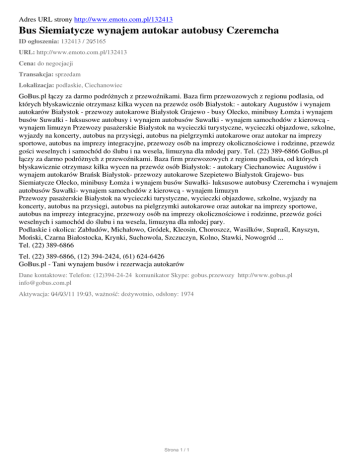 Adres URL strony http://www.emoto.com.pl/132413 Bus Siemiatycze wynajem autokar autobusy Czeremcha ID ogłoszenia: 132413 / 205165 URL: http://www.emoto.com.pl/132413 Cena: do negocjacji Transakcja: sprzedam Lokalizacja: podlaskie, Ciechanowiec GoBus.pl łączy za darmo podróżnych z przewoźnikami. Baza firm przewozowych z regionu podlasia, od których błyskawicznie otrzymasz kilka wycen na przewóz osób Białystok: - autokary Augustów i wynajem autokarów Białystok - przewozy autokarowe Białystok Grajewo - busy Olecko, minibusy Łomża i wynajem busów Suwałki - luksusowe autobusy i wynajem autobusów Suwałki - wynajem samochodów z kierowcą wynajem limuzyn Przewozy pasażerskie Białystok na wycieczki turystyczne, wycieczki objazdowe, szkolne, wyjazdy na koncerty, autobus na przysięgi, autobus na pielgrzymki autokarowe oraz autokar na imprezy sportowe, autobus na imprezy integracyjne, przewozy osób na imprezy okolicznościowe i rodzinne, przewóz gości weselnych i samochód do ślubu i na wesela, limuzyna dla młodej pary. Tel. (22) 389-6866 GoBus.pl łączy za darmo podróżnych z przewoźnikami. Baza firm przewozowych z regionu podlasia, od których błyskawicznie otrzymasz kilka wycen na przewóz osób Białystok: - autokary Ciechanowiec Augustów i wynajem autokarów Brańsk Białystok- przewozy autokarowe Szepietewo Białystok Grajewo- bus Siemiatycze Olecko, minibusy Łomża i wynajem busów Suwałki- luksusowe autobusy Czeremcha i wynajem autobusów Suwałki- wynajem samochodów z kierowcą - wynajem limuzyn Przewozy pasażerskie Białystok na wycieczki turystyczne, wycieczki objazdowe, szkolne, wyjazdy na koncerty, autobus na przysięgi, autobus na pielgrzymki autokarowe oraz autokar na imprezy sportowe, autobus na imprezy integracyjne, przewozy osób na imprezy okolicznościowe i rodzinne, przewóz gości weselnych i samochód do ślubu i na wesela, limuzyna dla młodej pary. Podlaskie i okolica: Zabłudów, Michałowo, Gródek, Kleosin, Choroszcz, Wasilków, Supraśl, Knyszyn, Moński, Czarna Białostocka, Krynki, Suchowola, Szczuczyn, Kolno, Stawki, Nowogród ... Tel. (22) 389-6866 Tel. (22) 389-6866, (12) 394-2424, (61) 624-6426 GoBus.pl - Tani wynajem busów i rezerwacja autokarów Dane kontaktowe: Telefon: (12)394-24-24 komunikator Skype: gobus.przewozy http://www.gobus.pl [email protected] Aktywacja: 04/03/11 19:03, ważność: dożywotnio, odsłony: 1974 Strona 1 / 1