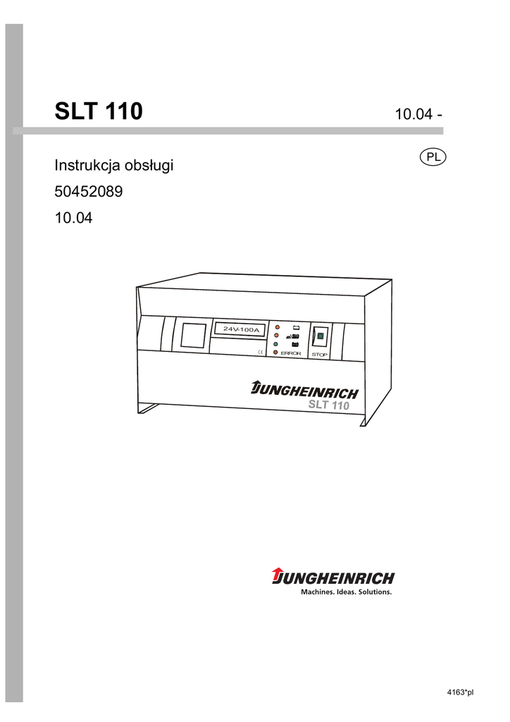 SLT 110 10.04 p Instrukcja obsługi 50452089 10.04 24V-1 00A e ERROR STOP 4163*pl Spis treści Spis treści 1 Informacje ogólne ........................................................................................................... 4 1.1 Cel instrukcji obsługi .....................................................................................................................4 1.2 Prawa autorskie i ochrona prawna ...............................................................................................5 2 Bezpieczeństwo .............................................................................................................. 5 2.1 Informacje ogólne...........................................................................................................................5 2.2 Wskazówki dotyczące tabliczek i symboli ...................................................................................5 2.3 Kwalifikacje personelu...................................................................................................................6 2.3.1 Zastosowanie przemysłowe ...................................................................................................7 2.4 Eksploatacja zgodna z przeznaczeniem ......................................................................................7 2.5 Wskazówki bezpieczeństwa dotyczące ustawienia i instalacji..................................................8 2.6 Wskazówki bezpieczeństwa dotyczące użytkowania i obsługi .................................................9 2.7 Wskazówki bezpieczeństwa dotyczące usuwania usterek i konserwacji ................................9 3 Dane produktu............................................................................................................... 11 3.1 Opis produktu i jego funkcji ........................................................................................................11 3.2 Oznaczenie typu ...........................................................................................................................11 3.3 Opis wyposażenia i jego funkcji .................................................................................................12 3.3.1 Aquamatic/system uzupełniania wody (opcja) .....................................................................12 3.4 Pozostałe ryzyko ..........................................................................................................................12 3.5 Opis urządzeń zabezpieczających..............................................................................................13 3.6 Oznaczenia i tabliczki umieszczone na ładowarce ...................................................................14 4 Transport, przenoszenie i magazynowanie ................................................................ 15 5 Ustawianie/instalacja/rozruch...................................................................................... 16 5.1 Zakres dostawy.............................................................................................................................16 5.2 Wymagania dotyczące miejsca użytkowania ............................................................................16 5.3 Przyłącze sieciowe i bezpieczniki sieciowe...............................................................................17 5.4 Ustawianie i instalacja .................................................................................................................17 5.4.1 Przyłącze Aquamatic............................................................................................................17 5.5 Rozruch i test funkcyjny ..............................................................................................................18 6 Obsługa.......................................................................................................................... 18 10.09.04 – Ga 2/31 4163*pl Spis treści 6.1 Elementy obsługi i wskaźniki ......................................................................................................18 6.1.1 Znaczenie diod świecących .................................................................................................19 6.1.2 Funkcja przycisku.................................................................................................................19 6.2 Przyłączanie ładowarki do sieci zasilającej ...............................................................................19 6.3 Przyłączanie akumulatora............................................................................................................20 6.4 Automatyczne rozpoczęcie ładowania.......................................................................................21 6.5 Przerwanie procesu ładowania ...................................................................................................21 6.6 Automatyczne zakończenie ładowania – ładowanie wyrównawcze .......................................22 6.7 Usterki i komunikaty o błędach ..................................................................................................22 6.7.1 Usterki przerywające pracę..................................................................................................23 6.7.2 Usterki nieprzerywające pracy .............................................................................................25 7 Konserwacja .................................................................................................................. 26 7.1 Czyszczenie, prace inspekcyjne i konserwacja ........................................................................26 7.2 Części zamienne...........................................................................................................................26 8 Utylizacja........................................................................................................................ 26 1