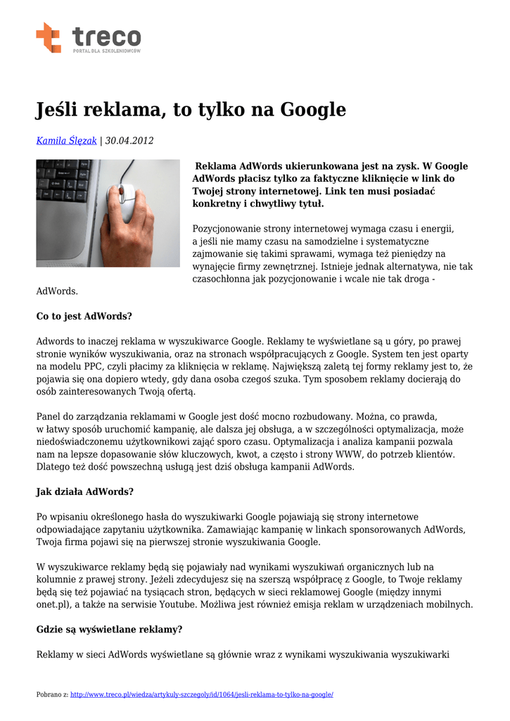 Jeśli reklama, to tylko na Google Kamila Ślęzak | 30.04.2012 Reklama AdWords ukierunkowana jest na zysk. W Google AdWords płacisz tylko za faktyczne kliknięcie w link do Twojej strony internetowej. Link ten musi posiadać konkretny i chwytliwy tytuł. Pozycjonowanie strony internetowej wymaga czasu i energii, a jeśli nie mamy czasu na samodzielne i systematyczne zajmowanie się takimi sprawami, wymaga też pieniędzy na wynajęcie firmy zewnętrznej. Istnieje jednak alternatywa, nie tak czasochłonna jak pozycjonowanie i wcale nie tak droga AdWords. Co to jest AdWords? Adwords to inaczej reklama w wyszukiwarce Google. Reklamy te wyświetlane są u góry, po prawej stronie wyników wyszukiwania, oraz na stronach współpracujących z Google. System ten jest oparty na modelu PPC, czyli płacimy za kliknięcia w reklamę. Największą zaletą tej formy reklamy jest to, że pojawia się ona dopiero wtedy, gdy dana osoba czegoś szuka. Tym sposobem reklamy docierają do osób zainteresowanych Twoją ofertą. Panel do zarządzania reklamami w Google jest dość mocno rozbudowany. Można, co prawda, w łatwy sposób uruchomić kampanię, ale dalsza jej obsługa, a w szczególności optymalizacja, może niedoświadczonemu użytkownikowi zająć sporo czasu. Optymalizacja i analiza kampanii pozwala nam na lepsze dopasowanie słów kluczowych, kwot, a często i strony WWW, do potrzeb klientów. Dlatego też dość powszechną usługą jest dziś obsługa kampanii AdWords. Jak działa AdWords? Po wpisaniu określonego hasła do wyszukiwarki Google pojawiają się strony internetowe odpowiadające zapytaniu użytkownika. Zamawiając kampanię w linkach sponsorowanych AdWords, Twoja firma pojawi się na pierwszej stronie wyszukiwania Google. W wyszukiwarce reklamy będą się pojawiały nad wynikami wyszukiwań organicznych lub na kolumnie z prawej strony. Jeżeli zdecydujesz się na szerszą współpracę z Google, to Twoje reklamy będą się też pojawiać na tysiącach stron, będących w sieci reklamowej Google (między innymi onet.pl), a także na serwisie Youtube. Możliwa jest również emisja reklam w urządzeniach mobilnych. Gdzie są wyświetlane reklamy? Reklamy w sieci AdWords wyświetlane są głównie wraz z wynikami wyszukiwania wyszukiwarki Pobrano z: http://www.treco.pl/wiedza/artykuly-szczegoly/id/1064/jesli-reklama-to-tylko-na-google/ Google. Reklamy są wyświetlane kontekstowo - oznacza to, że dla wyszukania konkretnych słów wyświetlane są reklamy wykupione właśnie na te słowa kluczowe. Aby się o tym przekonać, wystarczy wyszukać w Google interesujące nas pojęcie - na przykład "kupno samochodu" - można wtedy zobaczyć reklamy związane z tym hasłem. Jeśli wpiszemy słowo „nieruchomości” - pojawią się reklamy związane z tą branżą. Google umożliwia wykupienie przestrzeni reklamowej - linku sponsorowanego. Najpierw należy wybrać słowo, przy którego wyszukaniu ma się wyświetlać reklama, a następnie należy napisać treść takiej reklamy. W ten sposób ustala się, przy jakich słowach kluczowych będzie widoczna nasza reklama. Reklamy mogą być wyświetlane obok wyników wyszukiwania lub nad nimi. Zalety AdWords Zaletą takich kampanii jest możliwość bardzo precyzyjnego wskazania grupy docelowej, której reklama ma zostać wyświetlona. Można wybrać właściwe dla danej działalności słowa-klucze opisujące firmę, produkty i samą branżę, miejsca docelowe reklamy oraz słowa wykluczające wyświetlenie reklamy, co pozwala uniknąć różnych przykrych niespodzianek. Ten typ reklamy ma jedną ogromną przewagę nad innymi: łatwy i przejrzysty sposób budżetowania kampanii i płatność za kliknięcia, a nie za wyświetlenia. Planowanie wymaga ustawienia górnej granicy dziennych wydatków oraz najwyższej kwoty, jaką chcemy zapłacić za kliknięcie lub wyświetlenie (można płacić tylko za kliknięcia). Nie ma określonego minimum finansowego, ale obowiązuje jednorazowa opłata aktywacyjna, która nie jest zbyt wysoka. System AdWords daje naprawdę dużo możliwości. Aby je dobrze wykorzystać, trzeba się dobrze wczytać w zasady, skorzystać z rad doświadczonych użytkowników albo wręcz podszkolić. Jeśli nie czujesz się na siłach, by samodzielnie zorganizować w Google kampanię, możesz za pierwszym razem skorzystać z pomocy certyfikowanego partnera Google AdWords. Są to profesjonaliści zajmujący się zawodowo różnymi rodzajami marketingu online, np. marketingiem w wyszukiwarkach (SEM) czy optymalizacją witryn (SEO). Należy pamiętać, że nie jest to darmowa pomoc, więc wiąże się z zawarciem umowy i z opłatą za usługę, tak jak przy każdej współpracy z innym podmiotem. Monitoring kampanii Prowadzenie kampanii AdWords wymaga ciągłego monitoringu kampanii. Badane powinny być nie tylko takie podstawowe rzeczy, jak: CTR wyświetlanych reklam, koszt za kliknięcie, ilość wyświetleń, ale również ich konwersja, CPA itp. Bez tego nie jest możliwa kompletna analiza opłacalności i efektywności poszczególnych reklam. W rozwijaniu kampanii warto wykorzystywać wszelkie elementy sezonowości, mody, bieżących kulturalnych i politycznych wydarzeń. Są one szansą na zdobycie nierzadko bardzo dużego i jednocześnie bardzo taniego ruchu internetowego. Jako przykład można podać wybory prezydenckie w 2005 roku, podczas których przed drugą turą nikt, poza „Gazetą Wyborczą”, nie reklamował się, płacąc za wyświetlanie stron gazety jako wynik wpisania w wyszukiwarkach haseł związanych tematycznie z wyborami. Pobrano z: http://www.treco.pl/wiedza/artykuly-szczegoly/id/1064/jesli-reklama-to-tylko-na-google/ Budowa linku i koszty AdWords Budowa linku AdWords to następujące elementy: tytuł (do 25 znaków), tekst reklamy (maksymalnie dwa wersy po 35 znaków), adres WWW strony, na którą użytkownicy mają trafić oraz adres strony internetowej wyświetlany w treści reklamy. Jeśl