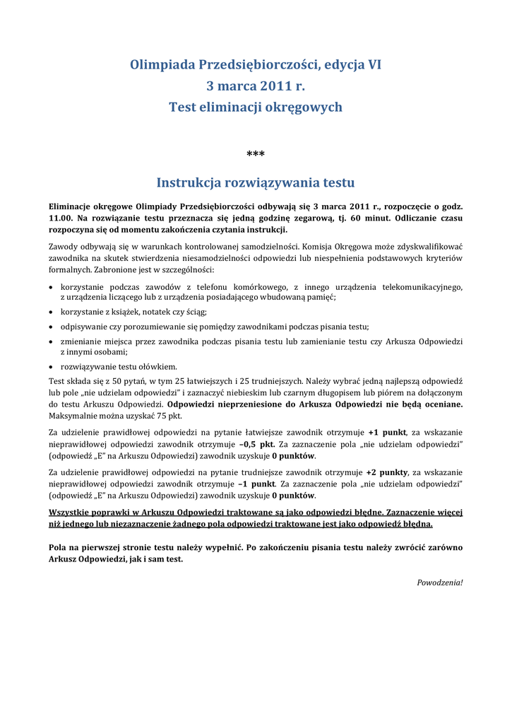 Olimpiada Przedsiębiorczości, edycja VI 3 marca 2011 r. Test eliminacji okręgowych *** Instrukcja rozwiązywania testu Eliminacje okręgowe Olimpiady Przedsiębiorczości odbywają się 3 marca 2011 r., rozpoczęcie o godz. 11.00. Na rozwiązanie testu przeznacza się jedną godzinę zegarową, tj. 60 minut. Odliczanie czasu rozpoczyna się od momentu zakończenia czytania instrukcji. Zawody odbywają się w warunkach kontrolowanej samodzielności. Komisja Okręgowa może zdyskwalifikować zawodnika na skutek stwierdzenia niesamodzielności odpowiedzi lub niespełnienia podstawowych kryteriów formalnych. Zabronione jest w szczególności: • korzystanie podczas zawodów z telefonu komórkowego, z innego urządzenia telekomunikacyjnego, z urządzenia liczącego lub z urządzenia posiadającego wbudowaną pamięć; • korzystanie z książek, notatek czy ściąg; • odpisywanie czy porozumiewanie się pomiędzy zawodnikami podczas pisania testu; • zmienianie miejsca przez zawodnika podczas pisania testu lub zamienianie testu czy Arkusza Odpowiedzi z innymi osobami; • rozwiązywanie testu ołówkiem. Test składa się z 50 pytań, w tym 25 łatwiejszych i 25 trudniejszych. Należy wybrać jedną najlepszą odpowiedź lub pole „nie udzielam odpowiedzi” i zaznaczyć niebieskim lub czarnym długopisem lub piórem na dołączonym do testu Arkuszu Odpowiedzi. Odpowiedzi nieprzeniesione do Arkusza Odpowiedzi nie będą oceniane. Maksymalnie można uzyskać 75 pkt. Za udzielenie prawidłowej odpowiedzi na pytanie łatwiejsze zawodnik otrzymuje +1 punkt, za wskazanie nieprawidłowej odpowiedzi zawodnik otrzymuje –0,5 pkt. Za zaznaczenie pola „nie udzielam odpowiedzi” (odpowiedź „E” na Arkuszu Odpowiedzi) zawodnik uzyskuje 0 punktów. Za udzielenie prawidłowej odpowiedzi na pytanie trudniejsze zawodnik otrzymuje +2 punkty, za wskazanie nieprawidłowej odpowiedzi zawodnik otrzymuje –1 punkt. Za zaznaczenie pola „nie udzielam odpowiedzi” (odpowiedź „E” na Arkuszu Odpowiedzi) zawodnik uzyskuje 0 punktów. Wszystkie poprawki w Arkuszu Odpowiedzi traktowane są jako odpowiedzi błędne. Zaznaczenie więcej niż jednego lub niezaznaczenie żadnego pola odpowiedzi traktowane jest jako odpowiedź błędna. Pola na pierwszej stronie testu należy wypełnić. Po zakończeniu pisania testu należy zwrócić zarówno Arkusz Odpowiedzi, jak i sam test. Powodzenia! Olimpiada Przedsiębiorczości – eliminacje okręgowe, 3 marca 2011 r. Test 1. (1 pkt) Split akcji polega na: a. przyznaniu pracownikom co najmniej 15% akcji prywatyzowanych przedsiębiorstw, b. rozdziale akcji nowej emisji wśród dotychczasowych akcjonariuszy (proporcjonalnie do posiadanych udziałów), c. obniżeniu jednostkowej wartości nominalnej akcji i jednocześnie zwiększeniu ich liczby (z zachowaniem wielkości kapitału akcyjnego), d. przeznaczeniu 100% zysku netto na wypłatę dywidendy. 2. (1 pkt) W negocjacjach nastawionych na współpracę negocjatorzy powinni poszukiwać rozwiązania: a. jak najbardziej korzystnego dla obu stron, b. kompromisowego, c. jak najbardziej korzystnego tylko dla jednej ze stron, d. neutralnego. 3. (1 pkt) Przejęcie firmy przez inwestorów, którzy w tym celu wykorzystali dług jako główne źródło finansowania, to: a. wykup lewarowany, b. fuzja wspomagana, c. konsolidacja pozioma, d. aport kapitałowy. 4. (1 pkt) Kontrolę placówki handlowej może przeprowadzić: a. Inspekcja Sanitarna, b. Federacja Konsumentów, c. rzecznik praw konsumentów, d. Urząd Ochrony Konkurencji i Konsumentów. 5. (1 pkt) Skonto to: a. możliwość uzyskania niższej ceny w przypadku dokonania płatności w terminie krótszym niż ustalony w umowie, b. kara umowna za płatność po terminie, c. stopa procentowa dla sald debetowych na rachunkach w bankach, d. współczynnik pozwalający ocenić bieżącą wartość przyszłych przepływów pieniężnych. 6. (1 pkt) Proces gromadzenia informacji o przejmowanej spółce, a następnie przeprowadzanie na ich podstawie dokładnej analizy dotyczącej najważniejszych aspektów funkcjonowania przedsiębiorstwa (między innymi analizy jego produktów, analizy finansowej, analizy prawnej, sposobu organizacji i zarządzania), to: a. biały wywiad, b. due diligence, c. analiza fundamentalna, d. bilans strategiczny. 7. (1 pkt) Leasing, którego przedmiot w pełni się amortyzuje w okresie trwania leasingu i który nie pozwala na zaliczenie do kosztów całości ponoszonych opłat (a jedynie części odpowiadającej opłacie za użytkowanie rzeczy), to: Strona 2 z 9 Olimpiada Przedsiębiorczości – eliminacje okręgowe, 3 marca 2011 r. a. b. c. d. leasing finansowy (kapitałowy), leasing operacyjny (bieżący), leasing bezpośredni, leasing wspierany. 8. (1 pkt) W przypadku wprowadzenia akcji do obrotu na rynku regulowanym rejestracja akcji w Krajowym Depozycie Papierów Wartościowych następuje: a. przed zatwierdzeniem prospektu przez KNF, b. przed zakończeniem publicznej subskrypcji i przydziału akcji, c. przed dopuszczeniem do obrotu giełdowego, d. w dniu debiutu giełdowego, kiedy znana jest cena otwarcia. 9. (1 pkt) W typowej Strategicznej Karcie Wyników (Balanced Scorecard) na mapie strategii nie przedstawia się perspektywy: a. finansowej, b. zarządczej, c. rozwoju, d. klienta. 10. (1 pkt) Prokurent nie jest upoważniony do: a. zakupu środka nietrwałego, b. zawarcia umowy sprzedaży produkowanych wyrobów, c. zawarcia umowy o pracę z pracownikiem, d. zbycia przedsiębiorstwa. 11. (1 pkt) spółki? a. b. c. d. Który ze sposobów finansowania fuzji i przejęć nie będzie finansowaniem kapitałem własnym opłacenie konsolidacji gotówką, podwyższenie wielkości kapitału akcyjnego, przeznaczenie na ten cel zysku zatrzymanego, emisja obligacji. 12. (1 pkt) Przedsiębiorca powinien pomyśleć o dywersyfikacji swojej działalności w sytuacji, gdy: a. wskaźnik wykorzystania zdolności produkcyjnych przekroczy 95%, b. wskaźnik nasyc