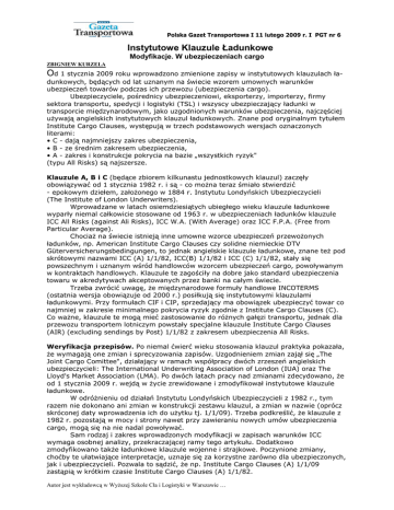 Polska Gazet Transportowa I 11 lutego 2009 r. I PGT nr 6 Instytutowe Klauzule Ładunkowe Modyfikacje. W ubezpieczeniach cargo ZBIGNIEW KURZELA Od 1 stycznia 2009 roku wprowadzono zmienione zapisy w instytutowych klauzulach ładunkowych, będących od lat uznanym na świecie wzorem umownych warunków ubezpieczeń towarów podczas ich przewozu (ubezpieczenia cargo). Ubezpieczyciele, pośrednicy ubezpieczeniowi, eksporterzy, importerzy, firmy sektora transportu, spedycji i logistyki (TSL) i wszyscy ubezpieczający ładunki w transporcie międzynarodowym, jako uzgodnionych warunków ubezpieczenia, najczęściej uŜywają angielskich instytutowych klauzul ładunkowych. Znane pod oryginalnym tytułem Institute Cargo Clauses, występują w trzech podstawowych wersjach oznaczonych literami: • C - dają najmniejszy zakres ubezpieczenia, • B - ze średnim zakresem ubezpieczenia, • A - zakres i konstrukcje pokrycia na bazie „wszystkich ryzyk" (typu All Risks) są najszersze. Klauzule A, B i C (będące zbiorem kilkunastu jednostkowych klauzul) zaczęły obowiązywać od 1 stycznia 1982 r. i są - co moŜna teraz śmiało stwierdzić - epokowym dziełem, załoŜonego w 1884 r. Instytutu Londyńskich Ubezpieczycieli (The Institute of London Underwriters). Wprowadzane w latach osiemdziesiątych ubiegłego wieku klauzule ładunkowe wyparły niemal całkowicie stosowane od 1963 r. w ubezpieczeniach ładunków klauzule ICC All Risks (against Ali Risks), ICC W.A. (With Average) oraz ICC F.P.A. (Free from Particular Average). ChociaŜ na świecie istnieją inne umowne wzorce ubezpieczeń przewoŜonych ładunków, np. American Institute Cargo Clauses czy solidne niemieckie DTV Güterversicherungsbedingungen, to jednak angielskie klauzule ładunkowe, znane teŜ pod skrótowymi nazwami ICC (A) 1/1/82, ICC(B) 1/1/82 i ICC (C) 1/1/82, stały się powszechnym i uznanym wśród handlowców wzorcem ubezpieczeń cargo, powoływanym w kontraktach handlowych. Klauzule te zagościły na dobre jako standard ubezpieczenia towaru w akredytywach akceptowanych przez banki na całym świecie. Trzeba zwrócić uwagę, Ŝe międzynarodowe formuły handlowe INCOTERMS (ostatnia wersja obowiązuje od 2000 r.) posiłkują się instytutowymi klauzulami ładunkowymi. Przy formułach CIF i CIP, sprzedający ma obowiązek ubezpieczyć towar co najmniej w zakresie minimalnego pokrycia ryzyk zgodnie z Institute Cargo Clauses (C). Co waŜne, klauzule te mogą mieć zastosowanie do róŜnych gałęzi transportu, jednak dla przewozu transportem lotniczym powstały specjalne klauzule Institute Cargo Clauses (AIR) (excluding sendings by Post) 1/1/82 z zakresem ubezpieczenia All Risks. Weryfikacja przepisów. Po niemal ćwierć wieku stosowania klauzul praktyka pokazała, Ŝe wymagają one zmian i sprecyzowania zapisów. Uzgodnieniem zmian zajął się „The Joint Cargo Comittee", działający w ramach współpracy dwóch zrzeszeń angielskich ubezpieczycieli: The International Underwriting Association of London (IUA) oraz The Lloyd's Market Association (LMA). Po dwóch latach pracy nad zmianami zdecydowano, Ŝe od 1 stycznia 2009 r. wejdą w Ŝycie zrewidowane i zmodyfikował instytutowe klauzule ładunkowe. W odróŜnieniu od działań Instytutu Londyńskich Ubezpieczycieli z 1982 r., tym razem nie dokonano ani zmian w konstrukcji zestawu klauzul, a zmian w nazwie (oprócz skróconej daty wprowadzenia ich do uŜytku tj. 1/1/09). Trzeba podkreślić, Ŝe klauzule z 1982 r. pozostają w mocy i strony nawet przy zawieraniu nowych umów ubezpieczenia cargo, mogą się na nie nadal powoływać. Sam rodzaj i zakres wprowadzonych modyfikacji w zapisach warunków ICC wymaga osobnej analizy, przekraczającej ramy tego artykułu. Dodatkowo zmodyfikowano takŜe ładunkowe klauzule wojenne i strajkowe. Poczynione zmiany, choćby te ułatwiające interpretacje, uznaje się za korzystne zarówno dla ubezpieczonych, jak i ubezpieczycieli. Pozwala to sądzić, Ŝe np. Institute Cargo Clauses (A) 1/1/09 zastąpią w krótkim czasie Institute Cargo Clauses (A) 1/1/82. Autor jest wykładowcą w WyŜszej Szkole Cła i Logistyki w Warszawie …