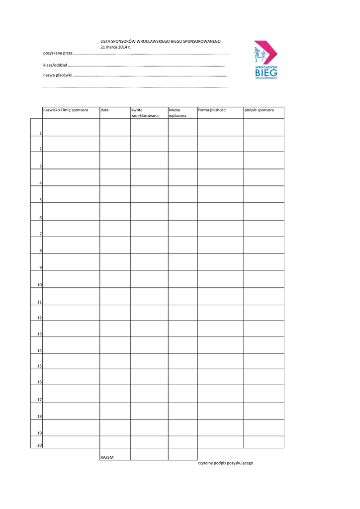 LISTA SPONSORÓW WROCŁAWSKIEGO BIEGU SPONSOROWANEGO 21 marca 2014 r. pozyskana przez……………………………………...…………………………………………….………………………………………………. klasa/oddział ……………...………………..……………………………….…………………………………………………………………….. nazwa placówki ………………….…...………………...………………..………………………………………………………………………. ……………………………...……………...……..………………………………..………………………………………………………………………. nazwisko i imię sponsora data kwota zadeklarowana kwota wpłacona forma płatności podpis sponsora 1 2 3 4 5 6 7 8 9 10 11 12 13 14 15 16 17 18 19 20 RAZEM czytelny podpis pozyskującego