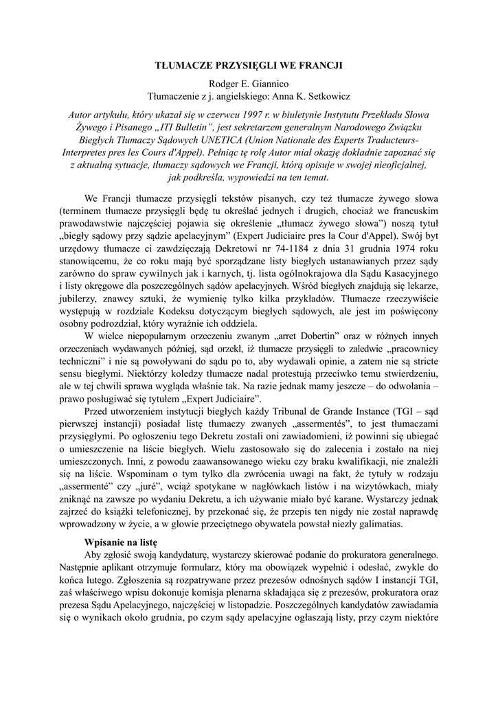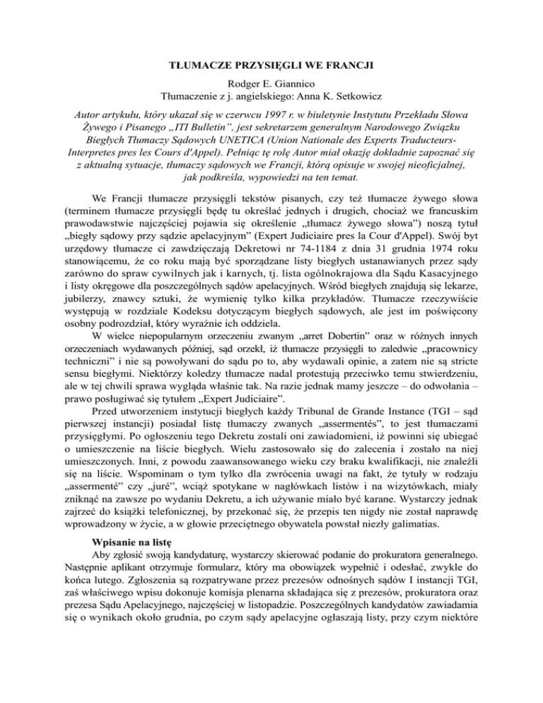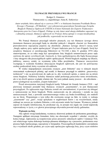 TŁUMACZE PRZYSIĘGLI WE FRANCJI Rodger E. Giannico Tłumaczenie z j. angielskiego: Anna K. Setkowicz Autor artykułu, który ukazał się w czerwcu 1997 r. w biuletynie Instytutu Przekładu Słowa Żywego i Pisanego „ITI Bulletin”, jest sekretarzem generalnym Narodowego Związku Biegłych Tłumaczy Sądowych UNETICA (Union Nationale des Experts TraducteursInterpretes pres les Cours d'Appel). Pełniąc tę rolę Autor miał okazję dokładnie zapoznać się z aktualną sytuacje, tłumaczy sądowych we Francji, którą opisuje w swojej nieoficjalnej, jak podkreśla, wypowiedzi na ten temat. We Francji tłumacze przysięgli tekstów pisanych, czy też tłumacze żywego słowa (terminem tłumacze przysięgli będę tu określać jednych i drugich, chociaż we francuskim prawodawstwie najczęściej pojawia się określenie „tłumacz żywego słowa”) noszą tytuł „biegły sądowy przy sądzie apelacyjnym” (Expert Judiciaire pres la Cour d'Appel). Swój byt urzędowy tłumacze ci zawdzięczają Dekretowi nr 74-1184 z dnia 31 grudnia 1974 roku stanowiącemu, że co roku mają być sporządzane listy biegłych ustanawianych przez sądy zarówno do spraw cywilnych jak i karnych, tj. lista ogólnokrajowa dla Sądu Kasacyjnego i listy okręgowe dla poszczególnych sądów apelacyjnych. Wśród biegłych znajdują się lekarze, jubilerzy, znawcy sztuki, że wymienię tylko kilka przykładów. Tłumacze rzeczywiście występują w rozdziale Kodeksu dotyczącym biegłych sądowych, ale jest im poświęcony osobny podrozdział, który wyraźnie ich oddziela. W wielce niepopularnym orzeczeniu zwanym „arret Dobertin” oraz w różnych innych orzeczeniach wydawanych później, sąd orzekł, iż tłumacze przysięgli to zaledwie „pracownicy techniczni” i nie są powoływani do sądu po to, aby wydawali opinie, a zatem nie są stricte sensu biegłymi. Niektórzy koledzy tłumacze nadal protestują przeciwko temu stwierdzeniu, ale w tej chwili sprawa wygląda właśnie tak. Na razie jednak mamy jeszcze – do odwołania – prawo posługiwać się tytułem „Expert Judiciaire”. Przed utworzeniem instytucji biegłych każdy Tribunal de Grande Instance (TGI – sąd pierwszej instancji) posiadał listę tłumaczy zwanych „assermentés”, to jest tłumaczami przysięgłymi. Po ogłoszeniu tego Dekretu zostali oni zawiadomieni, iż powinni się ubiegać o umieszczenie na liście biegłych. Wielu zastosowało się do zalecenia i zostało na niej umieszczonych. Inni, z powodu zaawansowanego wieku czy braku kwalifikacji, nie znaleźli się na liście. Wspominam o tym tylko dla zwrócenia uwagi na fakt, że tytuły w rodzaju „assermenté” czy „juré”, wciąż spotykane w nagłówkach listów i na wizytówkach, miały zniknąć na zawsze po wydaniu Dekretu, a ich używanie miało być karane. Wystarczy jednak zajrzeć do książki telefonicznej, by przekonać się, że przepis ten nigdy nie został naprawdę wprowadzony w życie, a w głowie przeciętnego obywatela powstał niezły galimatias. Wpisanie na listę Aby zgłosić swoją kandydaturę, wystarczy skierować podanie do prokuratora generalnego. Następnie aplikant otrzymuje formularz, który ma obowiązek wypełnić i odesłać, zwykle do końca lutego. Zgłoszenia są rozpatrywane przez prezesów odnośnych sądów I instancji TGI, zaś właściwego wpisu dokonuje komisja plenarna składająca się z prezesów, prokuratora oraz prezesa Sądu Apelacyjnego, najczęściej w listopadzie. Poszczególnych kandydatów zawiadamia się o wynikach około grudnia, po czym sądy apelacyjne ogłaszają listy, przy czym niektóre z nich ujrzą światło dzienne dopiero w czerwcu następnego roku, inne nieco wcześniej. W połowie 1997 roku liczba tłumaczy przysięgłych we Francji wynosiła 2050. Po wpisaniu na listę biegły składa pod przysięgą oświadczenie, że będzie „wspomagać wymiar sprawiedliwości oraz pełnić swoją misję sumiennie, obiektywnie i bezstronnie.” Sedno sprawy stanowi pytanie: Jakie są kryteria wpisu na listę? Dobre pytanie, ale bez odpowiedzi. Jeśli chodzi o liczbę i różnorodność, kryteria te nie ustępują francuskim serom. Nieliczne sądy wydają się traktować sprawę poważnie i dopuszczają jedynie kandydatów o wysokich kwalifikacjach lub przynajmniej takich, którzy dokumentują jakiekolwiek zaawansowane studia językowe. W pewnym sądzie apelacyjnym z kandydatami przeprowadza się indywidualne rozmowy na temat motywacji złożenia przez nich podania, co jest godne najwyższej pochwały. Z tego wszystkiego nie można jednak wywnioskować niczego konkretnego na temat wymaganych przez sądy kwalifikacji. Nie istnieje również jeden ogólnie przyjęty wzór listy. Niektóre listy zawierają jedynie nazwisko, adres i telefon tłumacza. Ale istnieją i takie, które oprócz powyższych danych informują ponadto w dość wyczerpujący sposób o wykształceniu i właściwym zawodzie tłumacza. Na podstawie list tego ostatniego rodzaju można stwierdzić, że najpopularniejszą wśród tłumaczy profesją jest nauczyciel (szkoły średniej lub akademicki). Tłumacze zawodowi wcale nie znajdują się na pierwszej pozycji. Potem następuje imponujące panopticum przedstawicieli najróżniejszych zawodów, wśród których znajdujemy między innymi tak zaskakujące jak dentysta, inżynier hydraulik, gastroenterolog, sprzedawca, mechanik samochodowy, kierownik sklepu z glazurą i terakotą, księgowy, aptekarz oraz – mój faworyt – magik. (Czyż nie jest nim czasem każdy z nas?). Liczba języków figurujących przy niektórych nazwiskach jest również absurdalna. Chociaż mogę się zgodzić, że niektórzy ludzie są niezwykle uzdolnieni językowo, bardzo trudno mi uwierzyć, że są oni „biegli” w sześciu językach, a tym bardziej w znajomości systemów prawnych krajów, których językami – jak twierdzą – władają. Kryteria zatem wydają się być następujące: jestem takiego 