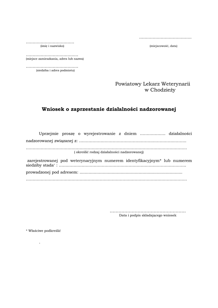 ………………………………… ……………………………… (imię i nazwisko) (miejscowość, data) ………………………………… (miejsce zamieszkania, adres lub nazwa) ………………………………… (siedziba i adres podmiotu) Powiatowy Lekarz Weterynarii w Chodzieży Wniosek o zaprzestanie działalności nadzorowanej Uprzejmie proszę o wyrejestrowanie z dniem ………………. działalności nadzorowanej związanej z: …………………………………………………………………….. ………………………………………………………………………………………………………… ( określić rodzaj działalności nadzorowanej) zarejestrowanej pod weterynaryjnym numerem identyfikacyjnym* lub numerem siedziby stada* : ………………………………………………………………………………….. prowadzonej pod adresem: ................................................................................ ………………………………………………………………………………………………………… ……………………………………………. Data i podpis składającego wniosek * Właściwe podkreślić .