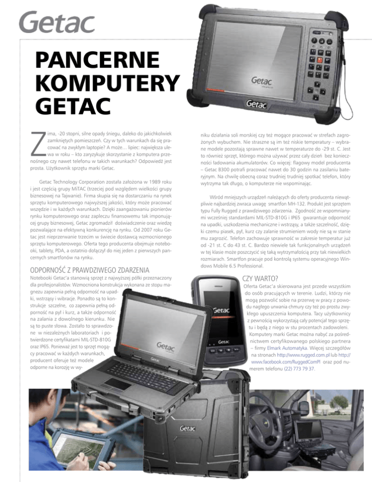 Pancerne komputery Getac Z ima, -20 stopni, silne opady śniegu, daleko do jakichkolwiek zamkniętych pomieszczeń. Czy w tych warunkach da się pracować na zwykłym laptopie? A może… lipiec: największa ulewa w roku – kto zaryzykuje skorzystanie z komputera przenośnego czy nawet telefonu w takich warunkach? Odpowiedź jest prosta. Użytkownik sprzętu marki Getac. Getac Technology Corporation została założona w 1989 roku i jest częścią grupy MiTAC (trzeciej pod względem wielkości grupy biznesowej na Tajwanie). Firma skupia się na dostarczaniu na rynek sprzętu komputerowego najwyższej jakości, który może pracować wszędzie i w każdych warunkach. Dzięki zaangażowaniu pionierów rynku komputerowego oraz zapleczu finansowemu tak imponującej grupy biznesowej, Getac zgromadził doświadczenie oraz wiedzę pozwalające na efektywną konkurencję na rynku. Od 2007 roku Getac jest nieprzerwanie trzecim w świecie dostawcą wzmocnionego sprzętu komputerowego. Oferta tego producenta obejmuje notebooki, tablety, PDA, a ostatnio dołączył do niej jeden z pierwszych pancernych smartfonów na rynku. Odporność z prawdziwego zdarzenia Notebooki Getac’a stanowią sprzęt z najwyższej półki przeznaczony dla profesjonalistów. Wzmocniona konstrukcja wykonana ze stopu magnezu zapewnia pełną odporność na upadki, wstrząsy i wibracje. Ponadto są to konstrukcje szczelne, co zapewnia pełną odporność na pył i kurz, a także odporność na zalania z dowolnego kierunku. Nie są to puste słowa. Zostało to sprawdzone w niezależnych laboratoriach i potwierdzone certyfikatami MIL-STD-810G oraz IP65. Ponieważ jest to sprzęt mogący pracować w każdych warunkach, producent oferuje też modele odporne na korozję w wy- niku działania soli morskiej czy też mogące pracować w strefach zagrożonych wybuchem. Nie straszne są im też niskie temperatury – wybrane modele pozostają sprawne nawet w temperaturze do -29 st. C. Jest to również sprzęt, którego można używać przez cały dzień bez konieczności ładowania akumulatorów. Co więcej: flagowy model producenta – Getac B300 potrafi pracować nawet do 30 godzin na zasilaniu bateryjnym. Na chwilę obecną coraz trudniej trudniej spotkać telefon, który wytrzyma tak długo, o komputerze nie wspominając. Wśród mniejszych urządzeń należących do oferty producenta niewątpliwie najbardziej zwraca uwagę smartfon MH-132. Produkt jest sprzętem typu Fully Rugged z prawdziwego zdarzenia. Zgodność ze wspomnianymi wcześniej standardami MIL-STD-810G i IP65 gwarantuje odporność na upadki, uszkodzenia mechaniczne i wstrząsy, a także szczelność, dzięki czemu piasek, pył, kurz czy zalanie strumieniem wody nie są w stanie mu zagrozić. Telefon zachowuje sprawność w zakresie temperatur już od -21 st. C do 43 st. C. Bardzo niewiele tak funkcjonalnych urządzeń w tej klasie może poszczycić się taką wytrzymałością przy tak niewielkich rozmiarach. Smartfon pracuje pod kontrolą systemu operacyjnego Windows Mobile 6.5 Professional. Czy warto? Oferta Getac’a skierowana jest przede wszystkim do osób pracujących w terenie. Ludzi, którzy nie mogą pozwolić sobie na przerwę w pracy z powodu nagłego urwania chmury czy też po prostu zwykłego upuszczenia komputera. Tacy użytkownicy z pewnością wykorzystają cały potencjał tego sprzętu i będą z niego w stu procentach zadowoleni. Komputery marki Getac można nabyć za pośrednictwem certyfikowanego polskiego partnera – firmy Elmark Automatyka. Więcej szczegółów na stronach http://www.rugged.com.pl lub http:// www.facebook.com/RuggedComPl oraz pod numerem telefonu (22) 773‒79‒37.