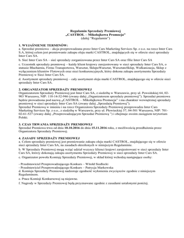 Regulamin Sprzedaży Premiowej „CASTROL – Mikołajkowa Promocja” (dalej “Regulamin”) 1. WYJAŚNIENIE TERMINÓW: a. Sprzedaż premiowa – akcja przeprowadzana przez Inter Cars Marketing Services Sp. z o.o. na rzecz Inter Cars S.A, której celem jest premiowanie zakupu oleju marki CASTROL, znajdujących się w ofercie sieci sprzedaży Inter Cars SA. b. Sieć Inter Cars SA – sieć sprzedaży zorganizowana przez Inter Cars SA oraz filie Inter Cars SA c. Uczestnik sprzedaży premiowej – każdy klient krajowy zarejestrowany w sieci sprzedaży Inter Cars SA, o statusie Blacharnia, Firma Transportowa, Warsztat, SklepoWarsztat, WarsztatoSklep, Wulkanizacja, Sklep z wyłączeniem klientów Flotowych oraz sieci konkurencyjnych, który dokona zakupu asortymentu Sprzedaży Premiowej w Sieci Inter Cars SA. d. Asortyment sprzedaży premiowej – cały asortyment oleju marki CASTROL, znajdującego się w ofercie sieci sprzedaży Inter Cars SA. 2. ORGANIZATOR SPRZEDAŻY PREMIOWEJ Organizatorem Sprzedaży Premiowej jest Inter Cars SA, z siedzibą w Warszawie, przy ul. Powsińskiej 64, 02903 Warszawa, NIP: 118-14-52-946 (zwany dalej „Organizatorem sprzedaży premiowej”). Sprzedaż premiowa będzie prowadzona pod nazwą „CASTROL – Mikołajkowa Promocja” i ma charakter wewnętrznej sprzedaży premiowej w sieci sprzedaży Inter Cars SA (zwany dalej „Sprzedażą Premiową”). Sprzedaż Premiową w imieniu i na rzecz Organizatora Sprzedaży Premiowej przeprowadza Inter Cars Marketing Services Sp. z o.o., z siedzibą w Warszawie, przy ul. Płowieckiej 57, 04-501 Warszawa, NIP: 70102-61-527 (zwany dalej „Przeprowadzającym Sprzedaż Premiową ”) i obejmuje swoim zasięgiem terytorium Polski. 3. CZAS TRWANIA SPRZEDAŻY PREMIOWEJ Sprzedaż Premiowa trwa od dnia 10.10.2016 do dnia 15.11.2016 roku, z możliwością przedłużenia przez Organizatora Sprzedaży Premiowej. 4. ZASADY SPRZEDAŻY PREMIOWEJ a. Celem sprzedaży premiowej jest premiowanie zakupu oleju marki CASTROL, znajdującego się w ofercie sieci sprzedaży Inter Cars SA, na zasadach określonych w niniejszym Regulaminie. b. W Sprzedaży Premiowej mogą wziąć udział wszyscy klienci krajowi zarejestrowani w sieci sprzedaży Inter Cars SA, którzy dokonają zakupu asortymentu Sprzedaży Premiowej w sieci sprzedaży Inter Cars SA. c. Organizator powoła Komisję Sprzedaży Premiowej, w skład której wchodzą następujące osoby: - Przedstawiciel Przeprowadzającego Konkurs – Witold Siedlecki - Przedstawiciel Przeprowadzającego Konkurs – Patrycja Markowska d. Komisja Sprzedaży Premiowej nadzoruje zgodność wyłonienia zwycięzców zgodnie z niniejszym Regulaminem. e. Prace Komisji Konkursowej są niejawne. f. Nagrody w Sprzedaży Premiowej będą przyznawane zgodnie z zasadami ustalonymi poniżej. g. Nieterminowe płatności za zakupy asortymentu Sprzedaży Premiowej lub przeterminowane należności wobec Organizatora Sprzedaży Premiowej, powodują wykluczenie Uczestnika z udziału w Sprzedaży Premiowej. 5. NAGRODY a. Nagrodą w Sprzedaży Premiowej „CASTROL – Mikołajkowa Promocja” jest, w zależności od zrealizowanego progu zakupowego (wartość zakupów netto liczona łącznie w całym okresie trwania promocji): Za 2 000 zł kwoty zakupów netto asortymentu Sprzedaży Premiowej dokonanych w całym okresie trwania Sprzedaży Premiowej, Klient otrzyma – zegarek dziecięcy, różowy lub niebieski (kod Apart: PM142-K238, PM142-K241) Za 5 000 zł kwoty zakupów netto asortymentu Sprzedaży Premiowej dokonanych w całym okresie trwania Sprzedaży Premiowej, Klient otrzyma – dwa zegarki dziecięce różowy i niebieski oraz bransoletkę (kod Apart: PM142-K238, PM142-K241). b. Klient może otrzymać max. 3 nagrody jednego typu c. Liczba nagród, przyznanych Uczestnikowi Sprzedaży Premiowej zależy od ostatecznej wartości zakupów netto dokonanych w czasie trwania Sprzedaży Premiowej. d. Zakupy asortymentu Sprzedaży Premiowej dokonane przez Uczestnika sumują się przez cały okres obowiązywania Sprzedaży Premiowej. e. Nagrody zostaną wysłane do Filii Inter Cars SA nie później niż trzy tygodnie od daty zakończenia Sprzedaży Premiowej tj. do 06.12.2016 r., w celu przekazania Laureatom Sprzedaży Premiowej. f. Organizator Sprzedaży Premiowej zastrzega, że wszelkie należności podatkowe, które mogą zaistnieć w związku z przekazaniem nagród pozostają po stronie Laureata Sprzedaży Premiowej. g. Wszelkie należne podatki i opłaty skarbowe związane z otrzymaniem Nagrody ponosi Laureat. Organizator Sprzedaży Premiowej poinformuje Uczestnika, iż Nagroda stanowi przychód Uczestnika. 6. REKLAMACJE I ROSZCZENIA. a. Uczestnikowi przysługuje prawo złożenia reklamacji. b. Reklamacje przyjmowane będą wyłącznie w trybie korespondencji przesłanej listem poleconym na adres Przeprowadzającego Sprzedaż Premiową z dopiskiem ” „CASTROL – Mikołajkowa Promocja”, nie później niż do dnia 29.11.2016 r., przy czym o dotrzymaniu terminu będzie decydować data stempla pocztowego. Reklamacja zgłoszona po tym terminie nie zostanie rozpatrzona. c. Reklamacja powinna być sporządzona na piśmie i zawierać imię, nazwisko i dokładny adres Uczestnika, jak również dokładny opis przyczyny reklamacji. d. Przeprowadzający Sprzedaż Premiową rozpatrzy reklamację w terminie 7 (siedmiu) dni roboczych od daty otrzymania, przy czym okres ten może zostać wydłużony, gdy rozpoznanie reklamacji wymaga dłuższego czasu. e. Po rozpatrzeniu reklamacji Przeprowadzający Sprzedaż Premiową prześle odpowiedź listem poleconym na adres wskazany przez Uczestnika. f. W przypadku, gdy złożona reklamacja zawiera braki uniemożliwiające jej rozpatrzenie, Przeprowadzający Sprzedaż Premiową wezwie Uczestnika do jej uzupełnienia, określając termin nie krótszy niż 7 (siedem) dni roboczych, oraz zakres tego uzupełnienia. Brak uzupełnienia reklamacji w określonym terminie spowoduje pozostawienie 