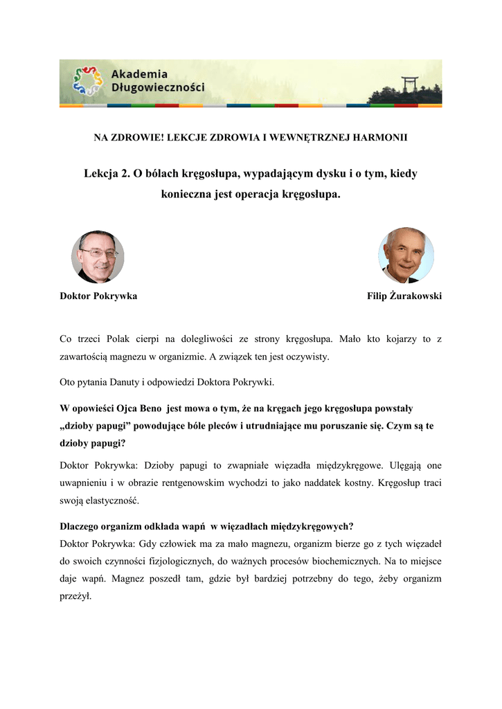 NA ZDROWIE! LEKCJE ZDROWIA I WEWNĘTRZNEJ HARMONII Lekcja 2. O bólach kręgosłupa, wypadającym dysku i o tym, kiedy konieczna jest operacja kręgosłupa. Doktor Pokrywka Filip Żurakowski Co trzeci Polak cierpi na dolegliwości ze strony kręgosłupa. Mało kto kojarzy to z zawartością magnezu w organizmie. A związek ten jest oczywisty. Oto pytania Danuty i odpowiedzi Doktora Pokrywki. W opowieści Ojca Beno jest mowa o tym, że na kręgach jego kręgosłupa powstały „dzioby papugi” powodujące bóle pleców i utrudniające mu poruszanie się. Czym są te dzioby papugi? Doktor Pokrywka: Dzioby papugi to zwapniałe więzadła międzykręgowe. Ulęgają one uwapnieniu i w obrazie rentgenowskim wychodzi to jako naddatek kostny. Kręgosłup traci swoją elastyczność. Dlaczego organizm odkłada wapń w więzadłach międzykręgowych? Doktor Pokrywka: Gdy człowiek ma za mało magnezu, organizm bierze go z tych więzadeł do swoich czynności fizjologicznych, do ważnych procesów biochemicznych. Na to miejsce daje wapń. Magnez poszedł tam, gdzie był bardziej potrzebny do tego, żeby organizm przeżył. Ojciec Beno pisze, że chlorek magnezowy wypłukał wapń, likwidując „dzioby papugi” i umieścił go w odpowiednim miejscu organizmu. Co to znaczy, że chlorek magnezu wyplukał wapń? Doktor Pokrywka: Jeżeli jest dużo magnezu w krwi, to organizm naprawia tę sytuację. Wapń jest wypychany z tych miejsc, gdzie nie powinien być i trafia tam, gdzie jest jego właściwe miejsce. Ludzie mówią, że jak ktoś ma przepuklinę między kręgami albo wypada mu dysk, to już magnez nie pomoże. Doktor Pokrywka: Przede wszystkim uściślijmy pojęcia. W języku medycznym mówi się o przepuklinie międzykręgowej, a potocznie nazywa się to wypadaniem dysku. To jest to samo. Oczywiście, że magnez w tej sytuacji pomoże. Gdy dostarczymy magnezu kręgosłup staje się bardziej elastyczny, bóle ustępują, wypadający dysk cofa się, wszystko zdrowieje, goi się. A kiedy konieczna jest operacja? Tylko wtedy, gdy sposoby mniej inwazyjne zawodzą, nie przynoszą rezultatu. Sposoby mniej inwazyjne to uzupełnienie magnezu, akupunktura, rehabilitacja. Operacja to ostateczność, jej wynik zawsze jest niepewny. Fot. Szymon Kliszewski Coś dla ducha Filip: Wczoraj miałem dzień bogaty w przeżycia. Spotkałem się na tarasie kawiarni ze znajomą z branży szkoleniowej. Rozmawialiśmy o sprawach zawodowych. Koniecznie chciał się do nas przysiąść facet z sąsiedniego stolika. W rozmowie wykazał się dużą znajomością literatury, rzucał cytatami po łacinie i po grecku. Dlaczego tak koniecznie chciał porozmawiać? Przyszło mi na myśl, że to było nieuświadomione wołanie o pomoc. Mówił, że jest wojownikiem. Oprócz prawie niewidocznych blizn na twarzy miał o wiele bardziej widoczne dla wprawnego oka blizny na duszy. Wieczorem miałem rozmowę przez skype’a z panem Romanem. Rozmowa była o marketingu, ale przy okazji poruszyliśmy sfery naszych wspólnych zainteresowań. Pan Roman uprawia karate, był – podobnie jak ja – uczestnikiem kursu kontroli umysłu metodą Silvy, prowadzonego przez Andrzeja Wójcikiewicza, byłego trenera kadry szermierzy. Ma dużą wiedzę o odżywianiu sprzyjającemu sukcesom w sporcie. Wspomnieliśmy też o Gichinie Funakoshi, twórcy karate. Późnym wieczorem byłem na spacerze z synem na nieczynnej obwodnicy. Ani żywej duszy oprócz nas i psa. Rozmawialiśmy o emocjonalnych zranieniach znajomego artysty i o tym jak wiele osób ma takie emocjonalne rany z dzieciństwa, bo wychowali się w rodzinie, gdzie albo brakowało miłości albo były nałogi, albo jedno i drugie miało miejsce. I o tym, że niektórym z nich udało się przezwyciężyć negatywną sztafetę pokoleń – stworzyli kochające się rodziny, nie mają nałogów, odnoszą sukcesy zawodowe i biznesowe. Dziś rano to wszystko połączyło mi się w jedną całość. Może moim życiowym zadaniem jest stworzenie duchowego karate? Dla tych, którzy wciąż powtarzają w życiu te same błędy, wciąż wpadają na życiowej drodze w te same dziury i za każdym razem niszczą to, co zbudują. Skłonności do takich niszczycielskich strategii są tak silnie zakorzenione, że pojawiają się wątpliwości, czy zmiana błędnych wzorców jest w ogóle możliwa. Odpowiedź przynosi książka Gichina Funakoshi „Karate do. Moje życie”. Funakoshi z słabowitego i nieśmiałego dziecka stał się zdrowym, odpornym na choroby mężczyzną o wielkiej sile ducha. Osiągnął to dzięki codziennym wielogodzinnym ćwiczeniom uprawianym latami pod okiem mistrza. A więc jest to możliwe. I możliwa jest też zmiana negatywnych wzorców emocjonalnych na pozytywne, prowadzące do harmonii wewnętrznej i sukcesów zawodowych. Żołnierze strzelają, Pan Bóg kule nosi. Ale my jesteśmy żołnierzami i mamy strzelać. Jesteśmy wojownikami wiedzy, naszą amunicją są pociski wiedzy. Nie walczymy przeciwko czemuś, ale o coś. NOWA KSIĄŻKA! Bestseller Sensusa www.drpokrywka.pl www.filip-zurakowski.com (http://www.longevitas.pl/index.php?id=beno)