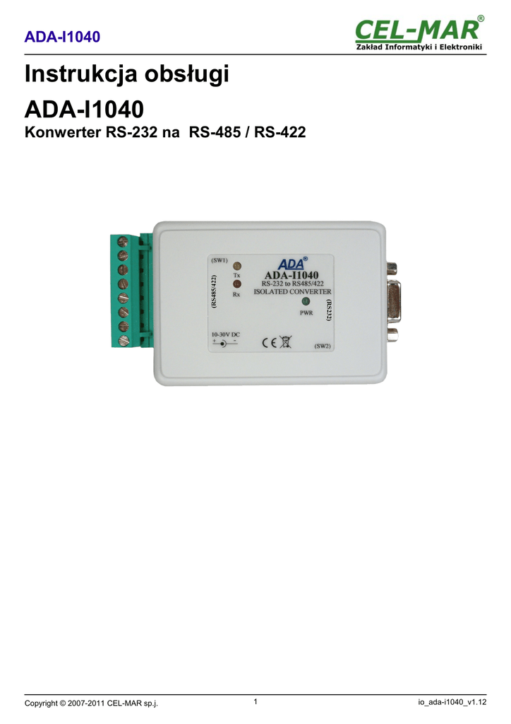ADA-I1040 Instrukcja obsługi ADA-I1040 Konwerter RS-232 na RS-485 / RS-422 Copyright © 2007-2011 CEL-MAR sp.j. 1 io_ada-i1040_v1.12 ADA-I1040 Spis treści 1. INFORMACJE OGÓLNE......................................................................................................................................................................... 3 1.1. INFORMACJE GWARANCYJNE.................................................................................................................................................... 3 1.2. OGÓLNE WARUNKI BEZPIECZNEGO UŻYTKOWANIA..............................................................................................................3 1.3. OZNACZENIE CE........................................................................................................................................................................... 3 1.4. OCHRONA ŚRODOWISKA............................................................................................................................................................ 3 1.5. SERWIS I KONSERWACJA........................................................................................................................................................... 3 2. INFORMACJE O PRODUKCIE............................................................................................................................................................... 3 2.1. WŁAŚCIWOŚCI.............................................................................................................................................................................. 3 2.2. OPIS................................................................................................................................................................................................ 4 2.3. KONWERSJA SYGNAŁÓW TX i RX.............................................................................................................................................. 4 2.4. IZOLACJA....................................................................................................................................................................................... 5 3. INSTALACJA........................................................................................................................................................................................... 5 3.1. PODŁĄCZENIE KONWERTERA DO POTRU RS-232 KOMPUTERA PC.....................................................................................5 3.2. PODŁĄCZENIE DO MAGISTRALI RS485 / RS422........................................................................................................................ 6 3.2.1. POŁĄCZENIE DO 4-PRZEWODOWEJ MAGISTRALI RS422..............................................................................................6 3.2.2. PODŁĄCZENIE DO 4-PRZEWODOWEJ MAGISTRALI RS485(4W)....................................................................................7 3.2.3. POŁĄCZENIE DO 2-PRZEWODOWEJ MAGISTRALI RS485..............................................................................................7 3.2.4. POŁĄCZENIE TYPU PRZEDŁUŻACZ SYGNAŁÓW TX I RX PORTU RS232 KOMPUTERA PC........................................8 3.3. PODŁĄCZENIE REZYSTANCJI KOŃCOWEJ Rt........................................................................................................................... 8 3.4. PODŁĄCZENIE ZASILANIA........................................................................................................................................................... 8 4. KONFIGURACJA KONWERTERA.......................................................................................................................................................... 8 4.1. OPIS USTAWIEŃ PRZEŁĄCZNIKA SW2...................................................................................................................................... 8 4.1.1. USTAWIENIA TRYBU PRACY............................................................................................................................................... 9 4.1.2. USTAWIENIE ZAPĘTLANIA SYGNAŁÓW RTS-CTS, DTR-DSR INTERFEJSU RS232......................................................9 4.2. OPIS USTAWIEŃ PRZEŁĄCZNIKA SW1...................................................................................................................................... 9 4.3. USTAWIENIA FABRYCZNE KONWERTERA..............................................................................................................................10 5. URUCHOMIENIE................................................................................................................................................................................... 10 6. INTERFEJS RS232 OPIS PINÓW ZŁĄCZA D-SUB9-ŻEŃSKI.............................................................................................................10 7. WERSJE WYKONANIA......................................................................................................................................................................... 10 8. DANE TECHNICZNE............................................................................................................................................................................. 11 2 ADA-I1040 1. INFORMACJE OGÓLNE Dziękujemy Państwu za zamówienie produktu Firmy CEL-MAR. Produkt ten został gruntownie sprawdzony, przetestowany i jest objęty bezterminową gwarancją na części i działanie. Jeżeli wynikną jakieś problemy lub pytania podczas instalacji lub używania tego produktu, prosimy o niezwłoczny kontakt z Informacja Techniczną pod numerem +48 41 362-12-46. 1.1. INFORMACJE GWARANCYJNE Firma CEL-MAR udziela bezterminowej gwarancji na konwerter ADA-I1040. Gwarancja nie pokrywa uszkodzeń powstałych z niewłaściwego użytkowania, zużycia lub nieautoryzowan