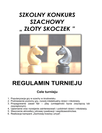 SZKOLNY KONKURS SZACHOWY „ ZŁOTY SKOCZEK ” REGULAMIN TURNIEJU Cele turnieju 1. Popularyzacja gry w szachy w środowisku. 2. Podniesienie poziomu gry, rozwój intelektualny dzieci i młodzieży. 3. Propagowanie zasad fair – play (umiejętność bycia zwycięzcą lub zwyciężonym). 4. Ujawnianie oraz rozwijanie zainteresowań i uzdolnień dzieci i młodzieży. 5. Stworzenie atmosfery zdrowej rywalizacji i współzawodnictwa. 6. Realizacja kampanii „Zachowaj trzeźwy umysł”. Organizatorzy 1. Dyrekcja Szkoły Podstawowej nr 1 im. Jana Pawła II w Sulejowie. 2. Opiekun szkolnego koła szachowego p. Marcin Pączyński. Czas i miejsce turnieju 1. Szkolny turniej gry w szachy odbędzie się 25-27 maja 2011 r. od godz. 11.50. w Szkole Podstawowej nr 1 im JP II w Sulejowie w czytelni. Uczestnicy 1. W konkursie mogą wziąć udział uczniowie Szkoły Podstawowej nr 1 im. Jana Pawła II w Sulejowie. 2. Nie ma podziału na płeć i wiek uczestników.. 3. Uczestnicy zgłaszają się do konkursu najpóźniej do dnia 24 maja 2011r. do opiekuna koła szachowego. Zasady gry 1. W turnieju obowiązują zasady Kodeksu Polskiego Związku Szachowego. 2. Pierwsza i druga runda odbywa się systemem pucharowym, kolejne rundy systemem każdy z każdym (mecze rundy finałowej punktowane są następująco: zwycięstwo 1pkt., remis 0,5 pkt., przegrana 0 pkt.). 3. Mecze rozgrywane są z użyciem zegarów, każdy gracz ma przyznany limit czasowy 10min na wszystkie swoje posunięcia, koniec czasu gracza jest jednoznaczny z jego przegraną meczu. 4. Kwestie sporne rozstrzyga sędzia główny. Nagrody 1. Za miejsca 1-3 dyplom i nagroda rzeczowa , za pozostałe miejsca dyplomy uczestnictwa. Serdecznie zapraszamy