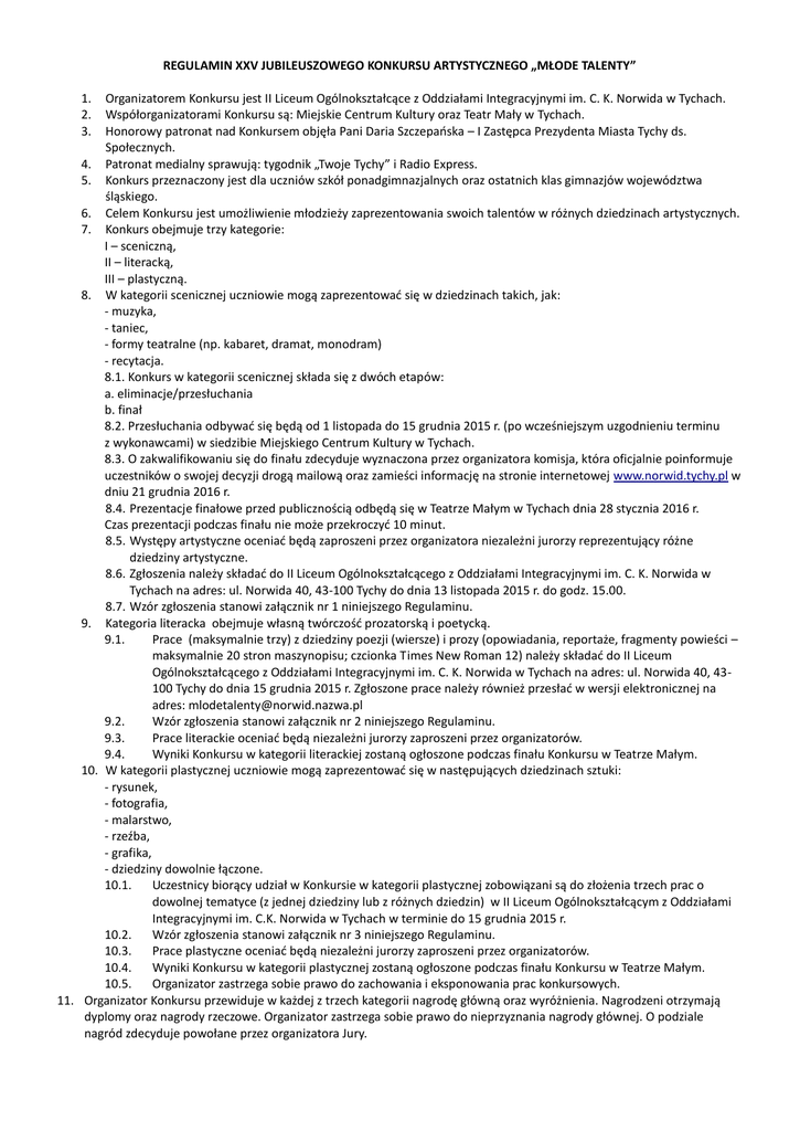 REGULAMIN XXV JUBILEUSZOWEGO KONKURSU ARTYSTYCZNEGO „MŁODE TALENTY” 1. 2. 3. Organizatorem Konkursu jest II Liceum Ogólnokształcące z Oddziałami Integracyjnymi im. C. K. Norwida w Tychach. Współorganizatorami Konkursu są: Miejskie Centrum Kultury oraz Teatr Mały w Tychach. Honorowy patronat nad Konkursem objęła Pani Daria Szczepańska – I Zastępca Prezydenta Miasta Tychy ds. Społecznych. 4. Patronat medialny sprawują: tygodnik „Twoje Tychy” i Radio Express. 5. Konkurs przeznaczony jest dla uczniów szkół ponadgimnazjalnych oraz ostatnich klas gimnazjów województwa śląskiego. 6. Celem Konkursu jest umożliwienie młodzieży zaprezentowania swoich talentów w różnych dziedzinach artystycznych. 7. Konkurs obejmuje trzy kategorie: I – sceniczną, II – literacką, III – plastyczną. 8. W kategorii scenicznej uczniowie mogą zaprezentować się w dziedzinach takich, jak: - muzyka, - taniec, - formy teatralne (np. kabaret, dramat, monodram) - recytacja. 8.1. Konkurs w kategorii scenicznej składa się z dwóch etapów: a. eliminacje/przesłuchania b. finał 8.2. Przesłuchania odbywać się będą od 1 listopada do 15 grudnia 2015 r. (po wcześniejszym uzgodnieniu terminu z wykonawcami) w siedzibie Miejskiego Centrum Kultury w Tychach. 8.3. O zakwalifikowaniu się do finału zdecyduje wyznaczona przez organizatora komisja, która oficjalnie poinformuje uczestników o swojej decyzji drogą mailową oraz zamieści informację na stronie internetowej www.norwid.tychy.pl w dniu 21 grudnia 2016 r. 8.4. Prezentacje finałowe przed publicznością odbędą się w Teatrze Małym w Tychach dnia 28 stycznia 2016 r. Czas prezentacji podczas finału nie może przekroczyć 10 minut. 8.5. Występy artystyczne oceniać będą zaproszeni przez organizatora niezależni jurorzy reprezentujący różne dziedziny artystyczne. 8.6. Zgłoszenia należy składać do II Liceum Ogólnokształcącego z Oddziałami Integracyjnymi im. C. K. Norwida w Tychach na adres: ul. Norwida 40, 43-100 Tychy do dnia 13 listopada 2015 r. do godz. 15.00. 8.7. Wzór zgłoszenia stanowi załącznik nr 1 niniejszego Regulaminu. 9. Kategoria literacka obejmuje własną twórczość prozatorską i poetycką. 9.1. Prace (maksymalnie trzy) z dziedziny poezji (wiersze) i prozy (opowiadania, reportaże, fragmenty powieści – maksymalnie 20 stron maszynopisu; czcionka Times New Roman 12) należy składać do II Liceum Ogólnokształcącego z Oddziałami Integracyjnymi im. C. K. Norwida w Tychach na adres: ul. Norwida 40, 43100 Tychy do dnia 15 grudnia 2015 r. Zgłoszone prace należy również przesłać w wersji elektronicznej na adres: [email protected] 9.2. Wzór zgłoszenia stanowi załącznik nr 2 niniejszego Regulaminu. 9.3. Prace literackie oceniać będą niezależni jurorzy zaproszeni przez organizatorów. 9.4. Wyniki Konkursu w kategorii literackiej zostaną ogłoszone podczas finału Konkursu w Teatrze Małym. 10. W kategorii plastycznej uczniowie mogą zaprezentować się w następujących dziedzinach sztuki: - rysunek, - fotografia, - malarstwo, - rzeźba, - grafika, - dziedziny dowolnie łączone. 10.1. Uczestnicy biorący udział w Konkursie w kategorii plastycznej zobowiązani są do złożenia trzech prac o dowolnej tematyce (z jednej dziedziny lub z różnych dziedzin) w II Liceum Ogólnokształcącym z Oddziałami Integracyjnymi im. C.K. Norwida w Tychach w terminie do 15 grudnia 2015 r. 10.2. Wzór zgłoszenia stanowi załącznik nr 3 niniejszego Regulaminu. 10.3. Prace plastyczne oceniać będą niezależni jurorzy zaproszeni przez organizatorów. 10.4. Wyniki Konkursu w kategorii plastycznej zostaną ogłoszone podczas finału Konkursu w Teatrze Małym. 10.5. Organizator zastrzega sobie prawo do zachowania i eksponowania prac konkursowych. 11. Organizator Konkursu przewiduje w każdej z trzech kategorii nagrodę główną oraz wyróżnienia. Nagrodzeni otrzymają dyplomy oraz nagrody rzeczowe. Organizator zastrzega sobie prawo do nieprzyznania nagrody głównej. O podziale nagród zdecyduje powołane przez organizatora Jury.