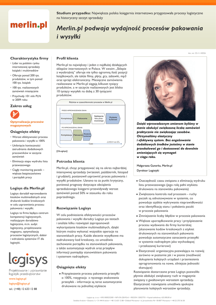 Studium przypadku: Największa polska księgarnia internetowa przygotowała procesy logistyczne na historyczny szczyt sprzedaży Merlin.pl podwaja wydajność procesów pakowania i wysyłki doc. ver. CS-11-140326 Charakterystyka firmy • Lider na polskim rynku internetowej sprzedaży książek i multimediów • Oferuje ponad 200 tys. produktów, w tym ponad 100 tys. książek • 100 tys. realizowanych zamówień miesięcznie • Przychody 101 mln PLN w 2009 roku Profil klienta Merlin.pl to największy i jeden z najdłużej działających sklepów internetowych w Polsce. W swoim „Sklepie z wyobraźnią” oferuje nie tylko ogromną ilość pozycji książkowych, ale także filmy, płyty, gry, zabawki, mp3 oraz sprzęt elektroniczny. Miesięczne zamówienia realizowane w Merlin.pl sięgają kilkuset tysięcy produktów, a w szczycie realizowanych jest blisko 10 tysięcy wysyłek na dobę z 30 tysiącami produktów. Zakres usług Optymalizacja procesów magazynowych Dzięki wprowadzonym zmianom byliśmy w stanie obsłużyć zwiększoną liczbę zamówień praktycznie nie zwiększając zasobów. Otrzymaliśmy elastyczny i efektywny system. Bez angażowania dodatkowych środków jesteśmy w stanie przeskalować go i dostosować do dowolnie zmieniających się wymagań w ciągu roku. Osiągnięte efekty • Wzrost efektywności procesu pakowania i wysyłki o 100% • Uniknięcie konieczności zatrudniania dodatkowych pracowników w szczycie zamówień • Eliminacja etapu wydruku listu przewozowego • Ciągły monitoring paczek – większe bezpieczeństwo i porządek pracy Logisys dla Merlin.pl Logisys doradził wprowadzenie kiosków multimedialnych oraz drukarek kodów kreskowych w celu usprawnienia procesu pakowania i wysyłki. Logisys to firma będąca centrum kompetencji logistycznych, realizującym doradztwo logistyczne, m.in. audyt logistyczny, projektowanie magazynu, optymalizację procesów logistycznych, dobór i wdrożenia systemów IT dla logistyki. [©Logisys] Potrzeba klienta Merlin.pl, chcąc przygotować się na okres najbardziej intensywnej sprzedaży (wrzesień, październik, listopad i grudzień), postanowił usprawnić proces pakowania i wysyłki produktów. Uznano to za punkt krytyczny, ponieważ prognozy dotyczące obciążenia sprzedażowego księgarni przewidywały wzrost zamówień ponad 50% w stosunku do roku poprzedniego. Rozwiązanie Logisys W celu podniesienia efektywności procesów pakowania i wysyłki doradcy Logisys po testach i analizie kilku rozwiązań zaproponowali wykorzystanie kiosków multimedialnych, dzięki którym można wykonać wszystkie operacje na stanowiskach pracy. Każde zlecenie wysyłkowe ma nadrukowany kod kreskowy, co umożliwia zachowanie porządku na stanowiskach pakowania, a także automatyzuje wydruk oraz przepływ informacji pomiędzy stanowiskiem pakowania i systemem nadrzędnym. Osiągnięte efekty www.logisys.pl [email protected] tel.: (+48) 12 633 12 88 Przyspieszenie procesu pakowania przesyłki o 100%, rezygnacja z ręcznego znakowania przesyłek - informacje są teraz automatycznie drukowane na jednolitej etykiecie Małgorzata Gunerka, Merlin.pl Dyrektor Logistyki Oszczędność czasu związana z eliminacją wydruku listu przewozowego (jego rolę pełni etykieta drukowana na stanowisku pakowania) Zwiększona kontrola nad procesem - ruchy paczek są odnotowywane w systemie, co powoduje szybkie wykrywanie nieprawidłowości oraz identyfikację stanu i położenia paczki w procesie pakowania Zmniejszenie liczby błędów w procesie pakowania Większe uporządkowanie pracy i przyśpieszenie procesu wydawania do firmy kurierskiej (skanowanie kodów kreskowych z etykiet drukowanych na stanowiskach pakowania powoduje automatyczne oznaczenie przesyłki w systemie nadrzędnym jako wychodzącej i przekazanej kurierowi) Elastyczność organizacyjna pozwalająca na rozwój zarówno w poziomie jak i w pionie (możliwość dokupienia kolejnych urządzeń i przeniesienia oprogramowania na nowe, silniejsze jednostki skanujące) Rozwiązanie dostarczone przez Logisys pozwoliło płynnie obsłużyć zwiększony ruch w magazynie związany z gwałtownym wzrostem sprzedaży. Elastyczność rozwiązania umożliwia spokojne planowanie kolejnych wzrostów sprzedaży. Logisys sp. z o.o. • KRS 0000232383 • NIP 676-228-92-61 • REGON 120027701 • Kapitał zakładowy: 625.000,00 zł Siedziba Kraków • Ostatnia 1c • 31-444 Kraków • +48 12 633 12 88 • Oddział Warszawa • al. Jerozolimskie 96 • 00-807 Warszawa • +48 22 275 56 58