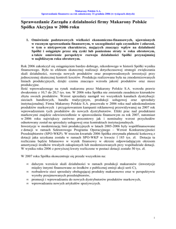 Makarony Polskie S.A. Sprawozdanie finansowe za rok zakończony 31 grudnia 2006 (w tysiącach złotych) ____________________________________________________________________________________________________ Sprawozdanie Zarządu z działalności firmy Makarony Polskie Spółka Akcyjna w 2006 roku 1. Omówienie podstawowych wielkości ekonomiczno-finansowych, ujawnionych w rocznym sprawozdaniu finansowym, w szczególności opis czynników i zdarzeń, w tym o nietypowym charakterze, mających znaczący wpływ na działalność Spółki i osiągnięte przez nią zyski lub poniesione straty w roku obrotowym, a takŜe omówienie perspektyw rozwoju działalności Spółki przynajmniej w najbliŜszym roku obrotowym. Rok 2006 zakończył się osiągnięciem bardzo dobrego, rekordowego w historii Spółki wyniku finansowego. Było to efektem skutecznej realizacji dotychczasowej strategii zwiększania skali działalności, rozwoju nowych produktów oraz przeprowadzonych inwestycji przy jednoczesnej skutecznej kontroli kosztów. Produkcja realizowana była na zmodernizowanych liniach produkcyjnych, dzięki czemu znacząco wzrosła jakość produktów oraz moce produkcyjne. Ilość wprowadzonego na rynek makaronu przez Makarony Polskie S.A. wzrosła prawie dwukrotnie z 10,7 do 20,7 tys. ton. W 2006 roku Spółka nie zmieniała zasadniczo kierunków zbytu swoich produktów. Wzrost sprzedaŜy nastąpił we wszystkich kanałach dystrybucji: sieciach handlowych, handlu tradycyjnym, produkcji usługowej oraz sprzedaŜy instytucjonalnej. Firma Makarony Polskie S.A. pracowała w 2006 roku nad udoskonaleniem produktów markowych i przygotowaniem kampanii reklamowej przewidywanej na 2007 rok wprowadzeniem tych produktów do nowych dystrybutorów. Efekt prac nad produktami markowymi znajdzie odzwierciedlenie w sprawozdaniu finansowym za rok 2007, natomiast w 2006 roku największy zarówno procentowy jak i nominalny wzrost przychodów odnotowany został na sprzedaŜy usługowej oraz kontraktach instytucjonalnych. Inwestycje w modernizację linii produkcyjnych w latach 2005-2006 były współfinansowane z dotacji w ramach Sektorowego Programu Operacyjnego – Wzrost Konkurencyjności Przedsiębiorstw (SPO-WKP). W trzecim kwartale 2006 Spółka otrzymała płatność końcową z dotacji jaka uzyskana została w ramach SPO-WKP w kwocie 1 185 tys. zł. Dotacja ta rozliczana będzie bilansowo w wynik finansowy w okresie odpowiadającym okresom amortyzacji środków trwałych zakupionych lub modernizowanych przy współudziale dotacji. W wyniku roku 2006 z powyŜszej kwoty rozliczone w postaci dotacji zostało 50 tys. zł. W 2007 roku Spółka skoncentruje się przede wszystkim na: • • • • dalszym wzroście skali działalności w ramach produkcji makaronów (inwestycje między innymi finansowane ze środków z publicznej emisji akcji serii C), rozbudowie sieci sprzedaŜy obsługującej produkty makaronowe oraz w perspektywie wyroby przejmowanych przedsiębiorstw, promocji i wprowadzaniu do nowych dystrybutorów produktów markowych, wprowadzaniu nowych artykułów spoŜywczych. 1 Makarony Polskie S.A. Sprawozdanie finansowe za rok zakończony 31 grudnia 2006 (w tysiącach złotych) ____________________________________________________________________________________________________ Omówienie zmian w podstawowych pozycjach sprawozdania finansowego za 2006 rok W roku 2006 Spółka zwiększyła przychody o 87 % (kalkulacyjny rachunek zysków i strat) do kwoty ponad 46,6 mln zł. Wzrost na produktach makaronowych wyniósł 78 %. Zostało to osiągnięte dzięki wzrostowi sprzedaŜy we wszystkich kategoriach produktowych oraz kanałach dystrybucji. Równocześnie suma bilansowa wzrosła o 21,4 % przy czym złoŜył się na to 15,6 % wzrost aktywów trwałych oraz 39,2 % wzrost aktywów obrotowych. W pasywach o 6,3 punktu procentowego do 65,1 % spadł udział finansowania aktywów kapitałem własnym. Wybrane dane finansowe Rachunek zysków i strat Przychody netto ze sprzedaŜy produktów, towarów i materiałów Przychody ze sprzedaŜy produktów Przychody ze sprzedaŜy towarów i materiałów Koszty sprzedanych produktów, towarów i materiałów Koszty sprzedanych produktów Koszty sprzedanych towarów Zysk (strata) brutto ze sprzedaŜy Koszty sprzedaŜy Koszty ogólnego zarządu Zysk (strata) ze sprzedaŜy Pozostałe przychody operacyjne Pozostałe koszty operacyjne Zysk (strata) z działalności operacyjnej Przychody finansowe Koszty finansowe Zysk (strata) na działalności gospodarczej Zysk (strata) brutto Zysk (strata) netto 2005 w tys. zł 2006 w tys. zł zmiana % 24 954 46 557 86,6 % 20 337 27 196 33,7 % 4 617 19 361 319,3 % 20 361 38 348 88,3 % 15 548 4 813 4 593 2 369 1 944 280 33 83 230 87 253 21 112 17 236 8 209 3 594 2 075 2 540 84 174 2 450 118 409 35,8 % 258,1 % 78,7 % 51,7 % 6,7 % 807,1 % 154,6 % 109,6 % 965,2 % 35,6 % 61,7 % 64 2 159 3 273,4 % 64 37 2 159 1 822 3 273,4 % 4 824,3 % Znaczący wzrost wielkości przychodów ze sprzedaŜy ogółem (86,6 %) osiągnięty został zarówno w kategorii produktów jak i towarów. Produkcja w zakładach Spółki mogła zostać zwiększona o 33,7 % dzięki procesowi inwestycyjnemu przeprowadzonemu w 2005 roku przy wsparciu dotacji. Niedostatek mocy produkcyjnych sprawił, iŜ Spółka zmuszona była do zlecania części produkcji innym podmiotom. Spośród ponad 19,4 mln zł przychodu ze sprzedaŜy towarów, 9,3 mln zł. pochodzi ze sprzedaŜy pszenicy zakupionej w Agencji Rynku Rolnego jako element realizacji kontraktu z tą instytucją. ZbliŜony procentowy wzrost zarówno przychodów netto ze sprzedaŜy (86,6 %) jak i kosztów sprzedanych produktów i towarów (88,3 %) przyniósł w efekcie 78,7 % wzrost zysku brutto ze sprzedaŜy. PowyŜszy efekt połączony z jedynie 31,4 % wzrostem kosztów sprzedaŜy oraz ogólnego zarządu zaowocował ponad 800 % wzrostem wyniku ze sprzedaŜy. Koszty ogólnego zarządu wykazały wzrost jedynie o 6,7 %, co przy tak znac