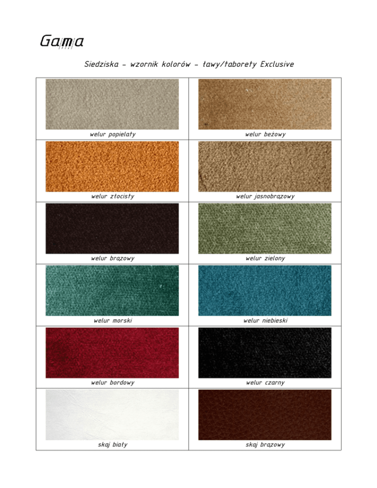 Siedziska - wzornik kolorów - ławy/taborety Exclusive welur popielaty welur beżowy welur złocisty welur jasnobrązowy welur brązowy welur zielony welur morski welur niebieski welur bordowy welur czarny skaj biały skaj brązowy skaj bordowy skaj czarny skóra – kolor biały skóra – kolor beżowy skóra – kolor jasnobrązowy skóra – kolor brązowy skóra – kolor bordowy skóra – kolor czarny Przedstawiony wzornik ma wyłącznie charakter poglądowy, kolory na monitorze mogą nieznacznie odbiegać od rzeczywistej kolorystyki. Dystrybutor ław i taboretów Exclusive ul. Górnośląska 17 43-200 Pszczyna tel: (32) 212 88 55 [email protected] www.pianina.pl