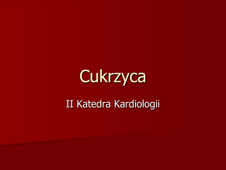 Cukrzyca II Katedra Kardiologii Definicja Cukrzyca (łac. Diabetes mellitus) grupa chorób metabolicznych charakteryzująca się hiperglikemią (podwyższonym poziomem cukru we krwi) wynikającą z defektu produkcji lub działania insuliny wydzielanej przez komórki beta trzustki Trzustka Wyspy Langerhansa – skupiska komórek endokrynnych w trzustce Kryteria rozpoznania cukrzycy Stężenie glukozy zmierzone o dowolnej porze doby przekracza 200 mg/dl i występują objawy hiperglikemii (polidypsja, poliuria), Dwukrotnie poziom glukozy na czczo przekracza 126 mg/dl (7,0 mmol/l), W 2 godzinie tesu doustnego obciążenia glukozą poziom glukozy przekracza 200 mg/dl (11,1 mmol/l). Stany przedcukrzycowe Nieprawidłowa glikemia na czczo (ang. IFG – Impaired Fasting Glucose): na czczo 100-125 mg/dl (5,6-6,9 mmol/l) lub Nieprawidłowa tolerancja glukozy (ang. IGT – Impaired Glucose Tolerance): w 2 godzinie testu doustnego obciążenia glukozą glikemia 140-199 mg/dl (7,8-11 mmol/l). Podział cukrzycy Cukrzyca t.1 Cukrzyca t.2 Cukrzyca ciężarnych Inne typy cukrzycy (spowodowane np. przez znane defekty genetyczne, endokrynopatie itd.) Cukrzyca t.1 Nazywana też cukrzycą insulinozależną U jej podłoża leży przewlekły, autoimmunologiczny proces chorobowy prowadzący do powolnego zniszczenia, produkujących insulinę, komórek β wysp trzustkowych i w następstwie tego do utraty zdolności jej wydzielania. Rzeczywisty niedobór insuliny Pełnoobjawowa cukrzyca typu 1, jeśli nie jest leczona za pomocą iniekcji insuliny, jest chorobą śmiertelną Cukrzyca t.1 - epidemiologia 10% wszystkich przypadków zachorowań na cukrzycę Najczęściej dotyczy dzieci, młodzieży i osób przed 30 r.ż. Początek choroby ma najczęściej miejsce między 12-15. rokiem życia Cukrzyca t.1 - objawy Uporczywe pragnienie Utrata masy ciała Senność, zmęczenie Częste oddawanie moczu Nudności W moczu pojawia się glukoza Oddech może nabrać zapachu acetonu Cukrzyca t.2 Nazywana też cukrzycą insulinoniezależną Pierwotnie charakteryzuje się opornością na insulinę, względnym niedoborem insuliny oraz hiperglikemią W początkowy okresie wzrost wydzielania insuliny Często bezobjawowa Najczęściej u osób otyłych gdyż otyłośc brzuszna ściśle wiąże się z insulinoopornością Cukrzyca t.2 W 1995 roku chorowało na nią 135 milionów osób na całym świecie według szacunkowych prognoz na rok 2025 liczba chorych może sięgnąć 300 milionów. liczba chorych na cukrzycę typu 2 w latach 1986 – 2000 wzrosła dwukrotnie. Cukrzyca t.2 - objawy Często bezobjawowo Otyłość Nasilone pragnienie Częste oddawanie moczu Nawracające zakażenia układu moczowego skóry Czyrak u pacjenta z cukrzycą Powikłania cukrzycy •Udar mózgu •Retinopatia •Zaćma •Nawracające infekcję błon śluzowych i dziąseł, paradontoza •Ch.n.s. •Nefropatia, niewydolność nerek •Infekcje układu moczowego •Polineuropatia •Miażdżyca obwowodowa •Stopa cukrzycowa Cukrzyca a narząd wzroku Retinopatia Najczęstsze powikłanie cukrzycy Uszkodzenie naczyń i włókien nerwowych w obrębie siatkówki Tworzenie nowych słabszych naczyń Krwotoki Bliznowacenie Ślepota Dno oka w retinopatii – krwotoki i tętniaki Krwotoki i wysięki w dnie oka chorego z retinopatią cukrzycową Tak widzi pacjent z retinopatią cukrzycową Obraz normalny i z oka z retinopatią Cukrzyca a nerki Uszkodzenie nerek spowodowane prze hiperglikemię, prowadzące do nefropatii, niewydolności nerek i w knsekwencji do dializoterapii Neuropatia cukrzycowa Definicja: Metaboliczne uszkodzenie włókien nerwowych Neuropatia obwodowa Zaburzenia czucia o typie „skarpetek” i „rękawiczek” Neuropatia autonomiczna zaburzenia pracy serca, nieprawidłowości ciśnienia tętniczego, zaburzenia pracy przewodu pokarmowego (głównie uporczywe biegunki), zaburzenia w oddawaniu moczu, impotencja. Badanie w neuropatii Badanie czucia monofilamentem w diagnostyce neuropatii cukrzycowej Stopa cukrzycowa Jedno z najpoważniejszych powikłań cukrzycy Dotyczy 6-10% chorych Jest powikłaniem wieloletniej, źle leczonej cukrzycy Rozpoczyna się najczęściej od zaburzeń czucia, z może zakończyć się amputacją Stopa cukrzycowa - patogeneza Przyspieszona miażdżyca w drobnych naczyniach powoduje niedokrwienie tkanek stopy Neuropatia powoduje zaburzenia czucia i brak bólu przy otarciach i drobnych uszkodzeniach skóry Upośledzenie procesu gojenia Zakażenia Deformacje stawów Neuropatyczny zespół stopy cukrzycowej Zmniejszone czucie bólu, temperatury i dotyku Uczucie palenia, mrowienia lub pieczenia Zmniejszona siła mięśni powoduje deformację stopy Zaburzenia odżywienia kości Upośledzona czynność gruczołów potowych związana z uszkodzeniem układu autonomicznego Osłabienie struktury kości Stopniowo postępujące odwapnienie i zaburzenia w unerwieniu stawów powodują powstanie tzw. neuroartropatii Objawia się to stopniowym, bezbolesnym uszkodzeniem chrząstek stawowych, osłabieniem siły mięśniowej i zmianami w szkielecie chrzęstnokostnym, co powoduje zaburzenia całej konstrukcji stopy. Prowadzi to do jej trwałej deformacji uniemożliwiającej chodzenie. Wrzód drążący ze zniszczeniem kości stępu w przebiegu neuropatycznej stopy cukrzycowej Stopa cukrzycowa niedokrwienna Stopa cukrzycowa – stan po amputacji Leczenie i zapobieganie stopie cukrzycowej Wzrokowa ocena stóp przy każdym badaniu chorego Właściwa higiena stóp Odpowiednio dobrane obuwie Zapobieganie urazom Natychmiastowe leczenie ran i zakażeń Właściwe wyrównanie cukrzycy Wkładki dla chorych z zespołem stopy cukrzycowej Odrębności choroby niedokrwiennej serca w cukrzycy Szybka progresja miażdżcy – zawały u młodych ludzi Miażdżyca w małych naczyniach Rozsiane zmiany miażdżycowe Brak lub niewielkie krążenie oboczne Bezbólowy przebieg niedokrwienia Gorsze wyniki leczenia (angioplastyki i bypassów) Leczenie cukrzycy - - Dieta