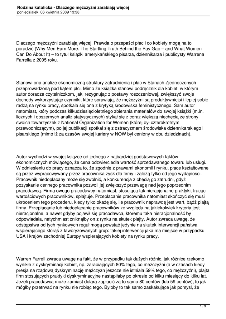 Rodzina katolicka - Dlaczego mężczyźni zarabiają więcej poniedziałek, 06 kwietnia 2009 13:38 Dlaczego mężczyźni zarabiają więcej. Prawda o przepaści płac i co kobiety mogą na to poradzić (Why Men Earn More. The Startling Truth Behind the Pay Gap – and What Women Can Do About It) – to tytuł książki amerykańskiego pisarza, dziennikarza i publicysty Warrena Farrella z 2005 roku. Stanowi ona analizę ekonomiczną struktury zatrudnienia i płac w Stanach Zjednoczonych przeprowadzoną pod kątem płci. Mimo że książka stanowi podręcznik dla kobiet, w którym autor doradza czytelniczkom, jak, rezygnując z postawy roszczeniowej, zwiększyć swoje dochody wykorzystując czynniki, które sprawiają, że mężczyźni są produktywniejsi i lepiej sobie radzą na rynku pracy, spotkała się ona z krytyką środowiska feministycznego. Sam autor natomiast, który podczas kilkudziesięcioletniego zbierania materiałów do swojej książki (m.in. licznych i obszernych analiz statystycznych) stykał się z coraz większą niechęcią ze strony swoich towarzyszek z National Organization for Women (której był czterokrotnym przewodniczącym), po jej publikacji spotkał się z ostracyzmem środowiska dziennikarskiego i pisarskiego (mimo iż za czasów swojej kariery w NOW był ceniony w obu dziedzinach). Autor wychodzi w swojej książce od jednego z najbardziej podstawowych faktów ekonomicznych mówiącego, że cena odzwierciedla wartość sprzedawanego towaru lub usługi. W odniesieniu do pracy oznacza to, że zgodnie z prawami ekonomii i rynku, płace kształtowane są przez wypracowywany przez pracownika zysk dla firmy i zależą tylko od jego wydajności. Pracownik niedopłacany może się zwolnić, a konkurencja z chęcią go zatrudni, gdyż pozyskanie cennego pracownika pozwoli jej zwiększyć przewagę nad jego poprzednim pracodawcą. Firma owego pracodawcy natomiast, stosująca tak nieracjonalne praktyki, tracąc wartościowych pracowników, splajtuje. Przepłacanie pracownika natomiast skończyć się musi ukróceniem tego procederu, kiedy tylko okażę się, ile pracownik naprawdę jest wart, bądź plajtą firmy. Przepłacanie lub niedopłacanie pracowników ze względu na jakiekolwiek kryteria jest nieracjonalne, a nawet gdyby pojawił się pracodawca, któremu taka nieracjonalność by odpowiadała, natychmiast zniknąłby on z rynku na skutek plajty. Autor zwraca uwagę, że odstępstwa od tych rynkowych reguł mogą powstać jedynie na skutek interwencji państwa wspierającego którąś z faworyzowanych grup: takiej interwencji jaka ma miejsce w przypadku USA i krajów zachodniej Europy wspierających kobiety na rynku pracy. Warren Farrell zwraca uwagę na fakt, że w przypadku tak dużych różnic, jak różnice rzekomo wynikłe z dyskryminacji kobiet, np. zarabiających 80% tego, co mężczyźni (a w czasach kiedy presja na rządową dyskryminację mężczyzn jeszcze nie istniała 59% tego, co mężczyźni), plajta firm stosujących praktyki dyskryminacyjne nastąpiłaby po okresie od kilku miesięcy do kilku lat. Jeżeli pracodawca może zamiast dolara zapłacić za to samo 80 centów (lub 59 centów), to jak mógłby przetrwać na rynku nie robiąc tego. Byłoby to tak samo zaskakujące jak pomysł, że 1/3 Rodzina katolicka - Dlaczego mężczyźni zarabiają więcej poniedziałek, 06 kwietnia 2009 13:38 można produkować coś kupując takie same surowce do produkcji warte 59 dolarów za 100, tylko na podstawie widzimisię. Autor zwraca również uwagę na fakt, że presja rządowa w USA wymusiła na firmach takie przywileje kobiet, że obecnie otrzymują one za tę samą pracę 20% więcej niż mężczyźni. Farrell wskazuje na 25 czynników dotyczących w większym stopniu mężczyzn niż kobiet, które to czynniki sprawiają, że ci pierwsi zarabiają więcej. Czynniki te można podzielić na pięć grup: - Kobiety pracują pod każdym względem krócej. Pracują mniej lat, mniej tygodni w roku i mniej godzin dziennie, rzadziej też biorą nadgodziny. Pracują krócej dla konkretnych pracodawców (mniej doświadczenia w danej firmie) i dwukrotnie częściej zwalniają się do lekarza (mimo że to mężczyźni są istotami słabszymi immunologicznie i zdrowotnie). - Kobiety rzadziej wybierają uciążliwe zawody, których wykonywanie naraża na złe warunki atmosferyczne, pracę w samotności, wysokie temperatury lub poziom hałasu itp. - Kobiety rzadziej wybierają niebezpieczne zawody (94% wypadków w pracy dotyczy mężczyzn) lub odpowiedzialne zawody (np. jako lekarze częściej są pediatrami niż chirurgami, ale w statystykach uogólnia się te różnice jako zawód lekarza). - Wybierają niepotrzebne na rynku i z tego względu niskopłatne branże i gałęzie gospodarki. - Wybierają bardziej satysfakcjonujące zawody, kosztem dochodów uzyskiwanych z pracy. Uogólniając te czynniki autor zauważa, że prowadzą one zawsze do po prostu mniejszej wydajności kobiet, i podaje najbardziej ewidentny tego przykład: sport. W sporcie większość kobiet nie miałaby w rywalizacji z mężczyznami żadnych szans, jednak poprzez stworzenie dla nich odrębnej kategorii, uzyskują one dochody z rywalizacji sportowej. Co więcej obecnie dąży się do realizacji feministycznego postulatu wyrównania pul nagród w obu kategoriach. 2/3 Rodzina katolicka - Dlaczego mężczyźni zarabiają więcej poniedziałek, 06 kwietnia 2009 13:38 Podając wymienione wyżej pięć czynników autor jednocześnie zauważa, że dochody uzyskiwane z pracy nie mają się wprost proporcjonalnie lecz odwrotnie proporcjonalnie do tzw. wolności rzekomo uzyskiwanej dzięki pracy. Wysoki dochód nie koreluje z satysfakcją z pracy, jej jakością i bezpieczeństwem, ani wolnym czasem, lecz musi być okupiony rezygnacją z tychże korzyści. Ponadto dochód uzyskiwany z pracy zarobkowej znacznie częściej jest wydatkowany przez mężczyzn na zaspokajanie potrzeb kobiet niż przez kobie