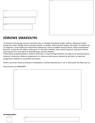 ZDROWE SMAKOŁYKI W okresie intensywnego wzrostu naturalne jest, że człowiek potrzebuje energii. Jednym z głównych źródeł energii jest cukier, dlatego dzieci kochają wszystko, co słodkie. Dobrze jednak zadbać, aby cukier nie kojarzył się im wyłącznie z wszechobecnymi kolorowymi słodyczami, które są źródłem pustych kalorii. Warto uświadamiać dzieciom, co jest dla nich dobre i pokazywać im naturalne słodkości, które oprócz lepszych, złożonych cukrów, zawierają też inne, potrzebne do prawidłowego rozwoju składniki. Proponujemy przeprowadzenie z dziećmi warsztatu, w czasie którego dowiemy się, jakie są ich przyzwyczajenia związane z jedzeniem słodyczy, podpowiemy im zdrowsze alternatywy i pokażemy, jak łatwo i przyjemnie przygotować słodkości w warunkach domowych. Filmik z warsztatu robienia zdrowych smakołyków ze Szkoły Podstawowej nr 107 w Warszawie do obejrzenia na: http://vimeo.com/60038989 POTRZEBUJEMY: Jeśli do warsztatu możecie wykorzystać zaplecze kuchenne szkoły – to świetnie. Warsztat można jednak bez problemu przygotować w klasie. Potrzebna będzie kuchenka lub palnik (np. palnik turystyczny). Jeśli planujecie wykonanie wszystkich trzech części warsztatu, przygotujcie również blender/mikser do przygotowania koktajlu. Dzieciom trzeba zapewnić miejsce do lepienia słodyczy, zadbać o odpowiednią liczbę stołów i krzesełek. Poniżej nasza lista niezbędnych sprzętów opatrzona praktycznymi komentarzami: Fartuszki (dzieci mogą przynieść je z domu) lub duże serwetki. Będą potrzebne przy lepieniu słodyczy. Cerata lub obrus papierowy do wyłożenia stolików. Pomoże to zachować czystość i ułatwi sprzątanie. Można oczywiście pracować na umytych wcześniej stołach, ale gwarantujemy, że wszystko będzie się lepić. Talerzyki i kubeczki. My korzystałyśmy z plastikowych, ale jeśli w szkole jest wystarczająco dużo naczyń ceramicznych, warto ich użyć. Miseczki lub talerzyki potrzebne do wyłożenia suszonych owoców, bakalii i przypraw. Przynajmniej dwie duże miski do mieszania produktów. Rzutnik, jeśli planujesz pokazać dzieciom prezentację ze zdjęciami do pierwszej części warsztatu. Listy produktów niezbędnych do przygotowania poszczególnych potraw znajdują się poniżej, przy odpowiedniej części warsztatu. JAK TO ROBIMY: Część pierwsza Lista zakupów: pestki dyni słonecznik żurawina morele śliwki suszone orzechy laskowe orzechy włoskie rodzynki migdały wiórki kokosowe miód wanilia cynamon. Ilość zależy od liczby uczestników warsztatu. Ważne, żeby każde z dzieci miało możliwość spróbowania wszystkiego. Wybierz produkty, których dzieci będą próbować, i przygotuj proste informacje o ich właściwościach (np. orzechy wspomagają pracę mózgu; suszone owoce mają dużo dobrego cukru i witamin, są źródłem energii; żurawina ma dużo witaminy C i dobrze jest ją jeść w wypadku przeziębienia; miód ma liczne właściwości prozdrowotne i antybakteryjne). Warto przygotować sobie zdjęcia – w formie wydruku, wycinków z gazety lub prezentacji – owoców, kwiatów czy drzew (np. cynamonowiec), z których pochodzą poszczególne produkty. Jeśli jest akurat sezon na owoce, można zamiast zdjecia pokazać po prostu świeżą śliwkę czy morelę. Produkty przesyp do miseczek. Większe, takie jak morele czy śliwki, sugerujemy pokroić na mniejsze kawałki. Miseczki ustaw tak, aby dzieci mogły swobodnie do nich podejść i wszystkiego spróbować, powąchać czy dotknąć. Dobrym pomysłem jest posadzenie dzieci w półokręgu na podłodze. Rozpocznij rozmowę pytaniem o cukier. Skąd się bierze? Skąd pochodzi cukier w cukiernicy? Jeśli dzieci same nie będą znały odpowiedzi, opowiedz im krótko o buraku cukrowym, trzcinie cukrowej i owocach jako źródle cukru. Wspomnij o przewadze cukru zawartego w owocach nad cukrem zawartym w słodyczach i napojach. Zacznij od pokazania świeżych produktów/owoców lub ich zdjęć i poproś dzieci o wskazanie miseczek z ich suszonymi odpowiednikami. Prezentacja produktu jest punktem wyjścia do zadawania pytań: czy dana rzecz im smakuje czy też nie – dlaczego? Czy jedzą takie produkty w domu? Jeśli tak, to przy jakiej okazji? Jeśli chodzi o przyprawy, spytaj dzieci, z czym im się kojarzą i w jakich produktach występują (np. wanilia – lody waniliowe). Spytaj też uczniów, jakie są ich ulubione napoje. Zwróć uwagę, że w kolorowych napojach jest bardzo dużo cukru i sztucznych barwników. Wspomnij, że sami mogą zrobić smaczny napój, na przykład z wody, miodu i cytryny. Na zakończenie sprawdź, czy dzieci zapamiętały najważniejsze informacje. Możesz pokazać raz jeszcze zdjęcia i zapytać, co zapamiętały o dobroczynnym działaniu każdego z produktów. Część druga Lista zakupów: Do słodkich kulek (ilość sugerowana na 15 osób): migdały (300g) orzechy (nie solone, włoskie lub laskowe) (200g) sezam (100g) bułka tarta (400g) płatki owsiane (dwie szklanki) banan (4-5 sztuk) miód (450g) cynamon (do smaku). Do obtaczania: wiórki kokosowe kakao. Przepis można dowolnie modyfikować. Ważne jest tylko, żeby konsystencja pozwalała na lepienie kulek. Migdały i orzechy trzeba zmielić najdrobniej jak się da. Można je wcześniej pogrzać w piekarniku, będą bardziej aromatyczne (10 min na 180 stopni), ale nie jest to konieczne. Mielone bakalie dobrze jest przygotować wcześniej w domu. W czasie warsztatu pokazuj dzieciom całe migdały i orzechy i tłumacz, że to właśnie jest podstawa, z której będziecie lepić słodycze. Ważne, aby dzieci na każdym etapie prac widziały, co się dzieje. Nauczyciel powinien mówić o tym, co robi i tłumaczyć każdy krok. Do zmielonych orzechów i migdałów dodaj bułkę tartą, sezam, cynamon, płatki owsiane i banana (jeśli jest dojrzały, nie trzeba go nawet kroić). Podgrzej miód na kuchence lub palniku (nie musi zawrzeć, wystarcz