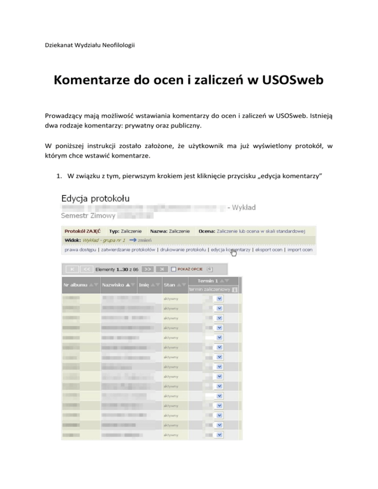 Dziekanat Wydziału Neofilologii Komentarze do ocen i zaliczeo w USOSweb Prowadzący mają możliwośd wstawiania komentarzy do ocen i zaliczeo w USOSweb. Istnieją dwa rodzaje komentarzy: prywatny oraz publiczny. W poniższej instrukcji zostało założone, że użytkownik ma już wyświetlony protokół, w którym chce wstawid komentarze. 1. W związku z tym, pierwszym krokiem jest kliknięcie przycisku „edycja komentarzy” 2. Pod każdym polem oceny pojawią się dwa pola tekstowe umożliwiające wstawienie komentarza. Pierwszy komentarz (prywatny) jest widoczny dla wszystkich osób mających dostęp do danego wiersza protokołu (koordynatora przedmiotu, prowadzących grup, egzaminatorów). Drugi komentarz (publiczny) jest ponadto widoczny dla związanego z nim studenta. 3. Po wstawieniu komentarzy należy zapisad zmiany klikając na przycisk „Zapisz” (limit znaków dla jednego komentarza: około 200 znaków). UWAGA! Wprowadzanie ocen za pomocą USOSweb nie musi służyd wyłącznie generowaniu protokołów. Wpisanie oceny skutkuje pojawieniem się jej na koncie studenta. W związku z tym jest to dobra metoda ogłaszania wyników koocowego zaliczenia czy egzaminu. Dzięki tej funkcji dbamy o poufnośd danych osobowych, ponieważ ocena jest widoczna tylko dla studenta, któremu została wystawiona.