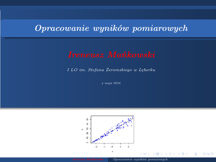 Opracowanie wyników pomiarowych Ireneusz Mańkowski I LO im. Stefana Żeromskiego w Lęborku 4 maja 2016 Ireneusz Mańkowski Opracowanie wyników pomiarowych Graficzne opracowanie wyników pomiarów Celem pomiarów jest potwierdzenie związku lub znalezienie zależności pomiędzy wielkościami fizycznymi przedstawienie wyników najczęściej w postaci graficznej - wykresu Ireneusz Mańkowski Opracowanie wyników pomiarowych Zasady rysowania wykresów w fizyce. Rysowanie wykresów 1 Wykresy rysujemy najczęściej we współrzędnych kartezjańskich. Dobierając skale wykresu kierujemy się następującymi zasadami: Ireneusz Mańkowski Opracowanie wyników pomiarowych Zasady rysowania wykresów w fizyce. Rysowanie wykresów 1 Wykresy rysujemy najczęściej we współrzędnych kartezjańskich. 2 Wykonujemy je ręcznie lub za pomocą komputera. Dobierając skale wykresu kierujemy się następującymi zasadami: Ireneusz Mańkowski Opracowanie wyników pomiarowych Zasady rysowania wykresów w fizyce. Rysowanie wykresów 1 Wykresy rysujemy najczęściej we współrzędnych kartezjańskich. 2 Wykonujemy je ręcznie lub za pomocą komputera. 3 Wykresy sporządzane ręcznie wykonujemy na papierze milimetrowym A4 lub A5 odpowiednio dobierając odpowiednie skale na osiach y oraz x. Dobierając skale wykresu kierujemy się następującymi zasadami: Ireneusz Mańkowski Opracowanie wyników pomiarowych Zasady rysowania wykresów w fizyce. Rysowanie wykresów 1 Wykresy rysujemy najczęściej we współrzędnych kartezjańskich. 2 Wykonujemy je ręcznie lub za pomocą komputera. 3 Wykresy sporządzane ręcznie wykonujemy na papierze milimetrowym A4 lub A5 odpowiednio dobierając odpowiednie skale na osiach y oraz x. Dobierając skale wykresu kierujemy się następującymi zasadami: 1 Wykres powinien obejmować wszystkie lub prawie wszystkie punkty pomiarowe. Ireneusz Mańkowski Opracowanie wyników pomiarowych Zasady rysowania wykresów w fizyce. Rysowanie wykresów 1 Wykresy rysujemy najczęściej we współrzędnych kartezjańskich. 2 Wykonujemy je ręcznie lub za pomocą komputera. 3 Wykresy sporządzane ręcznie wykonujemy na papierze milimetrowym A4 lub A5 odpowiednio dobierając odpowiednie skale na osiach y oraz x. Dobierając skale wykresu kierujemy się następującymi zasadami: 1 Wykres powinien obejmować wszystkie lub prawie wszystkie punkty pomiarowe. 2 Skale muszą być tak dobrane, aby format wykresu był zbliżony do kwadratu lub formatu papieru milimetrowego. Ireneusz Mańkowski Opracowanie wyników pomiarowych Zasady rysowania wykresów w fizyce. Rysowanie wykresów 1 Wykresy rysujemy najczęściej we współrzędnych kartezjańskich. 2 Wykonujemy je ręcznie lub za pomocą komputera. 3 Wykresy sporządzane ręcznie wykonujemy na papierze milimetrowym A4 lub A5 odpowiednio dobierając odpowiednie skale na osiach y oraz x. Dobierając skale wykresu kierujemy się następującymi zasadami: 1 Wykres powinien obejmować wszystkie lub prawie wszystkie punkty pomiarowe. 2 Skale muszą być tak dobrane, aby format wykresu był zbliżony do kwadratu lub formatu papieru milimetrowego. 3 Działki skali dobieramy tak, aby można było znaleźć wartości współrzędnych punktu - działki powinny mieć „okrągłe wartości” np. 5, 10, 20, 25 mm nie zaś 5,6, 10,5 itp. Ireneusz Mańkowski Opracowanie wyników pomiarowych Zasady rysowania wykresów w fizyce. Rysowanie wykresów 1 Wykresy rysujemy najczęściej we współrzędnych kartezjańskich. 2 Wykonujemy je ręcznie lub za pomocą komputera. 3 Wykresy sporządzane ręcznie wykonujemy na papierze milimetrowym A4 lub A5 odpowiednio dobierając odpowiednie skale na osiach y oraz x. Dobierając skale wykresu kierujemy się następującymi zasadami: 1 Wykres powinien obejmować wszystkie lub prawie wszystkie punkty pomiarowe. 2 Skale muszą być tak dobrane, aby format wykresu był zbliżony do kwadratu lub formatu papieru milimetrowego. 3 Działki skali dobieramy tak, aby można było znaleźć wartości współrzędnych punktu - działki powinny mieć „okrągłe wartości” np. 5, 10, 20, 25 mm nie zaś 5,6, 10,5 itp. 4 Osie układu muszą być opisane. Ireneusz Mańkowski Opracowanie wyników pomiarowych Przykład - wahadło matematyczne Ireneusz Mańkowski Opracowanie wyników pomiarowych Przykład - wahadło matematyczne Zależność matematyczna wynikająca z ruchu wahadła 2 4 π T2 = ( )L g Ireneusz Mańkowski Opracowanie wyników pomiarowych (1) Przykład - wahadło matematyczne Doświadczenie 1 Swobodny koniec wahadła matematycznego należy przyczepić do ściany lub brzegu stołu tak, aby cała nić, obciążona masą m, zwisała swobodnie. 2 Wahadło wprawiamy w ruch w jednej płaszczyźnie poprzez ◦ wychylenie go z położenia równowagi o mały kąt, rzędu 1–7 . Podczas całego pomiaru należy dbać o to, aby ciało o masie m nie wykonywało dodatkowych ruchów (np. nie kręciło się dookoła własnej osi obrotu), oraz o to, aby w trakcie ruchu nić i ciało nie napotykały na żadne przeszkody. Ireneusz Mańkowski Opracowanie wyników pomiarowych Przykład - wahadło matematyczne Pomiary 1 Przed przystąpieniem do pomiarów należy zapoznać się z przyrządami: czasomierzem i przymiarem metrowym oraz odczytać systematyczne błędy pomiarowe z nimi związane tzn. najmniejsze działki obu tych przyrządów. Uwaga. Największa niedokładność w pomiarze okresu drgań może być wprowadzona poprzez nieskoordynowanie chwili włączania czasomierza i wprawiania wahadła w ruch. Stąd pomiar czasu dziesięciu pełnych drgań zamiast jednego okresu. Ireneusz Mańkowski Opracowanie wyników pomiarowych Przykład - wahadło matematyczne Zapamietaj ! Dla zegarka z sekundnikiem ⇒ ∆t = 1 s Dla stopera ⇒ ∆t = 0, 01 s Dla pomiaru długości linijką ⇒ ∆L = 0, 001 m Dane doświadczalne zestawiamy w tabeli (wiersz drugi i trzeci), a wartości w wierszu czwartym i piątym odpowiednio przeliczamy: Nr.pomiaru 1 2 L[m] t[s] 