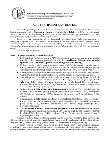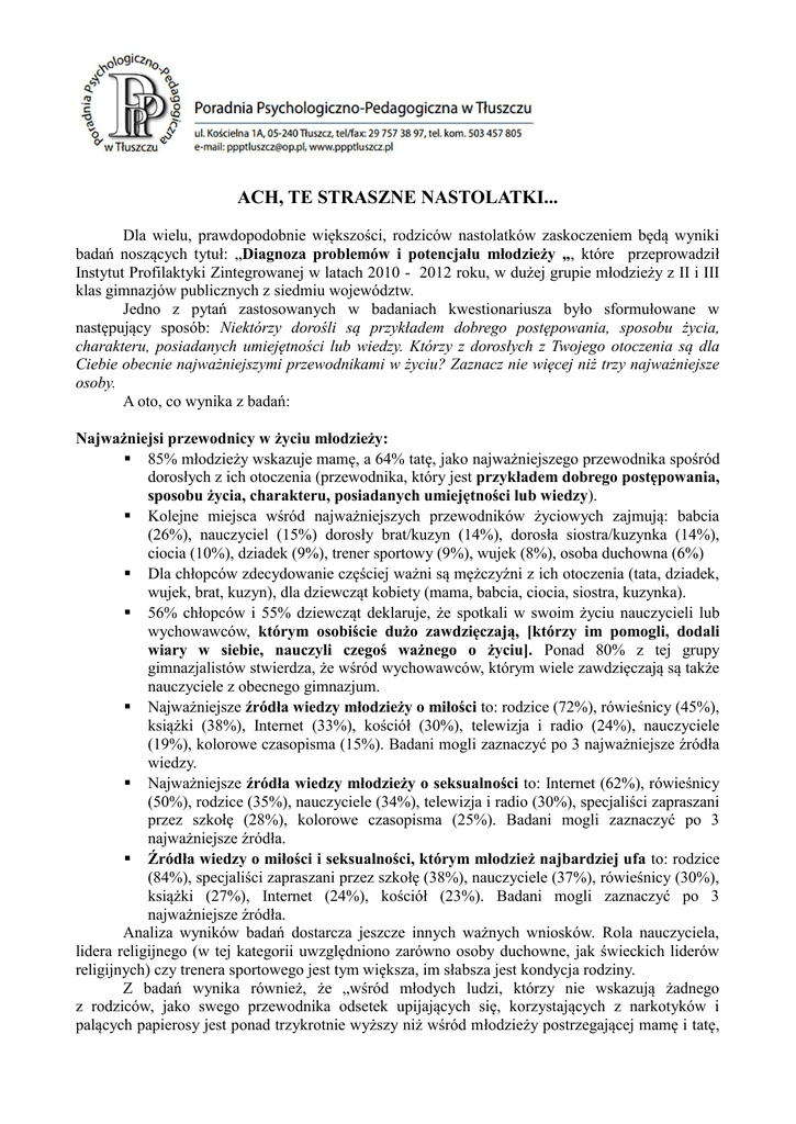 ACH, TE STRASZNE NASTOLATKI... Dla wielu, prawdopodobnie większości, rodziców nastolatków zaskoczeniem będą wyniki badań noszących tytuł: „Diagnoza problemów i potencjału młodzieży „, które przeprowadził Instytut Profilaktyki Zintegrowanej w latach 2010 - 2012 roku, w dużej grupie młodzieży z II i III klas gimnazjów publicznych z siedmiu województw. Jedno z pytań zastosowanych w badaniach kwestionariusza było sformułowane w następujący sposób: Niektórzy dorośli są przykładem dobrego postępowania, sposobu życia, charakteru, posiadanych umiejętności lub wiedzy. Którzy z dorosłych z Twojego otoczenia są dla Ciebie obecnie najważniejszymi przewodnikami w życiu? Zaznacz nie więcej niż trzy najważniejsze osoby. A oto, co wynika z badań: Najważniejsi przewodnicy w życiu młodzieży: 85% młodzieży wskazuje mamę, a 64% tatę, jako najważniejszego przewodnika spośród dorosłych z ich otoczenia (przewodnika, który jest przykładem dobrego postępowania, sposobu życia, charakteru, posiadanych umiejętności lub wiedzy). Kolejne miejsca wśród najważniejszych przewodników życiowych zajmują: babcia (26%), nauczyciel (15%) dorosły brat/kuzyn (14%), dorosła siostra/kuzynka (14%), ciocia (10%), dziadek (9%), trener sportowy (9%), wujek (8%), osoba duchowna (6%) Dla chłopców zdecydowanie częściej ważni są mężczyźni z ich otoczenia (tata, dziadek, wujek, brat, kuzyn), dla dziewcząt kobiety (mama, babcia, ciocia, siostra, kuzynka). 56% chłopców i 55% dziewcząt deklaruje, że spotkali w swoim życiu nauczycieli lub wychowawców, którym osobiście dużo zawdzięczają, [którzy im pomogli, dodali wiary w siebie, nauczyli czegoś ważnego o życiu]. Ponad 80% z tej grupy gimnazjalistów stwierdza, że wśród wychowawców, którym wiele zawdzięczają są także nauczyciele z obecnego gimnazjum. Najważniejsze źródła wiedzy młodzieży o miłości to: rodzice (72%), rówieśnicy (45%), książki (38%), Internet (33%), kościół (30%), telewizja i radio (24%), nauczyciele (19%), kolorowe czasopisma (15%). Badani mogli zaznaczyć po 3 najważniejsze źródła wiedzy. Najważniejsze źródła wiedzy młodzieży o seksualności to: Internet (62%), rówieśnicy (50%), rodzice (35%), nauczyciele (34%), telewizja i radio (30%), specjaliści zapraszani przez szkołę (28%), kolorowe czasopisma (25%). Badani mogli zaznaczyć po 3 najważniejsze źródła. Źródła wiedzy o miłości i seksualności, którym młodzież najbardziej ufa to: rodzice (84%), specjaliści zapraszani przez szkołę (38%), nauczyciele (37%), rówieśnicy (30%), książki (27%), Internet (24%), kościół (23%). Badani mogli zaznaczyć po 3 najważniejsze źródła. Analiza wyników badań dostarcza jeszcze innych ważnych wniosków. Rola nauczyciela, lidera religijnego (w tej kategorii uwzględniono zarówno osoby duchowne, jak świeckich liderów religijnych) czy trenera sportowego jest tym większa, im słabsza jest kondycja rodziny. Z badań wynika również, że „wśród młodych ludzi, którzy nie wskazują żadnego z rodziców, jako swego przewodnika odsetek upijających się, korzystających z narkotyków i palących papierosy jest ponad trzykrotnie wyższy niż wśród młodzieży postrzegającej mamę i tatę, jako swój autorytet. Wśród gimnazjalistów, którzy nie wskazują żadnego z rodziców, jako swojego autorytetu odsetek młodzieży, której zdarzyło się mieć myśli samobójcze „przynajmniej raz w ostatnim roku” jest niemal trzykrotnie wyższy niż wśród młodzieży, która dostrzega w rodzicach ważnych przewodników. Podobnie rzecz ma się z kontaktami seksualnymi, gdzie odsetek młodzieży po inicjacji seksualnej jest trzykrotnie większy w (liczącej 10%) grupie młodzieży, która nie zaznacza ani mamy, ani taty, jako przewodnika. Bycie sprawcą przemocy rówieśniczej „w okresie ostatnich 30 dni” zdarza się trzykrotnie rzadziej w grupie młodzieży wskazującej oboje rodziców, jako swoich przewodników, a bycie sprawcą cyber - przemocy „w okresie ostatnich 12 miesięcy” dwukrotnie rzadziej niż w grupie niewskazującej żadnego z rodziców, jako swojego autorytetu.” W świetle tych badań bardzo wiarygodne wydają się następujące słowa LISTU DO RODZICÓW. Kochani Rodzice! Wiem, że bardzo mnie kochacie! Wiem, że jestem dla was kimś bardzo ważnym. Wiem, że troszczycie się o mój rozwój i o moja przyszłość. Ale nie wiem, czy Wy też wiecie, ze ja bardzo Was KOCHAM i że jesteście dla mnie najważniejsi, Pewnie trudno wam w to uwierzyć, szczególnie wtedy, gdy mam ….naście lat, trzaskam drzwiami, a na wasze uwagi często ironicznie wzruszam ramionami. Nie chce się usprawiedliwiać, ale w tym wieku często bywa tak, że robię coś, co wygląda na złośliwość, ośli upór i arogancję, lecz w rzeczywistości mnie samemu też to bardzo przeszkadza. PROSZĘ – przeczekajcie to wszystko jak świnkę, ospę, zapalenie ucha czy inne przypadłości. BARDZO PROSZĘ – nigdy nie wątpcie w to, że to właśnie WY jesteście dla mnie najważniejsi. Z wcześniej cytowanych badań wynika optymistyczny wniosek, że „ponad 2/3 młodych ludzi czuło się wysłuchanych i zrozumianych w ostatniej rozmowie z rodzicami o ważnych dla siebie sprawach”. I chociaż tylko niewielu spośród tych rodziców przeszło specjalne warsztaty wychowawcze, to wystarczyła ich dobra wola i miłość, by będące w tym trudnym wieku nastoletnie dzieci w tak dużym procencie czuły się wysłuchane i zrozumiane. Grupa rówieśnicza dla nastolatków jest bardzo ważnym odniesieniem, ale okazuje się, że rodzice i wartości, którymi żyją, na co dzień, są swoistym kompasem w życiu swoich dzieci. Nastolatki potrzebują rodziców i tego, żeby rodzice z nimi rozmawiali, a nie tylko, do nich mówili. Z szeregu rozmów z niespokojnymi, samotnymi nastolatkami (narodowość tu nie odgrywa znaczącej roli) wynika jeden podstawo