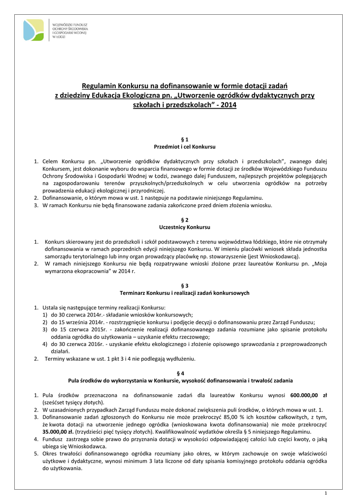 Regulamin Konkursu na dofinansowanie w formie dotacji zadań z dziedziny Edukacja Ekologiczna pn. „Utworzenie ogródków dydaktycznych przy szkołach i przedszkolach” - 2014 §1 Przedmiot i cel Konkursu 1. Celem Konkursu pn. „Utworzenie ogródków dydaktycznych przy szkołach i przedszkolach”, zwanego dalej Konkursem, jest dokonanie wyboru do wsparcia finansowego w formie dotacji ze środków Wojewódzkiego Funduszu Ochrony Środowiska i Gospodarki Wodnej w Łodzi, zwanego dalej Funduszem, najlepszych projektów polegających na zagospodarowaniu terenów przyszkolnych/przedszkolnych w celu utworzenia ogródków na potrzeby prowadzenia edukacji ekologicznej i przyrodniczej. 2. Dofinansowanie, o którym mowa w ust. 1 następuje na podstawie niniejszego Regulaminu. 3. W ramach Konkursu nie będą finansowane zadania zakończone przed dniem złożenia wniosku. §2 Uczestnicy Konkursu 1. 2. Konkurs skierowany jest do przedszkoli i szkół podstawowych z terenu województwa łódzkiego, które nie otrzymały dofinansowania w ramach poprzednich edycji niniejszego Konkursu. W imieniu placówki wniosek składa jednostka samorządu terytorialnego lub inny organ prowadzący placówkę np. stowarzyszenie (jest Wnioskodawcą). W ramach niniejszego Konkursu nie będą rozpatrywane wnioski złożone przez laureatów Konkursu pn. „Moja wymarzona ekopracownia” w 2014 r. §3 Terminarz Konkursu i realizacji zadań konkursowych 1. Ustala się następujące terminy realizacji Konkursu: 1) do 30 czerwca 2014r.- składanie wniosków konkursowych; 2) do 15 września 2014r. - rozstrzygnięcie konkursu i podjęcie decyzji o dofinansowaniu przez Zarząd Funduszu; 3) do 15 czerwca 2015r. - zakończenie realizacji dofinansowanego zadania rozumiane jako spisanie protokołu oddania ogródka do użytkowania – uzyskanie efektu rzeczowego; 4) do 30 czerwca 2016r. - uzyskanie efektu ekologicznego i złożenie opisowego sprawozdania z przeprowadzonych działań. 2. Terminy wskazane w ust. 1 pkt 3 i 4 nie podlegają wydłużeniu. §4 Pula środków do wykorzystania w Konkursie, wysokość dofinansowania i trwałość zadania 1. Pula środków przeznaczona na dofinansowanie zadań dla laureatów Konkursu wynosi 600.000,00 zł (sześćset tysięcy złotych). 2. W uzasadnionych przypadkach Zarząd Funduszu może dokonać zwiększenia puli środków, o których mowa w ust. 1. 3. Dofinansowanie zadań zgłoszonych do Konkursu nie może przekroczyć 85,00 % ich kosztów całkowitych, z tym, że kwota dotacji na utworzenie jednego ogródka (wnioskowana kwota dofinansowania) nie może przekroczyć 35.000,00 zł. (trzydzieści pięć tysięcy złotych). Kwalifikowalność wydatków określa § 5 niniejszego Regulaminu. 4. Fundusz zastrzega sobie prawo do przyznania dotacji w wysokości odpowiadającej całości lub części kwoty, o jaką ubiega się Wnioskodawca. 5. Okres trwałości dofinansowanego ogródka rozumiany jako okres, w którym zachowuje on swoje właściwości użytkowe i dydaktyczne, wynosi minimum 3 lata liczone od daty spisania komisyjnego protokołu oddania ogródka do użytkowania. 1 §5 Kwalifikacja kosztów zadań zgłoszonych do Konkursu 1. Kosztami kwalifikującym się do dofinansowania ze środków Funduszu są wyłącznie koszty spełniające łącznie następujące warunki: 1) są niezbędne do utworzenia ogródka dydaktycznego; 2) zostały dokonane w sposób oszczędny tzn. w oparciu o zasadę dążenia do uzyskania założonych efektów przy jak najniższej kwocie wydatku, z uwzględnieniem przepisów Prawa zamówień publicznych lub zasady konkurencyjności; 3) zostały należycie udokumentowane rachunkami lub fakturami; 4) zostały poniesione po dniu złożenia wniosku o dofinansowanie. 2. Koszty kwalifikowane (wnioskowaną kwotę dotacji i udział własny) mogą stanowić: 1) zakup sadzonek roślin wieloletnich, bylin; 2) zakup nasion trawy, warzyw i ziół; 3) koszty przygotowania gruntu pod nasadzenia i koszty dokonania nasadzeń, zakup żwiru, ziemi, kory, torfu, geowłókniny itp.; 4) koszty prac pielęgnacyjnych istniejących drzew i krzewów; 5) zakup/wykonanie tablic dydaktycznych, plansz, tabliczek do oznaczenia gatunków roślin, gier/instalacji dydaktycznych o tematyce przyrodniczej i ekologicznej np. typu światowid, rumowiska skalnego/stanowiska geologicznego, stacji meteorologicznej z wyposażeniem, zegarów słonecznych, domków dla owadów, rzeźb zwierząt/roślin, uli dydaktycznych, budek/poidełek dla ptaków, ścieżek sensorycznych itp.; 6) zakup/wykonanie innych elementów wyposażenia ogródka: koszy na odpady, oczka wodnego, kaskady wodnej, mostków, pergoli, palisad, kompostownika, gazonów drewnianych, itp.; 7) utworzenie miejsca do prowadzenia zajęć tj.: zakup/montaż ławek, stołów, wiat/zadaszeń, itp.; 8) koszty zakupu drobnego sprzętu ogrodniczego np. konewek, grabi, szpadli, itp.; 9) zakup pomocy dydaktycznych do programu edukacyjnego realizowanego w oparciu o powstały ogródek np.: lup, lornetek, przewodników, atlasów roślin i zwierząt, kluczy do oznaczenia gatunków roślin/zwierząt, zestawów badawczych, przenośnych stacji meteorologicznych, zabawkowych sprzętów ogrodniczych, itp.; 10) zakup i montaż systemów nawadniających. 3. Koszty niekwalifikowane (wyłącznie udział własny) mogą stanowić: 1) dokumentacja projektowa; 2) koszty nadzoru nad pracami pielęgnacyjnymi istniejących drzew i krzewów; 3) zakup/wykonanie tablic informacyjnych o dofinansowaniu zadania przez Fundusz; 4) wykonanie/modernizacja alejek, krawężników, w tym zakup kostki brukowej, płyt chodnikowych, obrzeża betonowego, itd.; 5) wykonanie/modernizacja placu zabaw (tj. huśtawek, zjeżdżalni, karuzeli, piaskownic itp.); 6) ogrodzenie ogródka (naprawa, wykonanie, demontaż starego); 7) system monitoringu ogródka. 4. W ramach udziału własnego mogą być uwzględniane koszty poniesione do 6 miesięcy przed datą złożenia wniosku. 5. Na uzasadniony, pisemny