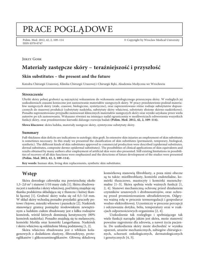 PRACE POGLĄDOWE Polim. Med. 2012, 42, 2, 109–114 ISSN 0370-0747 © Copyright by Wroclaw Medical University Jerzy Gosk Materiały zastępcze skóry – teraźniejszość i przyszłość Skin substitutes – the present and the future Katedra Chirurgii Urazowej, Klinika Chirurgii Urazowej i Chirurgii Ręki, Akademia Medyczna we Wrocławiu Streszczenie Ubytki skóry pełnej grubości są najczęściej wskazaniem do wykonania autologicznego przeszczepu skóry. W rozległych jej uszkodzeniach czasami konieczne jest zastosowanie materiałów zastępczych skóry. W pracy przedstawiono podział materiałów zastępczych skóry (stałe, czasowe, biologiczne, syntetyczne), oraz zaprezentowano różne rodzaje substytutów dopuszczonych do masowej produkcji (substytuty naskórka, substytuty skóry właściwej, substytuty złożone skórno-naskórkowe). Ponadto zaprezentowano przypadki zastosowań klinicznych materiałów zastępczych skóry oraz wyniki uzyskane przez wielu autorów po ich zastosowaniu. Wskazano również na istniejące nadal ograniczenia w możliwościach odtworzenia wszystkich funkcji skóry, oraz przedstawiono kierunki dalszego rozwoju badań (Polim. Med. 2012, 42, 2, 109–114). Słowa kluczowe: skóra ludzka, materiały zastępcze skóry, syntetyczne substytuty skóry. Summary Full-thickness skin deficits are indications to autologic skin graft. In extensive skin injuries an employment of skin substitutes is sometimes necessary. In this study we presented the classification of skin substitutes (permanent, temporary, biological, synthetic). The different kinds of skin substitutes approved to commercial production were described (epidermal substitutes, dermal substitutes, composite dermo-epidermal substitutes). The possibilities of clinical applications of skin equivalents and results obtained by many authors after employment of artificial skin were also presented. Still existing limitations in possibilities of recovery of all skin functions were emphasized and the directions of future development of the studies were presented (Polim. Med. 2012, 42, 2, 109–114). Key words: human skin, living skin replacements, synthetic skin substitutes. Wstęp Skóra dorosłego człowieka ma powierzchnię około 1,5–2,0 m2 i stanowi 1/10 masy ciała [1]. Skóra zbudowana jest z naskórka i skóry właściwej, pod którą znajduje się tkanka podskórna składająca się z tłuszczu i luźnej tkanki łącznej [1]. Grubość skóry waha się od 0,5–5,0 mm. W skład skóry wchodzą ponadto przydatki: gruczoły potowe i łojowe, mieszki włosowe i paznokcie [2]. Naskórek stanowiący granicę pomiędzy środowiskiem zewnętrznym a ludzkim ciałem zbudowany jest z kilku rodzajów komórek, wśród których dominują keratynocyty (80% komórek naskórka). Ponadto znajdują się tu melanocyty, komórki Merkla oraz komórki Langerhansa. Naskórek i skóra właściwa są oddzielone błoną podstawną [1, 2]. Skóra właściwa zbudowana jest z włókien kolagenowych z dodatkiem elastyny, fibronektyny, proteoglikanów i glikozoaminoglikanów. Główną składową komórkową stanowią fibroblasty, a poza nimi obecne są tu także: miofibroblasty, komórki endotelialne, komórki tłuszczowe, mastocyty i komórki mezenchymalne [1–3]. Skóra spełnia wiele ważnych funkcji [1, 2, 4]. Stanowi mechaniczną ochronę przed działaniem czynników urazowych i drobnoustrojów, oraz ochronę przed promieniowaniem ultrafioletowym. Odgrywa ważną rolę w procesie termoregulacji i gospodarce wodno-elektrolitowej. Uczestniczy w procesie percepcji i odczuwaniu dotyku, bólu, temperatury oraz w reakcjach odpornościowych organizmu [2, 4]. Uszkodzenie tak rozległego i spełniającego tak wiele funkcji narządu jakim jest skóra, może stanowić poważne zagrożenie dla zdrowia, a nawet życia pacjenta. Do uszkodzenia skóry może dochodzić w wyniku oparzeń, urazów mechanicznych, zabiegów chirurgicznych, schorzeń onkologicznych, dermatologicznych i genetycznych [4, 5]. 110 J. Gosk. Substytuty skóry Według definicji podanej przez Shoresa, substytuty skóry to: „heterogeniczna grupa materiałów, które są wykorzystywane w zamknięciu rany i przejmują czasowo lub na stałe funkcję skóry” [6]. Materiały zastępcze skóry w zależności od swej budowy, według Kumara obejmują zasadniczo trzy klasy: klasa I – jedno- lub dwuwarstwowe czasowe materiały opatrunkowe; klasa II – jednowarstwowe substytuty skóry (epidermalne lub dermalne); klasa III – złożone substytuty skóry [7]. Z praktycznego punktu widzenia materiały zastępcze skóry według Shevchenko i wsp. oraz Halim i wsp. dzielimy na: „czasowe lub stałe oraz syntetyczne lub biologiczne” [4, 8]. Rola czasowych substytutów skóry jak wskazał Halim i wsp. polega na: „przejściowym zamknięciu rany i zapewnieniu ochrony przed wtórnymi urazami mechanicznymi oraz kolonizacją bakterii” [8]. Czasowe substytuty skóry są wykorzystywane w praktyce klinicznej zarówno do pokrywania powierzchownych ran (wówczas stosowane są do momentu uzyskania wtórnej epitelizacji), jak również w leczeniu głębokich ran (przed planowanym przeszczepem skóry). Mogą być one również zastosowane do ochrony miejsc, z których pobrano przeszczepy skóry, a ich rola polega wówczas na pobudzaniu naskórkowania oraz redukcji dolegliwości bólowych [8]. Stałe materiały zastępcze skóry stosowane są w ostatecznym uzupełnieniu ubytku powłoki ciała [8]. Biologiczne substytuty skóry obejmują materiały pochodzące od osobników innego gatunku (xenografty) oraz tego samego gatunku (allografty). Te ostatnie mogą być pobierane od żywych dawców lub ze zwłok [8]. Zaletą substytutów biologicznych jest względnie nienaruszona struktura macierzy pozakomórkowej [8, 9]. Z kolei zaletą syntetycznych materiałów zastępczych skóry, jak wskazał van der Veen jest: „możliwość modyfikacji ich właściwości, między innymi poprzez uzupełnian