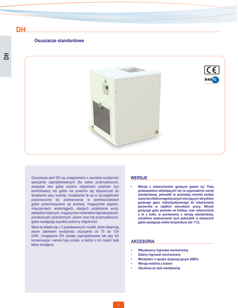 DH DH Osuszacze standardowe Osuszacze serii DH są urządzeniami o wysokiej wydajności specjalnie zaprojektowanymi dla celów przemysłowych, wszędzie tam gdzie poziom wilgotności powinien być kontrolowany lub gdzie nie powinno się dopuszczać do skraplania pary wodnej. Urządzenia te są w szczególności przeznaczone do zastosowania w pomieszczeniach gdzie przechowywane są archiwa, magazynów papieru, mleczarniach, wodociągach, stacjach uzdatniania wody, zakładów mięsnych, magazynów materiałów higroskopijnych, pomieszczeń podziemnych, piwnic oraz hal przemysłowych, gdzie występują wysokie poziomy wilgotności. Seria ta składa się z 3 podstawowych modeli, które obejmują swym zakresem wydajność osuszania od 75 do 124 l/24h. Urządzenia DH zostały zaprojektowane tak aby ich konserwacja i serwis były proste, a każda z ich części była łatwo dostępna. WERSJE • AKCESORIA • • • • • 1 Wersja z odszranianiem gorącym gazem (s): Poza podzespołami składającymi się na wyposażenie wersji standardowej, jednostki te posiadają również zestaw zaworów elektromagnetycznych sterujących wtryskiem gorącego gazu, wykorzystywanego do odszraniania parownika w ciężkich warunkach pracy. Wtrysk gorącego gazu pozwala na krótszy czas odszraniania a to z kolei, w porównaniu z wersją standardową, umożliwia zastosowanie tych jednostek w obszarach gdzie występują niskie temperatury (do 1°C). Wbudowany higrostat mechaniczny Zdalny higrostat mechaniczny Wentylator o sprężu dyspozycyjnym 200Pa Wersja mobilna z kołami Obudowa ze stali nierdzewnej Model DH 75 DH 75S DH1 00 DH 100S DH 120 DH 120S 75,1 75,1 93,7 93,7 124,0 124,0 Wydajność osuszania (1) l/24h Całkowity pobór mocy kW 1,3 1,3 1,6 1,6 1,8 1,8 A 5,9 5,9 6,8 6,8 7,4 7,4 (1) Maksymalny pobór prądu (1) m3/h 1000 1000 1000 1000 1200 1200 R407C R407C R407C R407C R407C R407C Pa 50 50 50 50 50 50 dB(A) 56 56 58 58 59 59 Zakres temperatury pracy °C 15-35 1-35 15-35 1-35 15-35 1-35 Zakres wilgotności pracy % 50-99 50-99 50-99 50-99 50-99 50-99 DH 100S DH 120 DH 120S Przepływ powietrza Czynnik chłodniczy Ciśnienie statyczne Ciśnienie akustyczne (2) Zasilanie V/Ph/Hz Model 230/1~/50 DH 75 DH 75S DH 100 Wbudowany higrostat mechaniczny Zdalny higrostat mechaniczny Wentylator o sprężu dyspozycyjnym 200 Pa Wersja mobilna z kołami Obudowa ze stali nierdzewnej Standard, B Opcja, - Niedostępne C A 1) 2) Mod. A (mm) B (mm) C (mm) Kg 75 100 120 770 770 770 550 550 550 570 570 570 68 75 79 Wydajności odnoszą się do następujących warunków: temperatura otoczenia 30°C; wilgotność względna 80%. Poziom ciśnienia akustycznego mierzony w odległości 1 m od urządzenia w wolnej przestrzeni zgodnie z ISO 9614. 2 www.hestor.pl DH DH DH DH RAMA Wszystkie jednostki DH wykonane są z grubej blachy ocynkowanej ogniowo, malowanej farbą proszkową poliuretanową w temperaturze 180°C dla zapewnienia najlepszej odporności na działanie czynników atmosferycznych. Rama jest konstrukcją samonośną z możliwością demontażu paneli. Taca skroplin stanowi wyposażenie każdej jednostki i wykonana jest ze stali nierdzewnej. Kolor jednostki: RAL 7035. UKŁAD CHŁODNICZY W jednostkach zastosowano czynnik chłodniczy R407C. Układ chłodniczy wykonano z zastosowaniem podzespołów wysokiej jakości oraz zgodnie z normą ISO 97/23 dotyczącą procedury spawania. Układ chłodtyczny zawór rozprężny z zewnętrznym wyrównaniem ciśnienia, zawory Schradera stosowane do kontroli i podczas przeglądów, zawór bezpieczeństwa (zgodnie z przepisami PED). SPRĘŻARKA Sprężarka rotacyjna z grzałką karteru i termicznym zabezpieczeniem przeciążeniowym Klixon wpiętym w uzwojenie silnika. Montowana na gumowych amortyzatorach drgań i na życzenie może być dostarcza z osłonami wygłuszającymi hałas (akcesoria). SKRAPLACZ I PAROWNIK Skraplacze i parowniki wykonane są z rur miedzianych i aluminiowych lameli. Średnica rur miedzianych wynosi 3/8”, a grubość aluminiowych lameli 0,1 mm. Dla poprawienia współczynnika wymiany ciepła, rury miedziane zostały mechanicznie rozszerzone i połączone z aluminiowymi lamelami. Geometria skraplaczy gwarantuje niski spadek ciśnienia powietrza, a tym samym umożliwia zastosowanie wentylatorów niskoobrotowych (z niską emisją dźwięku). Wszystkie jednostki posiadają tacę skroplin wykonaną ze stali nierdzewnej. Poza tym, każdy parownik dostarczany jest z czujnikiem temperatury wykorzystywanym jako automatyczna sonda przeciwzamarzaniowa. WENTYLATOR Zastosowano wentylatory promieniowe. Wentylatory są statycznie i dynamicznie wyważone i dostarczane z osłonami ochronnymi, zgodnie z dyrektywą EN 294. Montowane na ramie jednostki, nałożone na gumowe amortyzatory drgań. Silnik elektryczny jest 4 biegunowy (około 1500 obrotów na minutę). Podłączony do wentylatora za pomocą pasów i bloków i wyposażony w zintegrowane termiczne zabezpieczenie przeciążeniowe. Klasa zabezpieczenia silników – IP54. FILTR POWIETRZA Filtr stanowi standardowe wyposażenie naładowane elektrostatycznie. Można je EN 779:2002. MIKROPROCESOR Wszystkie jednostki DH wyposażone są standardowo w sterowanie mikroprocesorowe. Mikroprocesor steruje następującymi funkcjami: czas uruchomienia sprężarki, automatyczne cykle odszraniania oraz alarmy. Tryb pracy jednostki, punkty nastawy i alarmy prezentowane są na wyświetlaczu LCD. URZĄDZENIA STERUJĄCE I ZABEZPIECZENIA Wszystkie jednostki wyposażone są w następujące urządzenia sterujące i zabezpieczenia: termostat sterujący odszranianiem, który przesyła do sterownika mikroprocesorowego sygnał z informacją o konieczności uruchomienia cyklu odszraniania oraz steruje jego zakończeniem, presostat wysokiego ciśnienia z ręcznym resetem, presostat niskiego ciśnienia z automatycznym resetem, wysokociśnieniowy zawór bezpieczeństwa, termiczne zabezpieczenie przeciążeniowe sprężarki, termiczne zabezpieczenie przeciąż