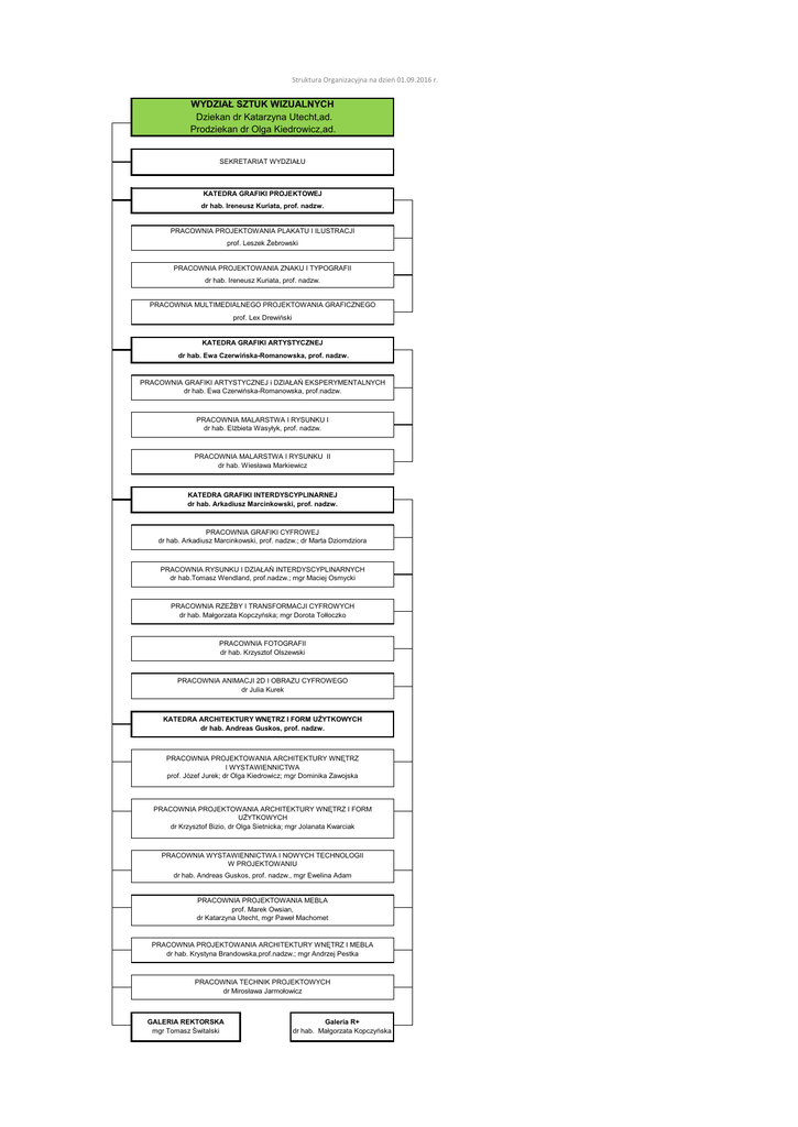 Struktura Organizacyjna na dzień 01.09.2016 r. WYDZIAŁ SZTUK WIZUALNYCH Dziekan dr Katarzyna Utecht,ad. Prodziekan dr Olga Kiedrowicz,ad. SEKRETARIAT WYDZIAŁU KATEDRA GRAFIKI PROJEKTOWEJ dr hab. Ireneusz Kuriata, prof. nadzw. PRACOWNIA PROJEKTOWANIA PLAKATU I ILUSTRACJI prof. Leszek Żebrowski PRACOWNIA PROJEKTOWANIA ZNAKU I TYPOGRAFII dr hab. Ireneusz Kuriata, prof. nadzw. PRACOWNIA MULTIMEDIALNEGO PROJEKTOWANIA GRAFICZNEGO prof. Lex Drewiński KATEDRA GRAFIKI ARTYSTYCZNEJ dr hab. Ewa Czerwińska-Romanowska, prof. nadzw. PRACOWNIA GRAFIKI ARTYSTYCZNEJ i DZIAŁAŃ EKSPERYMENTALNYCH dr hab. Ewa Czerwińska-Romanowska, prof.nadzw. PRACOWNIA MALARSTWA I RYSUNKU I dr hab. Elżbieta Wasyłyk, prof. nadzw. PRACOWNIA MALARSTWA I RYSUNKU II dr hab. Wiesława Markiewicz KATEDRA GRAFIKI INTERDYSCYPLINARNEJ dr hab. Arkadiusz Marcinkowski, prof. nadzw. PRACOWNIA GRAFIKI CYFROWEJ dr hab. Arkadiusz Marcinkowski, prof. nadzw.; dr Marta Dziomdziora PRACOWNIA RYSUNKU I DZIAŁAŃ INTERDYSCYPLINARNYCH dr hab.Tomasz Wendland, prof.nadzw.; mgr Maciej Osmycki PRACOWNIA RZEŹBY I TRANSFORMACJI CYFROWYCH dr hab. Małgorzata Kopczyńska; mgr Dorota Tołłoczko PRACOWNIA FOTOGRAFII dr hab. Krzysztof Olszewski PRACOWNIA ANIMACJI 2D I OBRAZU CYFROWEGO dr Julia Kurek KATEDRA ARCHITEKTURY WNĘTRZ I FORM UŻYTKOWYCH dr hab. Andreas Guskos, prof. nadzw. PRACOWNIA PROJEKTOWANIA ARCHITEKTURY WNĘTRZ I WYSTAWIENNICTWA prof. Józef Jurek; dr Olga Kiedrowicz; mgr Dominika Zawojska PRACOWNIA PROJEKTOWANIA ARCHITEKTURY WNĘTRZ I FORM UŻYTKOWYCH dr Krzysztof Bizio, dr Olga Sietnicka; mgr Jolanata Kwarciak PRACOWNIA WYSTAWIENNICTWA I NOWYCH TECHNOLOGII W PROJEKTOWANIU dr hab. Andreas Guskos, prof. nadzw., mgr Ewelina Adam PRACOWNIA PROJEKTOWANIA MEBLA prof. Marek Owsian, dr Katarzyna Utecht, mgr Paweł Machomet PRACOWNIA PROJEKTOWANIA ARCHITEKTURY WNĘTRZ I MEBLA dr hab. Krystyna Brandowska,prof.nadzw.; mgr Andrzej Pestka PRACOWNIA TECHNIK PROJEKTOWYCH dr Mirosława Jarmołowicz GALERIA REKTORSKA mgr Tomasz Świtalski Galeria R+ dr hab. Małgorzata Kopczyńska