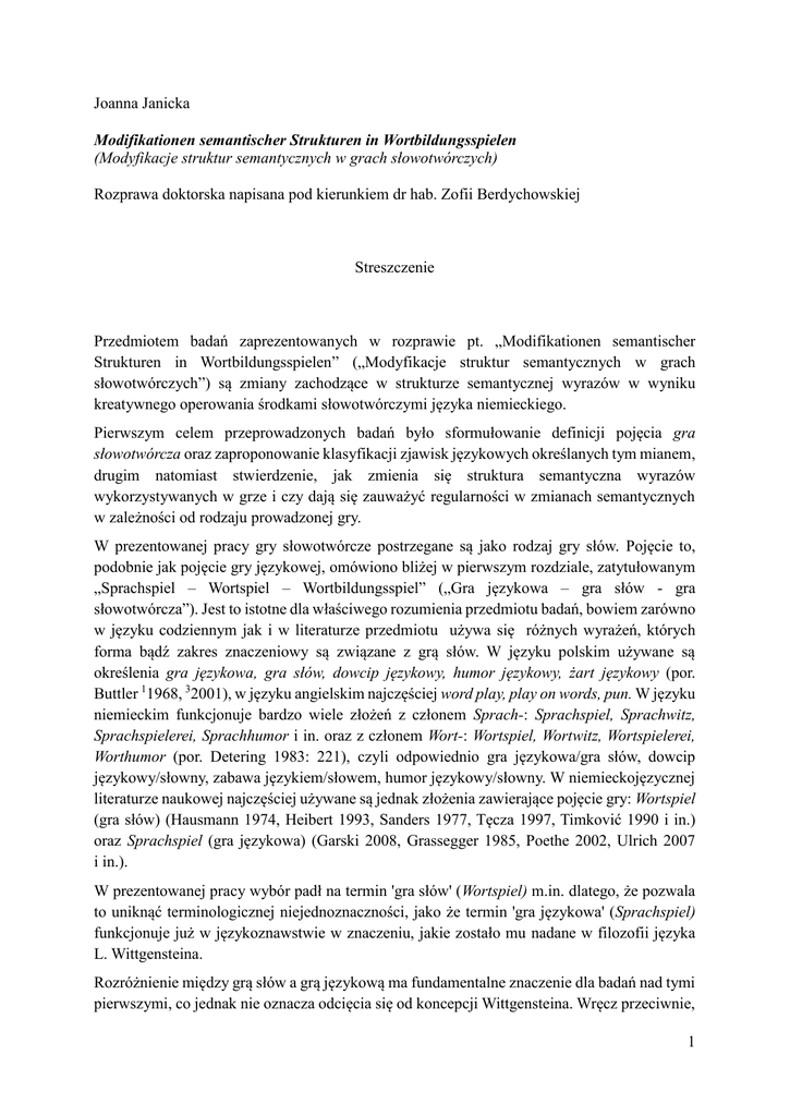 Joanna Janicka Modifikationen semantischer Strukturen in Wortbildungsspielen (Modyfikacje struktur semantycznych w grach słowotwórczych) Rozprawa doktorska napisana pod kierunkiem dr hab. Zofii Berdychowskiej Streszczenie Przedmiotem badań zaprezentowanych w rozprawie pt. „Modifikationen semantischer Strukturen in Wortbildungsspielen” („Modyfikacje struktur semantycznych w grach słowotwórczych”) są zmiany zachodzące w strukturze semantycznej wyrazów w wyniku kreatywnego operowania środkami słowotwórczymi języka niemieckiego. Pierwszym celem przeprowadzonych badań było sformułowanie definicji pojęcia gra słowotwórcza oraz zaproponowanie klasyfikacji zjawisk językowych określanych tym mianem, drugim natomiast stwierdzenie, jak zmienia się struktura semantyczna wyrazów wykorzystywanych w grze i czy dają się zauważyć regularności w zmianach semantycznych w zależności od rodzaju prowadzonej gry. W prezentowanej pracy gry słowotwórcze postrzegane są jako rodzaj gry słów. Pojęcie to, podobnie jak pojęcie gry językowej, omówiono bliżej w pierwszym rozdziale, zatytułowanym „Sprachspiel – Wortspiel – Wortbildungsspiel” („Gra językowa – gra słów - gra słowotwórcza”). Jest to istotne dla właściwego rozumienia przedmiotu badań, bowiem zarówno w języku codziennym jak i w literaturze przedmiotu używa się różnych wyrażeń, których forma bądź zakres znaczeniowy są związane z grą słów. W języku polskim używane są określenia gra językowa, gra słów, dowcip językowy, humor językowy, żart językowy (por. Buttler 11968, 32001), w języku angielskim najczęściej word play, play on words, pun. W języku niemieckim funkcjonuje bardzo wiele złożeń z członem Sprach-: Sprachspiel, Sprachwitz, Sprachspielerei, Sprachhumor i in. oraz z członem Wort-: Wortspiel, Wortwitz, Wortspielerei, Worthumor (por. Detering 1983: 221), czyli odpowiednio gra językowa/gra słów, dowcip językowy/słowny, zabawa językiem/słowem, humor językowy/słowny. W niemieckojęzycznej literaturze naukowej najczęściej używane są jednak złożenia zawierające pojęcie gry: Wortspiel (gra słów) (Hausmann 1974, Heibert 1993, Sanders 1977, Tęcza 1997, Timković 1990 i in.) oraz Sprachspiel (gra językowa) (Garski 2008, Grassegger 1985, Poethe 2002, Ulrich 2007 i in.). W prezentowanej pracy wybór padł na termin 'gra słów' (Wortspiel) m.in. dlatego, że pozwala to uniknąć terminologicznej niejednoznaczności, jako że termin 'gra językowa' (Sprachspiel) funkcjonuje już w językoznawstwie w znaczeniu, jakie zostało mu nadane w filozofii języka L. Wittgensteina. Rozróżnienie między grą słów a grą językową ma fundamentalne znaczenie dla badań nad tymi pierwszymi, co jednak nie oznacza odcięcia się od koncepcji Wittgensteina. Wręcz przeciwnie, 1 jego użytkowa teoria znaczenia stanowi odpowiednie tło dla dociekań nad istotą gier słowotwórczych. Dwa aspekty filozofii Wittgensteina odgrywają w tym kontekście szczególnie ważną rolę. Pierwszy to przekonanie filozofa o tym, że znaki językowe zyskują znaczenie nie przez relację do obiektów rzeczywistości, lecz przez użycie w konkretnym kontekście komunikacyjnym (por. Wittgenstein 1989: 416). Dla badań nad grami słowotwórczymi poglądy filozofa mają o tyle znaczenie, że gry te są uwarunkowane przez kontekst: nie są elementami systemu językowego, czyli langue, lecz elementami parole. Konkretny kontekst umożliwia ich konstruowanie i właściwą interpretację. Innymi słowy: gry słowotwórcze powstają w ramach gier językowych. Drugim ważnym czynnikiem jest podkreślenie roli reguł w komunikacji. Wittgenstein dowodzi, że dopiero ich istnienie i przestrzeganie czyni komunikację możliwą (por. Wittgenstein 1989: 311). Jednocześnie wskazuje, że mogą zdarzać się sytuacje, w których reguły są łamane, a wyrażenia językowe używane inaczej, niż uczestnicy komunikacji by się spodziewali czy oczekiwali. Skonstruowanie gry słów lub gry słowotwórczej to nic innego jak takie właśnie niespodziewane, zaskakujące użycie wyrażeń językowych, wykraczające poza reguły. Grę słów rozumiem w oparciu o prace Hausmanna (1974), Heiberta (1993) i Tęczy (1997) jako zamierzone odstępstwo od normy językowej, w wyniku którego środkami języka przedmiotowego zostaje sformułowana informacja o systemie językowym. Informacja ta może dotyczyć identyczności lub podobieństwa wyrażeń, ale i innych aspektów języka. Dzięki takiemu ujęciu termin gra słów nie jest ograniczony do konstrukcji językowych wykorzystujących homonimię lub paronimię wyrażeń, jak ma to miejsce w przypadku wielu wcześniejszych definicji, lecz obejmuje swym zakresem również gry materiałem językowym oparte na innej relacji pomiędzy formą a znaczeniem wyrażeń. Zawsze jednak gry oparte na identyczności lub podobieństwie form językowych stanowią trzon zjawisk określanych mianem gry słów. Dalszą część rozdziału pierwszego stanowi przedstawienie różnych typów gry słów. Prezentacja ta nie rości sobie prawa do miana kompletnej ani wyczerpującej, raczej ma charakter krótkiego przeglądu, celem pracy nie jest bowiem stworzenie nowej typologii gier słów, jako że istnieje ich już wiele. Przedstawiona w rozdziale pierwszym typologia, poparta przykładami, ma jedynie przygotować grunt pod zajęcie się właściwym tematem pracy, czyli grami słowotwórczymi. Samym grom słowotwórczym poświęcony jest rozdział drugi. Jego pierwsza część to prezentacja stanu badań nad omawianym zagadnieniem, ze zwróceniem uwagi na fakt, że termin Wortbildungsspiel (gra słowotwórcza), poza nielicznymi wyjątkami, prawie nie występuje w literaturze fachowej, a dla określanych nim w niniejszej pracy efektów kreatywności słowotwórczej używane są albo terminy o szerszym zakresie (dowcip słowotwórczy / Wortbildungswitz), albo terminy ujmujące ty