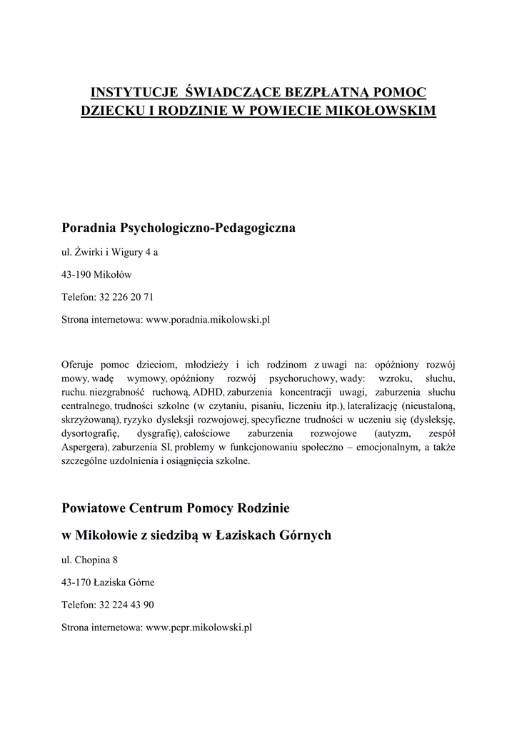 INSTYTUCJE ŚWIADCZĄCE BEZPŁATNĄ POMOC DZIECKU I RODZINIE W POWIECIE MIKOŁOWSKIM Poradnia Psychologiczno-Pedagogiczna ul. Żwirki i Wigury 4 a 43-190 Mikołów Telefon: 32 226 20 71 Strona internetowa: www.poradnia.mikolowski.pl Oferuje pomoc dzieciom, młodzieży i ich rodzinom z uwagi na: opóźniony rozwój mowy, wadę wymowy, opóźniony rozwój psychoruchowy, wady: wzroku, słuchu, ruchu. niezgrabność ruchową, ADHD, zaburzenia koncentracji uwagi, zaburzenia słuchu centralnego, trudności szkolne (w czytaniu, pisaniu, liczeniu itp.), lateralizację (nieustaloną, skrzyżowaną), ryzyko dysleksji rozwojowej, specyficzne trudności w uczeniu się (dysleksję, dysortografię, dysgrafię), całościowe zaburzenia rozwojowe (autyzm, zespół Aspergera), zaburzenia SI, problemy w funkcjonowaniu społeczno – emocjonalnym, a także szczególne uzdolnienia i osiągnięcia szkolne. Powiatowe Centrum Pomocy Rodzinie w Mikołowie z siedzibą w Łaziskach Górnych ul. Chopina 8 43-170 Łaziska Górne Telefon: 32 224 43 90 Strona internetowa: www.pcpr.mikolowski.pl PCPR zajmuje się m.in. opracowaniem i realizacją powiatowego programu przeciwdziałania przemocy w rodzinie, ochroną ofiar przemocy w rodzinie oraz opracowaniem i realizacją programów oddziaływań korekcyjno-edukacyjnych dla osób stosujących przemoc w rodzinie. Oferuje możliwość terapii dla rodzin z problemem przemocy. Wspiera również rodziny zastępcze. Ośrodek Interwencji Kryzysowej ul. Chopina 8 43-170 Łaziska Górne Telefon: 32 224 43 90 Strona internetowa: www.pcpr.mikolowski.pl Ośrodek Interwencji Kryzysowej zajmuje się zapewnieniem kompleksowej pomocy psychologicznej dla osób i rodzin w sytuacji kryzysu psychologicznego poprzez udzielanie wsparcia, prowadzenie interwencji kryzysowych oraz terapii indywidualnej i rodzinnej. Prowadzi również specjalistyczne poradnictwo prawne dla osób w sytuacji kryzysu. Mikołowskie Stowarzyszenie Pomocy Psychospołecznej i Profilaktyki „Zmiana” ul. Krakowska 30 43-190 Mikołów Telefon: 32 226 41 76 Strona internetowa: www.zmiana-mikolow.pl Stowarzyszenie prowadzi działalność w zakresie świadczenia pomocy psychologicznej i terapeutycznej dla osób i rodzin uwikłanych w przemoc domową oraz osób uzależnionych od alkoholu lub innych środków psychoaktywnych i ich rodzin. Świadczona jest też pomoc psychologiczna dla osób i rodzin znajdujących się w sytuacjach kryzysowych. Można tu także uzyskać poradę w zakresie prawa rodzinnego i karnego. Ośrodek Wczesnej Interwencji ul. Słowackiego 21c 43-190 Mikołów Telefon: 32 226 22 64 Strona internetowa: www.psouu.mikolow.iap.pl Ośrodek Interwencji Kryzysowej podejmuje działania na rzecz lepszego psychoruchowego i społecznego rozwoju dzieci oraz zapobieganie pogłębianiu się ich niepełnosprawności, a także postępowanie podtrzymujące i edukacyjne w stosunku do rodzin. Działania te realizowane są poprzez ustalenie wielospecjalistycznej diagnozy: lekarskiej, psychologicznej, sprawności ruchowej, form komunikowania się, w tym rozwoju mowy oraz poziomu funkcjonowania społecznego, a także opracowywanie szczegółowego, wielospecjalistycznego programu postępowania w każdej sferze rozwoju dziecka. Ośrodek Terapii Nerwic dla Dzieci i Młodzieży w Orzeszu ul. Mikołowska 208 43-187 Orzesze Telefon: 32 326 08 58 Strona internetowa: www.otnorzesze.pl Ośrodek jest specjalistyczną placówką medyczną zajmującą się kompleksową diagnozą i terapią pacjentów z wybranymi problemami emocjonalnymi. Zajmuje się leczeniem zaburzeń lękowych, adaptacyjnych, separacyjnych, fobii szkolnej, zaburzeń depresyjnych i dysocjacyjnych, zaburzeń stresowych i pourazowych, natręctw, tików, moczenia, mutyzmu i uzależnienia od komputera. Oferuje terapię indywidualną oraz grupową, a także liczne dodatkowe zajęcia terapeutyczne,m.in. hipoterapię, dogoterapię. NZOZ Centrum Opieki Psychiatrycznej i Psychologicznej „Psyche-Med” ul. Waryńskiego 4 43-190 Mikołów Telefon: 32 322 20 24 W Centrum działa Poradnia Zdrowia Psychicznego dla dzieci i młodzieży zajmująca się: - diagnozą psychiatryczną i psychologiczną, - leczeniem psychiatrycznym, - psychoterapią indywidualną i rodzinną. Stowarzyszenie „Siloe” ul. Krakowska 7/3 43-190 Mikołów Telefon: 692 063 683 Strona internetowa: www.siloe.edu.pl Celem działalności Stowarzyszenia jest pomoc rodzinom wielodzietnym, niepełnym z różnymi problemami i ich dzieciom. Stowarzyszenie organizuje pomoc w nauce, bezpłatne korepetycje, wyjazdy kolonijne, wycieczki, wypoczynek letni i pomoc materialną dla dzieci. Stowarzyszenie Na Rzecz Poradnictwa Obywatelskiego „Dogma” ul. Żwirki i Wigury 4a 43-190 Mikołów Telefon: 32 324 82 59 Strona internetowa: www.dogma.org.pl Jednym z obszarów działania Stowarzyszenia jest umożliwienie dostępu do bezpłatnego poradnictwa prawnego poprzez zapewnienie ciągłego funkcjonowania Biura Bezpłatnych Porad Prawnych i Obywatelskich. Są tam udzielane informacje o tym, jakie prawa szukającym osobom przysługują i jakie są sposoby rozwiązywania problemów, a także wspólne opracowywanie planu działania. Miejski Ośrodek Wspierania Rodziny i Dziecka w Łaziskach Górnych ul. Wyszyńskiego 8 43-173 Łaziska Górne Telefon: 32 721 89 10 Strona internetowa: www.mowrid.laziska.pl Ośrodek udziela wsparcia rodzinom borykającym się z różnorakimi kryzysami, a także rodzinom pragnącym jak najlepiej wypełniać zadania w obszarze rodzicielstwa, dążącym do zrozumienia swych dzieci na różnych etapach ich rozwoju. Ośrodek świadczy pomoc poprzez poradnictwo, edukację, asystę rodzinną oraz prowadzenie placówki wsparcia dziennego. INSTYTUCJE SPOZA POWIATU MIKOŁOWSKIEGO Ośrodek medyczno-terapeutyczny „Syriusz” NZOZ Oddział Żory Al. Wojska Polskiego 3c 44-240 Żory Telefon: 32 723 12 74, 666 379 004 Strona internetowa: zory.nzozsyriusz.pl Oddział Rybnik ul. Borki 20 44-203 Rybnik Telefon: 3