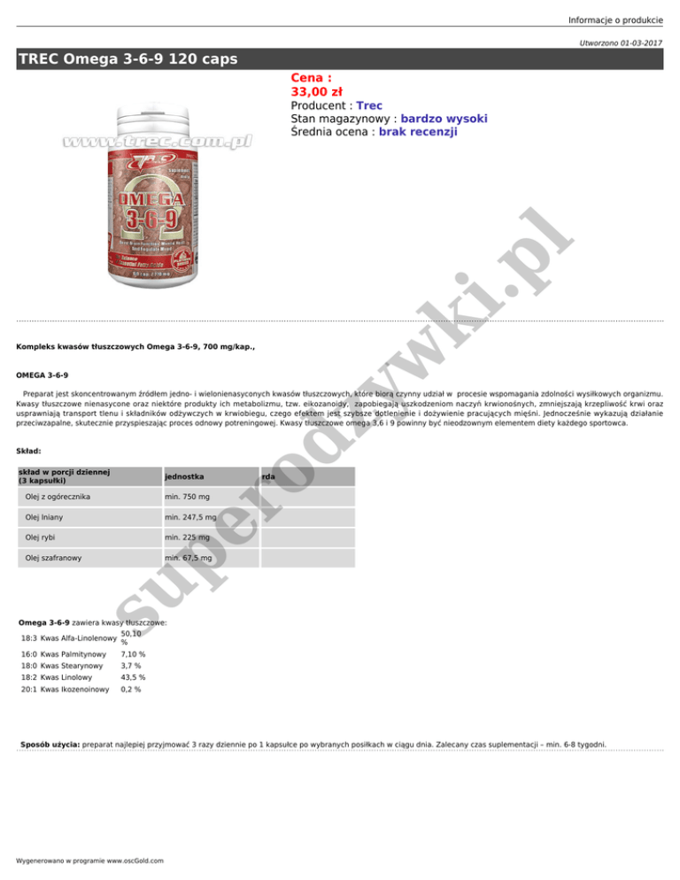 Informacje o produkcie Utworzono 01-03-2017 TREC Omega 3-6-9 120 caps Cena : 33,00 zł ki .p l Producent : Trec Stan magazynowy : bardzo wysoki Średnia ocena : brak recenzji w Kompleks kwasów tłuszczowych Omega 3-6-9, 700 mg/kap., ro dz y OMEGA 3-6-9 Preparat jest skoncentrowanym źródłem jedno- i wielonienasyconych kwasów tłuszczowych, które biorą czynny udział w procesie wspomagania zdolności wysiłkowych organizmu. Kwasy tłuszczowe nienasycone oraz niektóre produkty ich metabolizmu, tzw. eikozanoidy, zapobiegają uszkodzeniom naczyń krwionośnych, zmniejszają krzepliwość krwi oraz usprawniają transport tlenu i składników odżywczych w krwiobiegu, czego efektem jest szybsze dotlenienie i dożywienie pracujących mięśni. Jednocześnie wykazują działanie przeciwzapalne, skutecznie przyspieszając proces odnowy potreningowej. Kwasy tłuszczowe omega 3,6 i 9 powinny być nieodzownym elementem diety każdego sportowca. Skład: skład w porcji dziennej (3 kapsułki) jednostka min. 750 mg Olej lniany min. 247,5 mg Olej rybi pe Olej z ogórecznika rda min. 225 mg min. 67,5 mg su Olej szafranowy Omega 3-6-9 zawiera kwasy tłuszczowe: 18:3 Kwas Alfa-Linolenowy 50,10 % 16:0 Kwas Palmitynowy 7,10 % 18:0 Kwas Stearynowy 3,7 % 18:2 Kwas Linolowy 43,5 % 20:1 Kwas Ikozenoinowy 0,2 % Sposób użycia: preparat najlepiej przyjmować 3 razy dziennie po 1 kapsułce po wybranych posiłkach w ciągu dnia. Zalecany czas suplementacji – min. 6-8 tygodni. Wygenerowano w programie www.oscGold.com